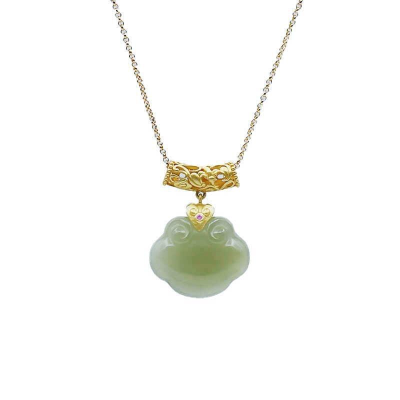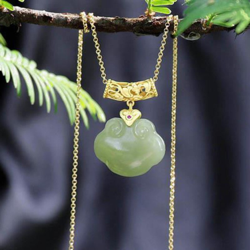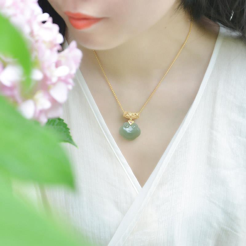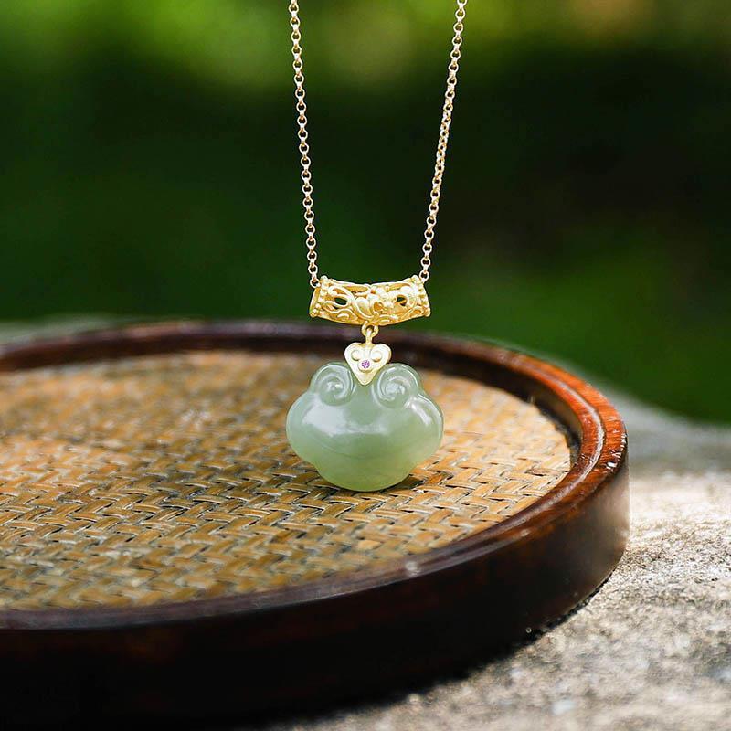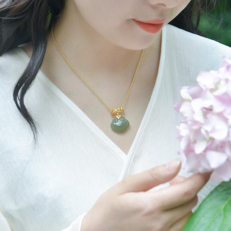 Chains Necklaces-Ancient gold craft natural Hetian jade vintage auspicious cloud necklace pendant fresh and ethnic style Style: Classic