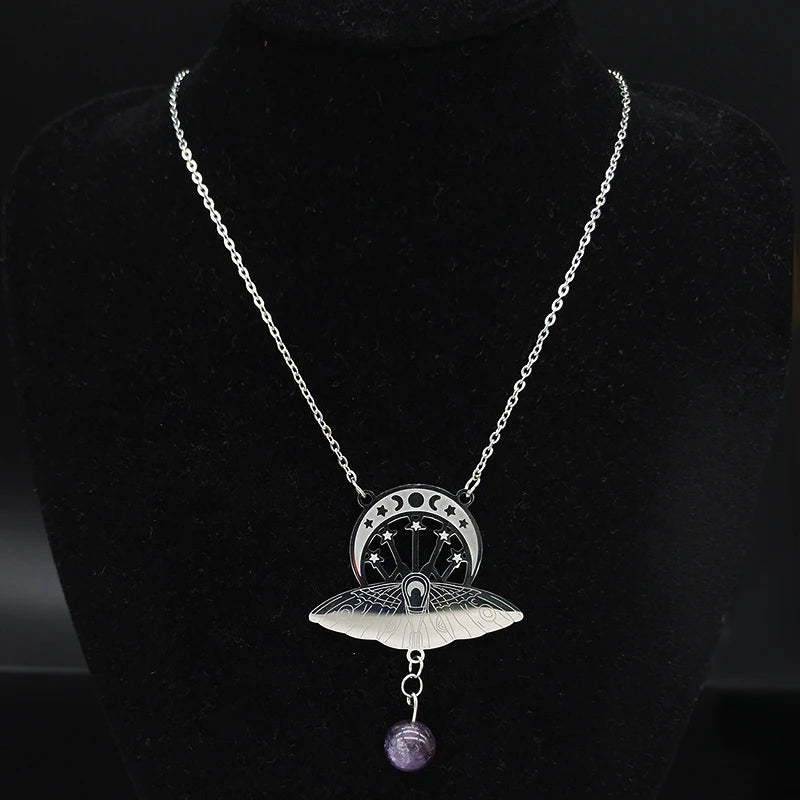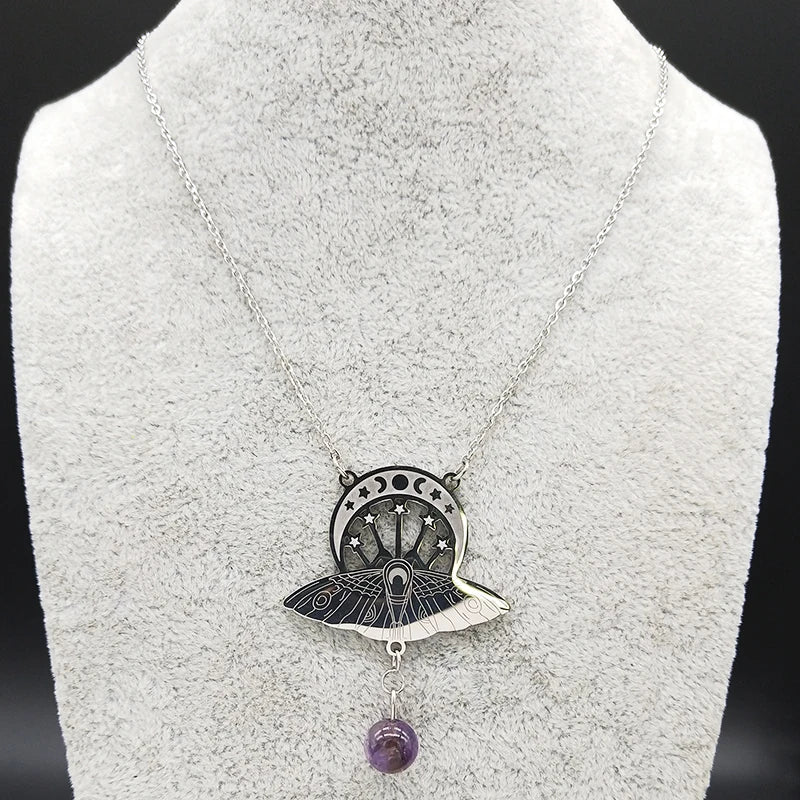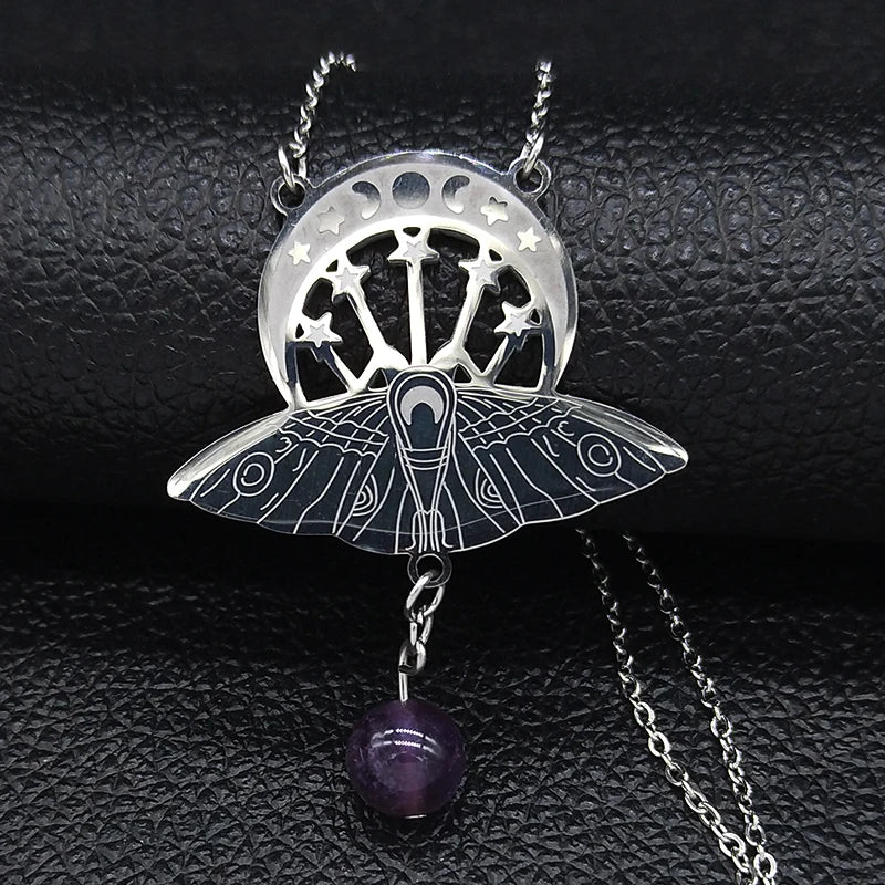 Bat Witchcraft Triple Moon Goddess Stainless Steel Statement Necklace Women Silver Color Moth Necklace Jewerly collar mujer