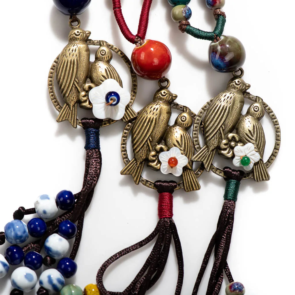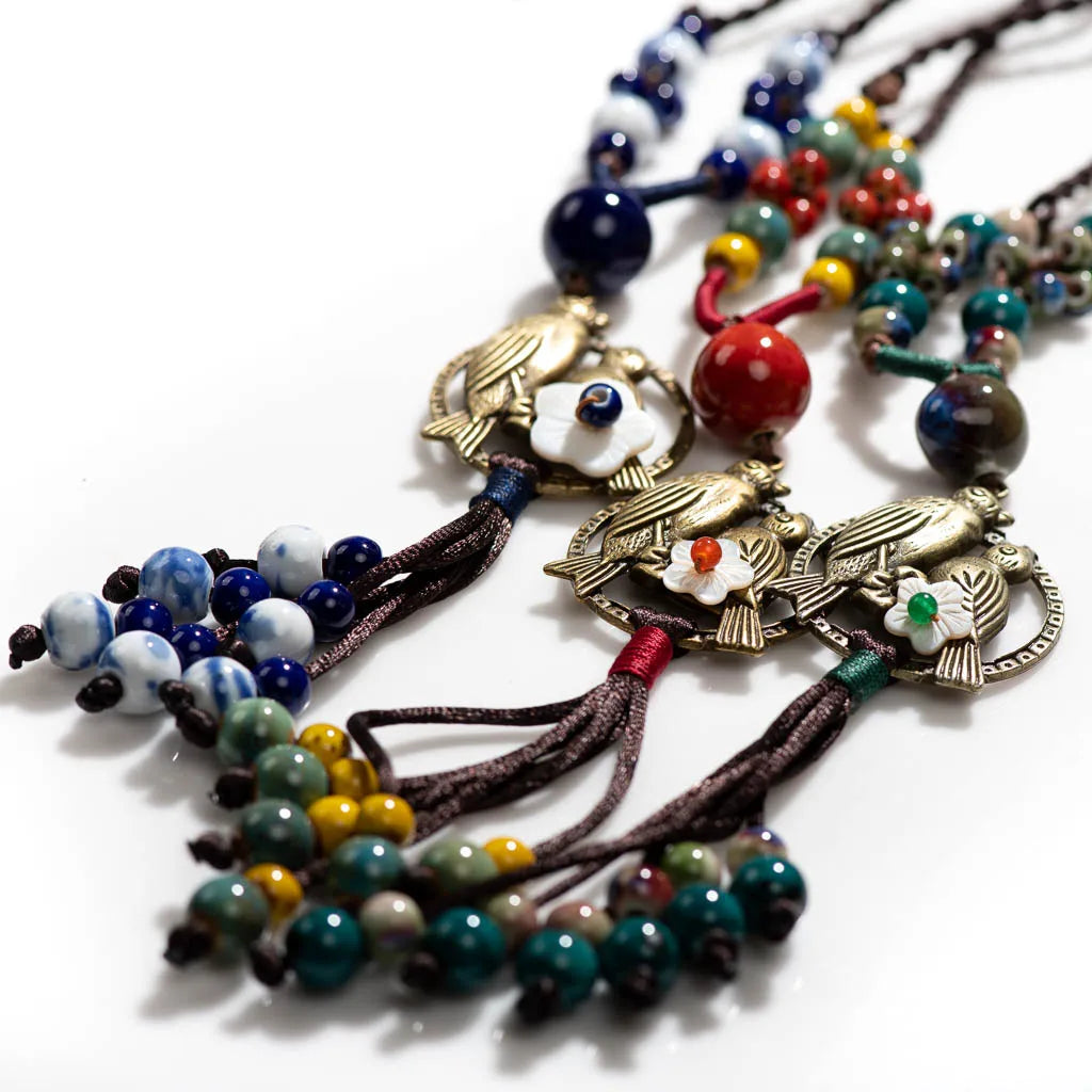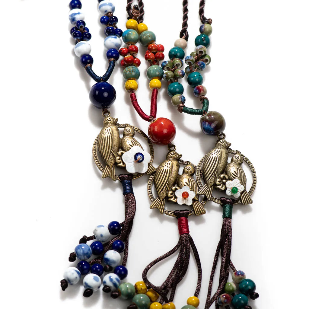 Bohemian Vintage Handmade Two Birds Necklace Ceramic Beads Adjustable Pendant