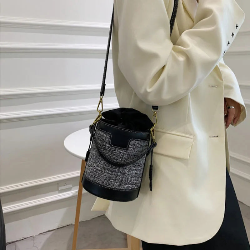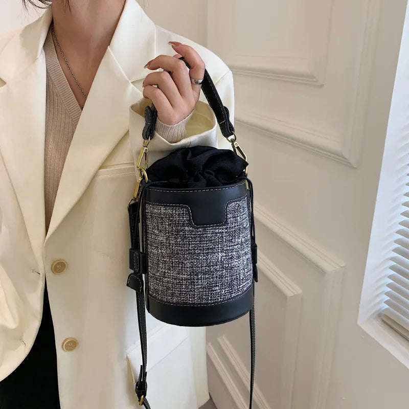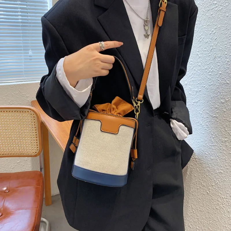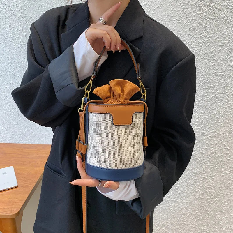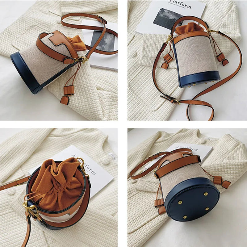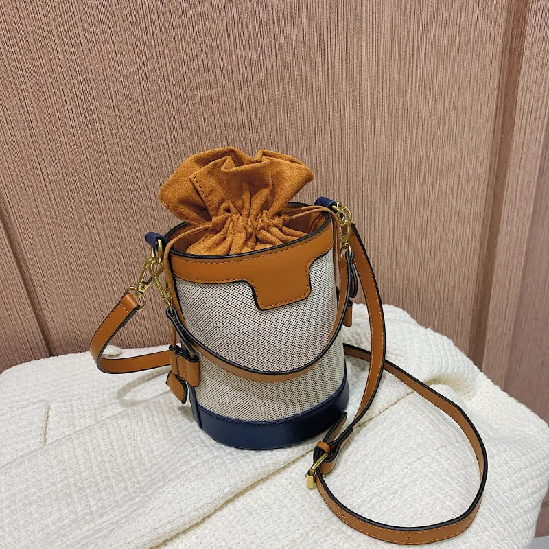 Canvas Leather Contrast Ladies Handbags Fashion Shoulder Bucket Bag Versatile Mobile Purse Storage Trend Cylindrical Crossbody