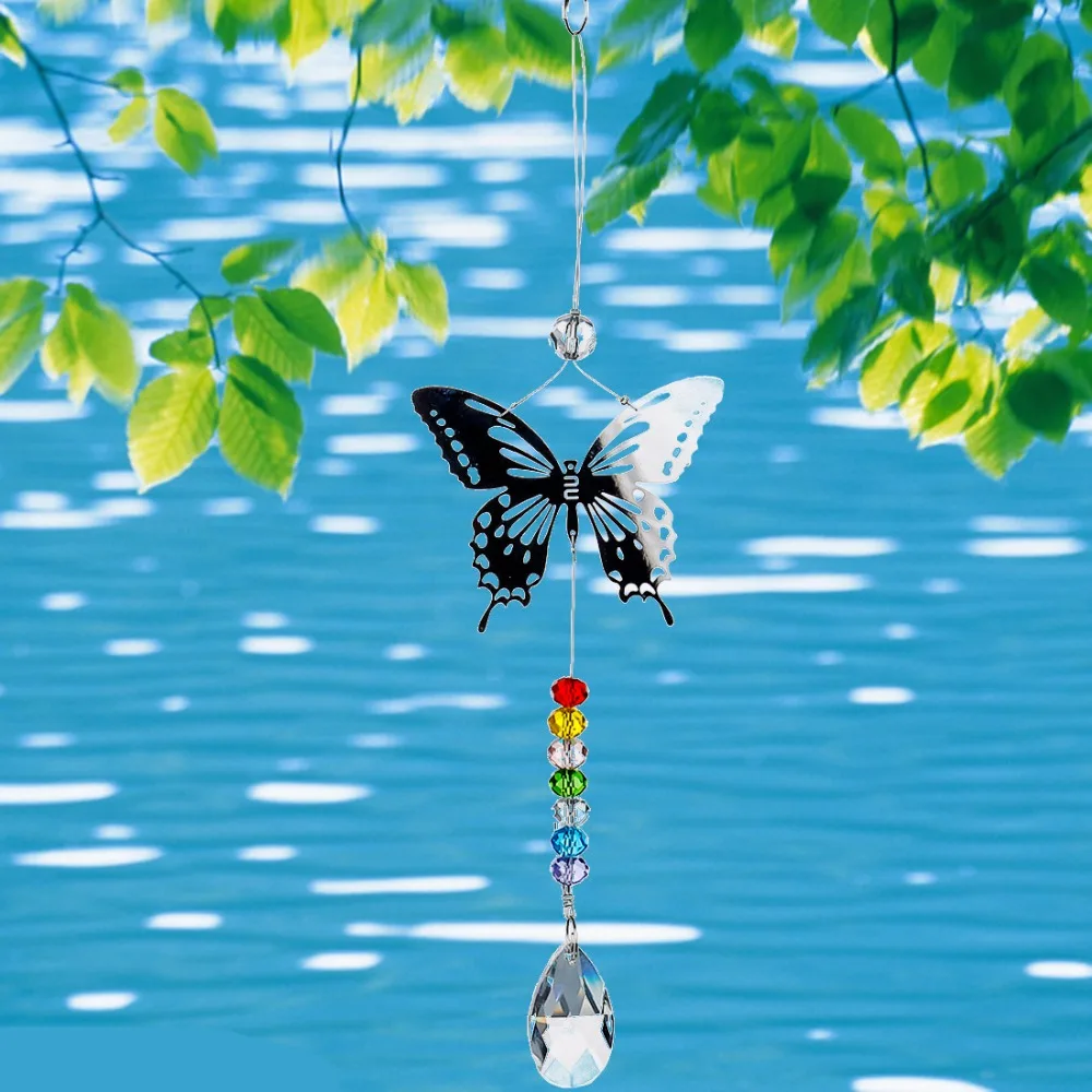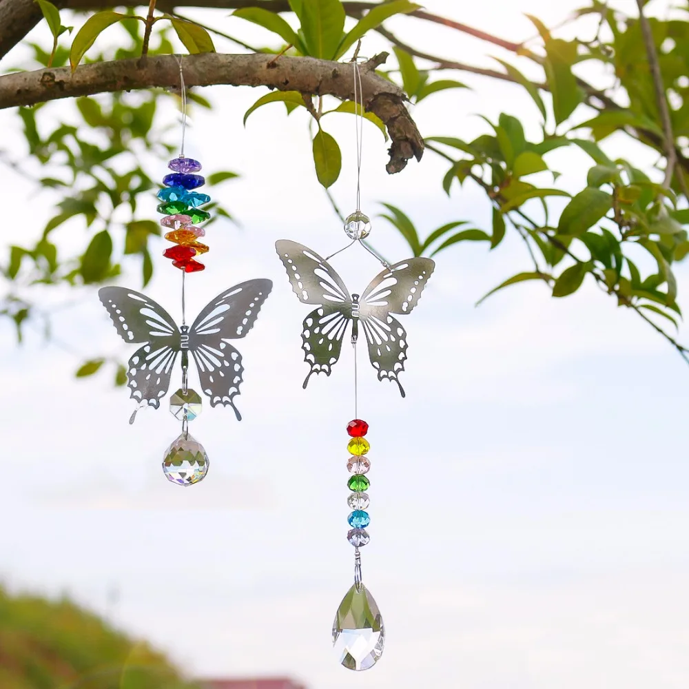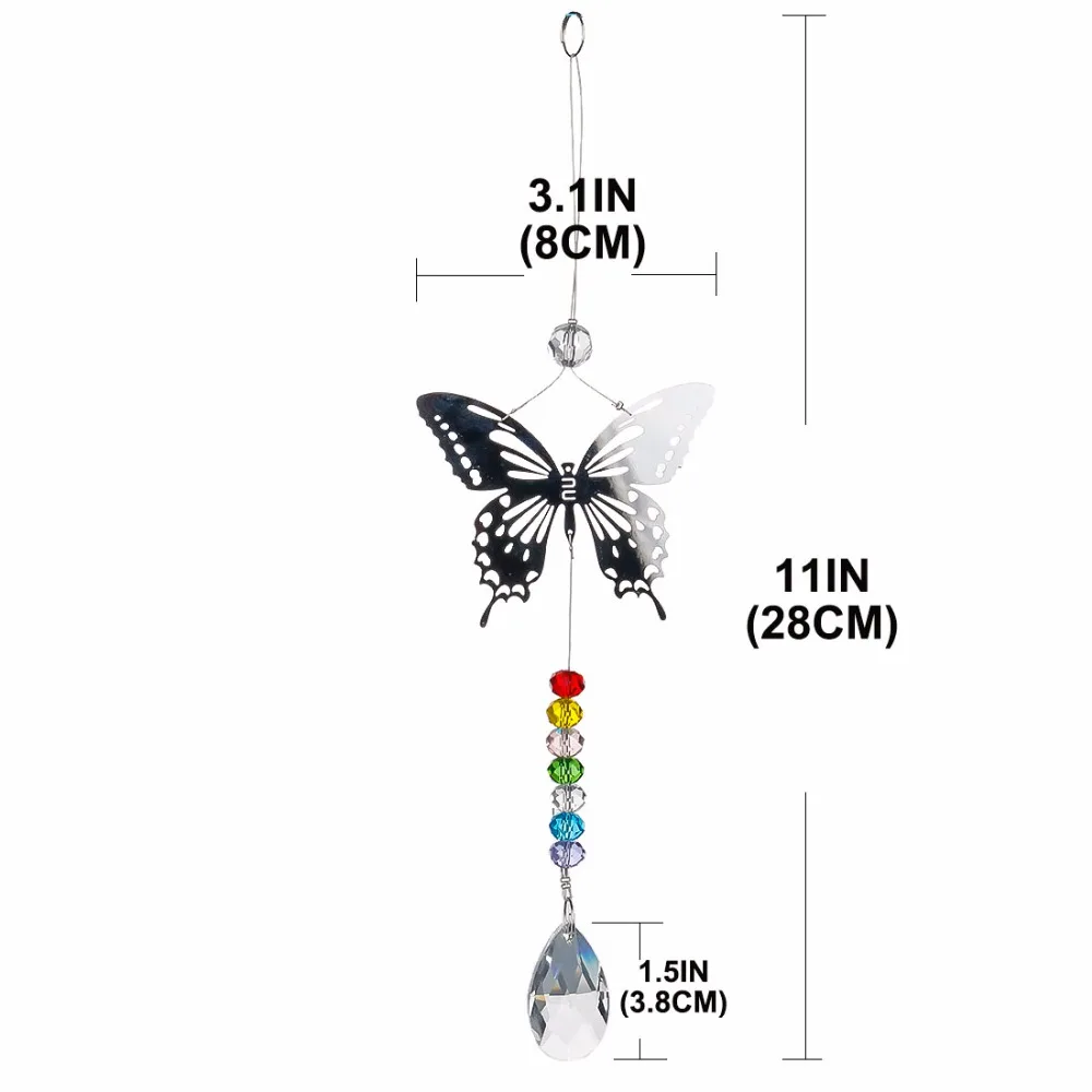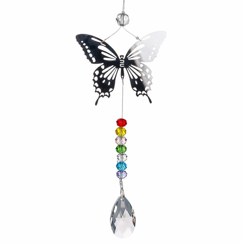 A butterfly sun catcher featuring colorful,spiritual chakra stones with a small reflective ornament that creates sparking colors. These can be hung in various locations indoors near windows to “catch the light”.The light then dispersed into light flecks and rainbow-like colors that spread around the room and dance along the walls.
