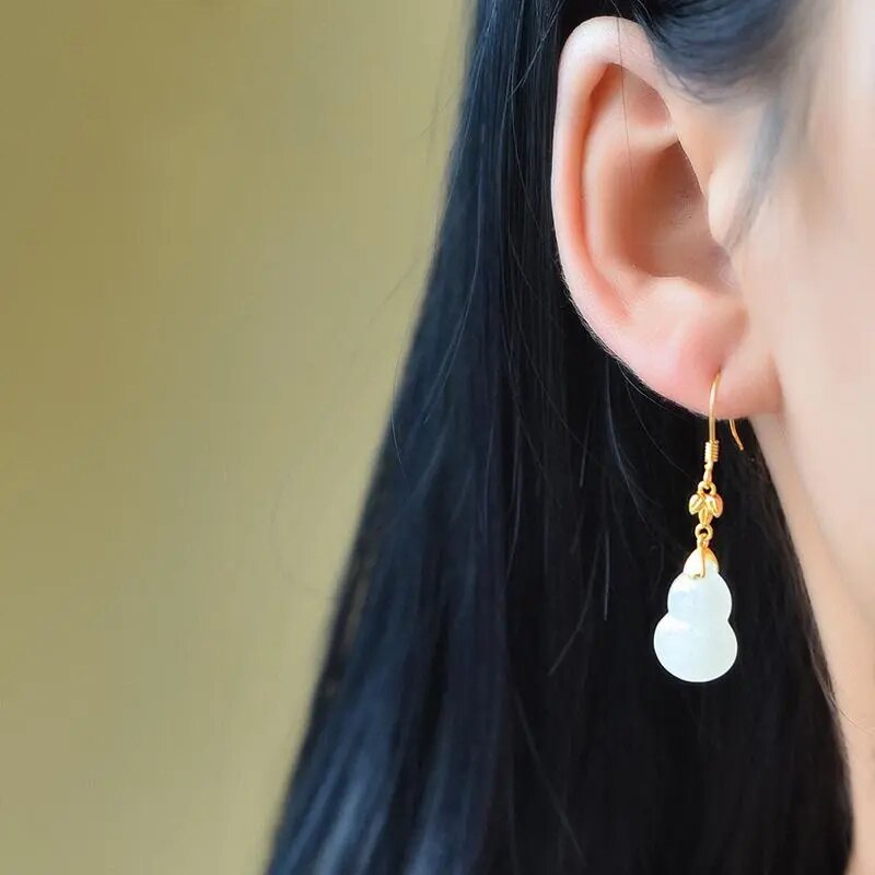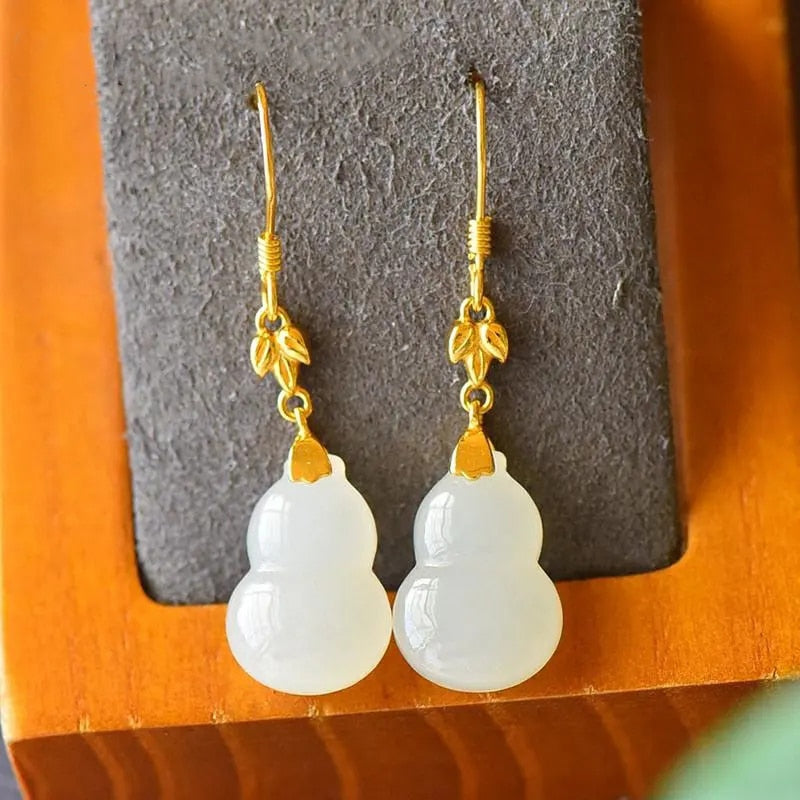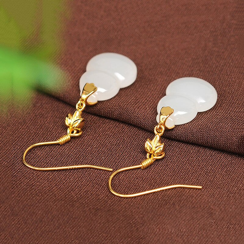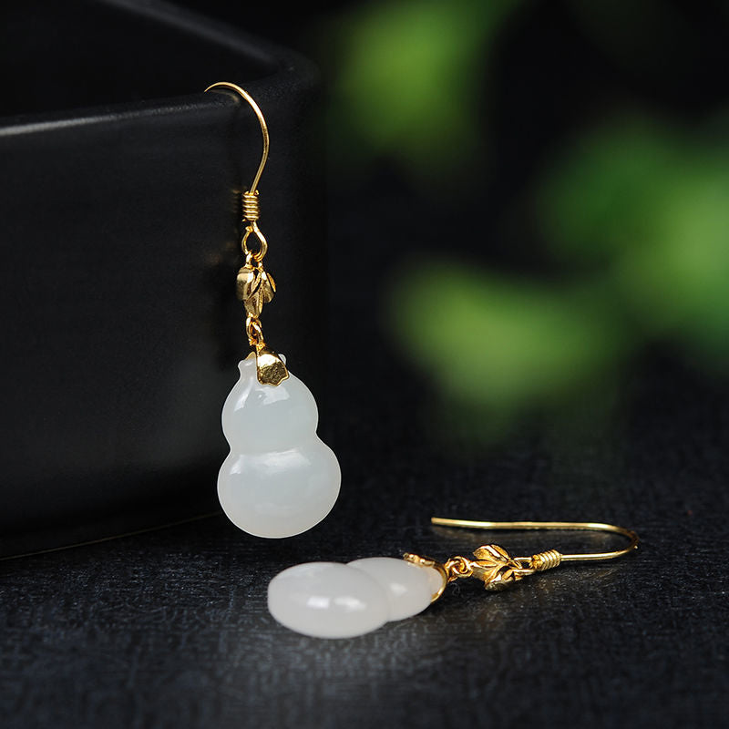 Classic Design Ancient Method Gold Craft Leaf Natural Hetian Jade Gourd Long Earrings