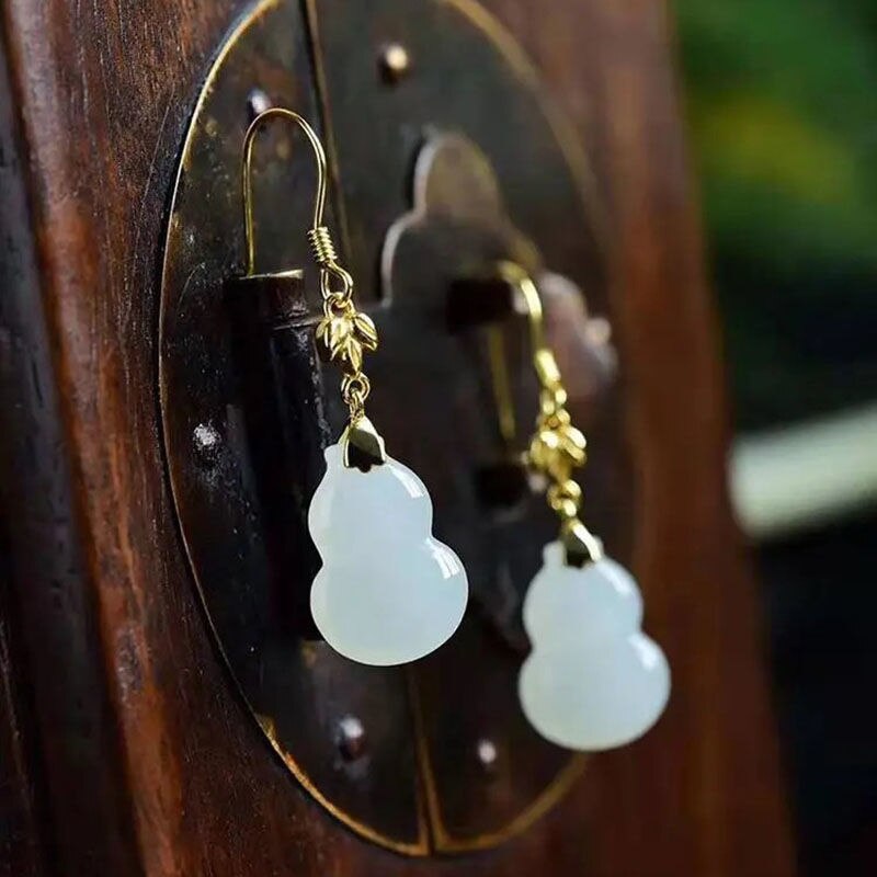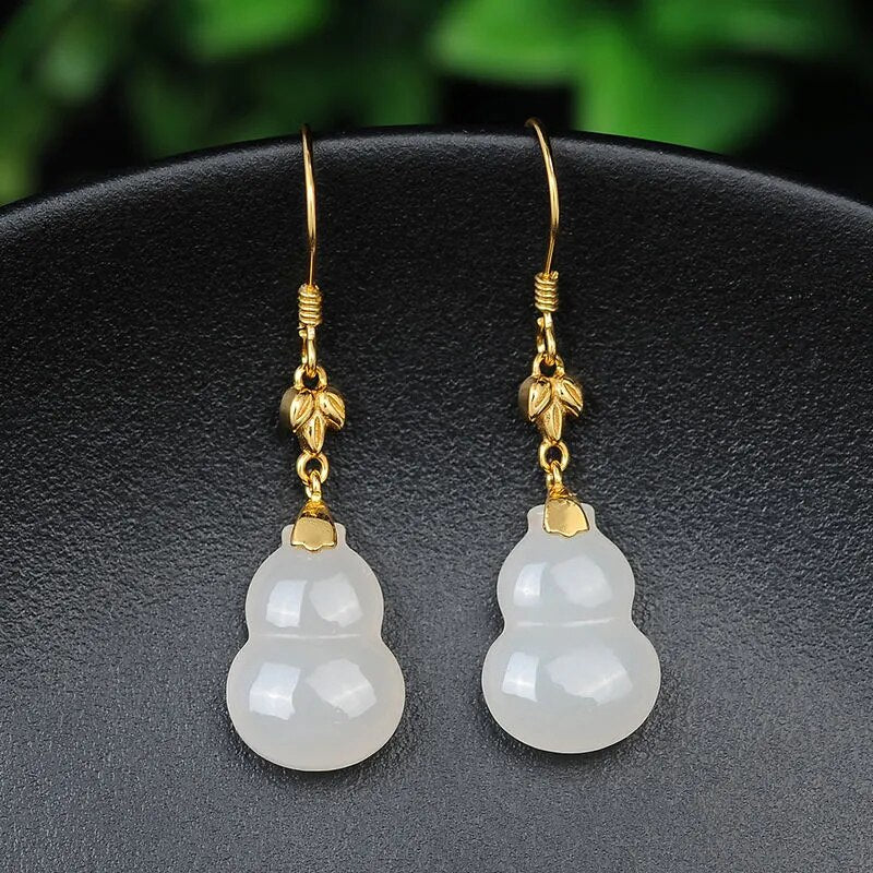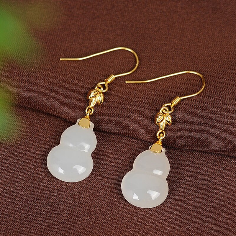 Drop Earrings-Classic Design Ancient Method Gold Craft Leaf Natural Hetian Jade Gourd Long Earrings Exquisite Elegant Charm Jewelry For Women