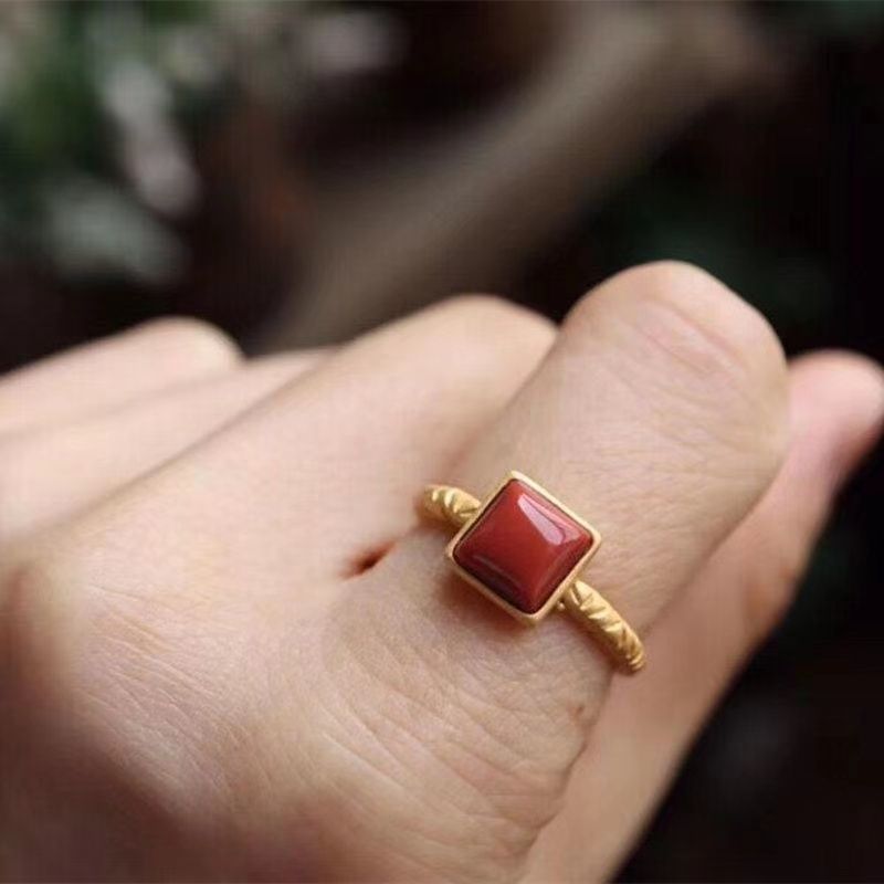 Cocktail Ring-Classic Design Inlaid Natural Southern Red Tourmaline Square Adjustable Ring Vintage Simple Creative Women's Jewelry