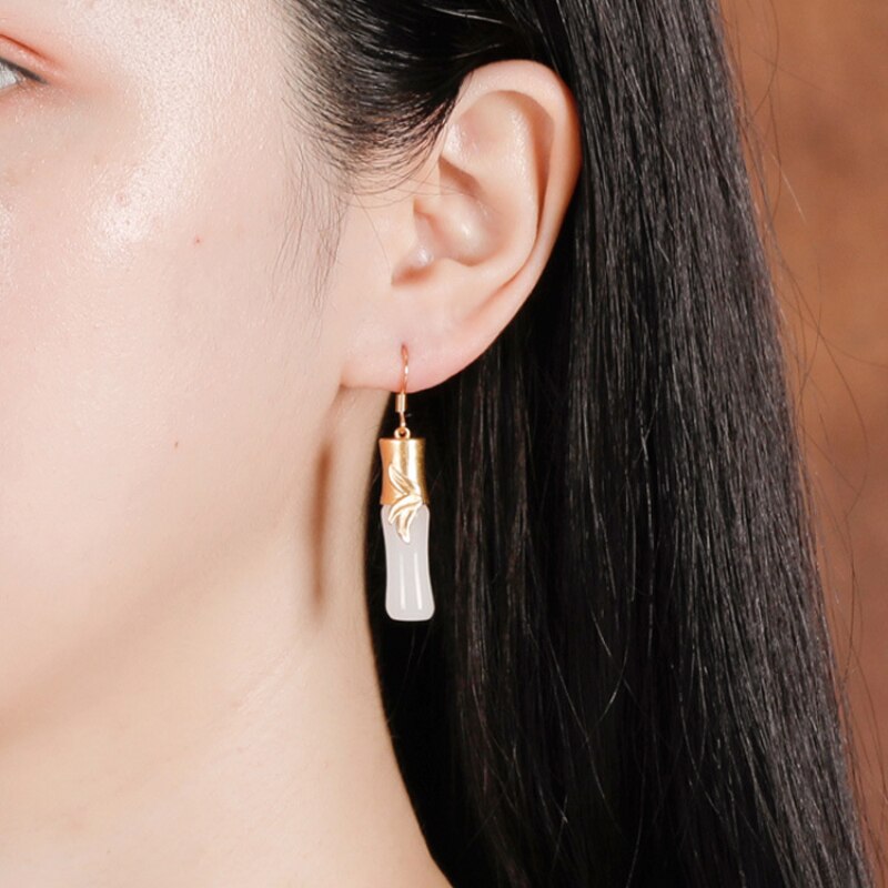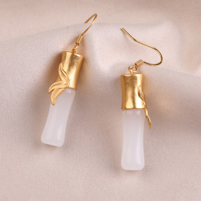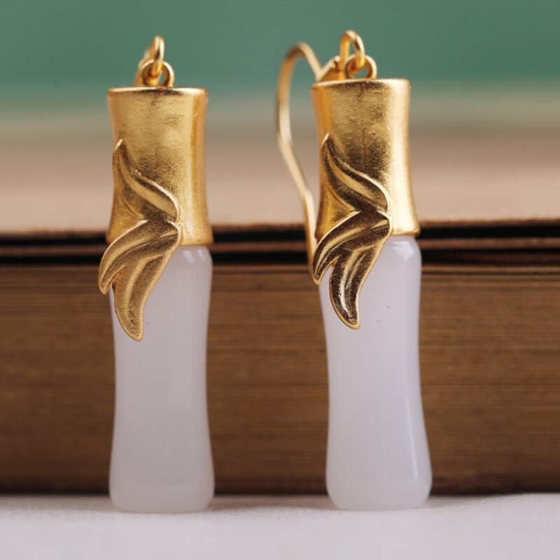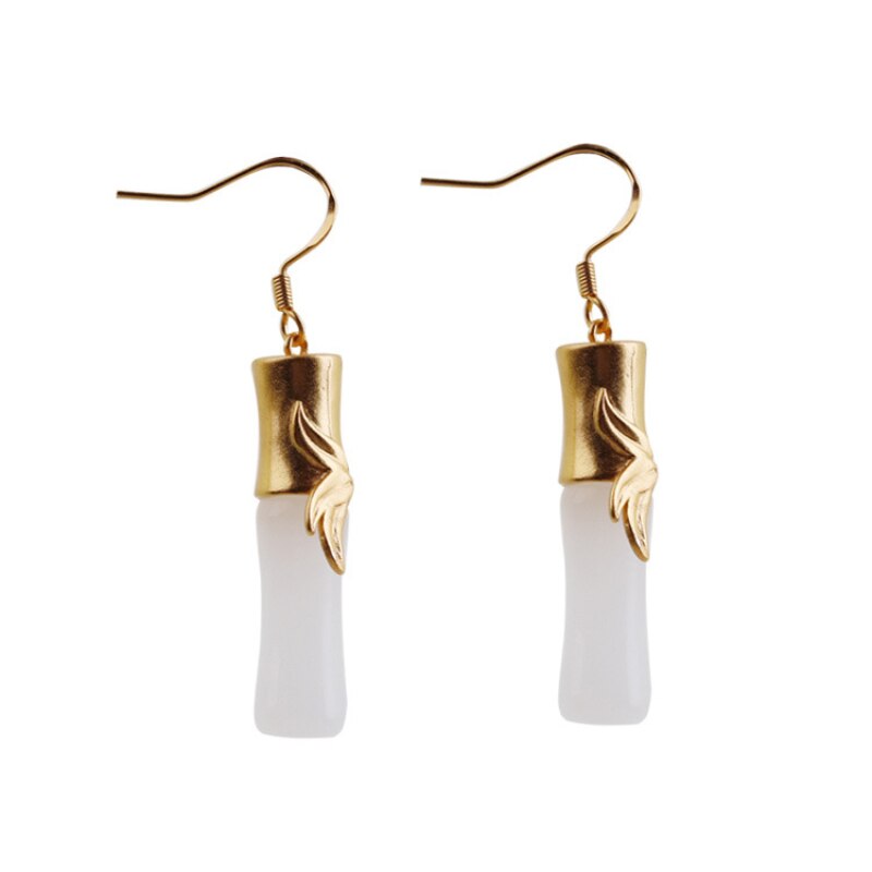 Drop Earrings-Classic design Natural Hotan Jade Bamboo earrings for women Ancient Gold Craft Fresh and simple Chinese style Eardrops jewelry