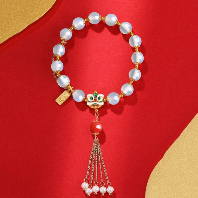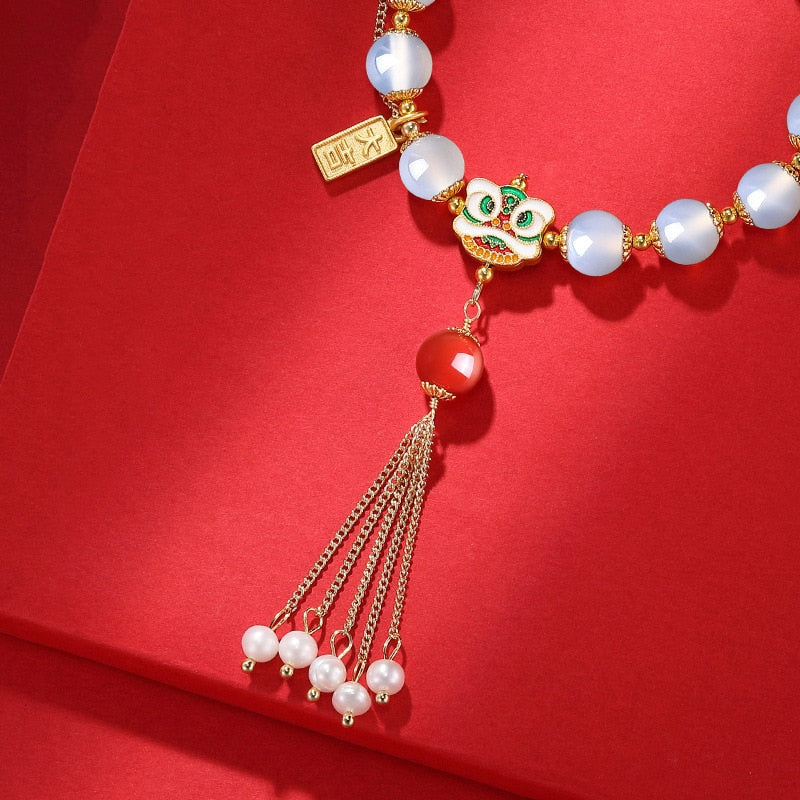 Bracelets-Classic new in natural agate beaded bracelet for women long tassel pearl enamel lion dancing bangles wedding jewelry gift