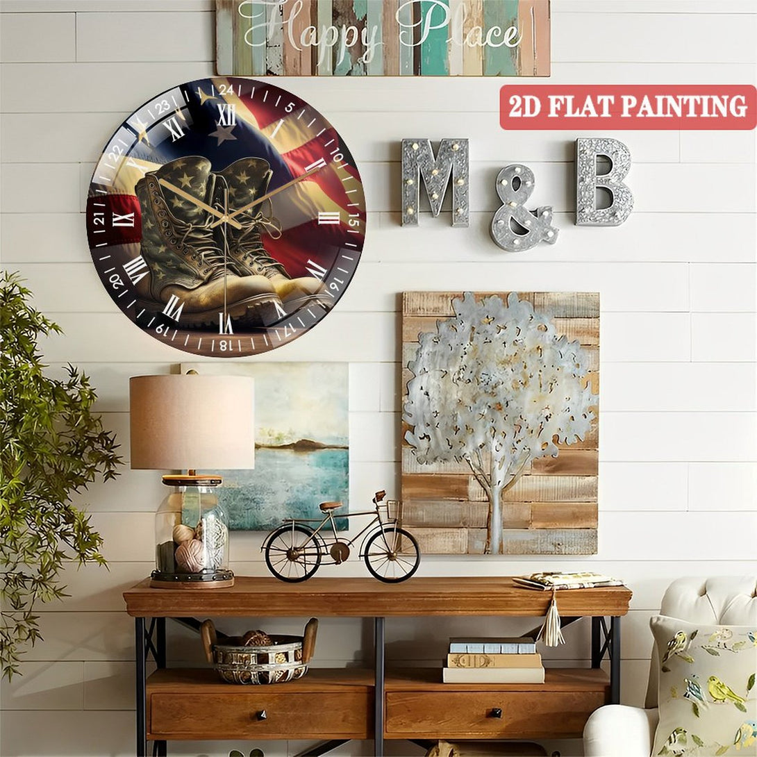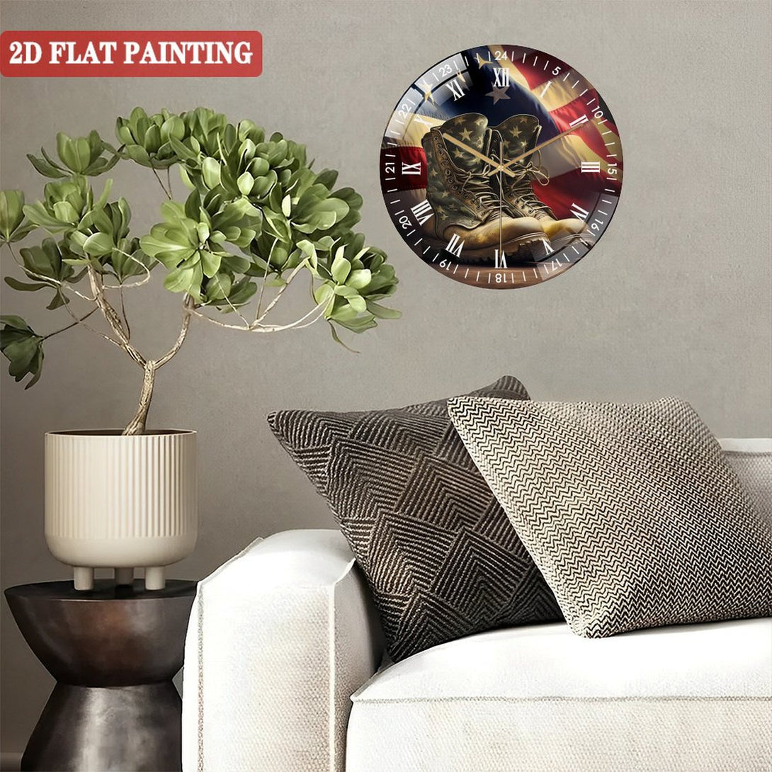 Clock Wall Decor: Military Boots American Flag Patriotic Glass Wall Clock, Military Boots Decor Wall Clock for Homes, Bars, Offices, Man Caves, Garages, And Living Rooms. Style 12×12inch(30×30cm)