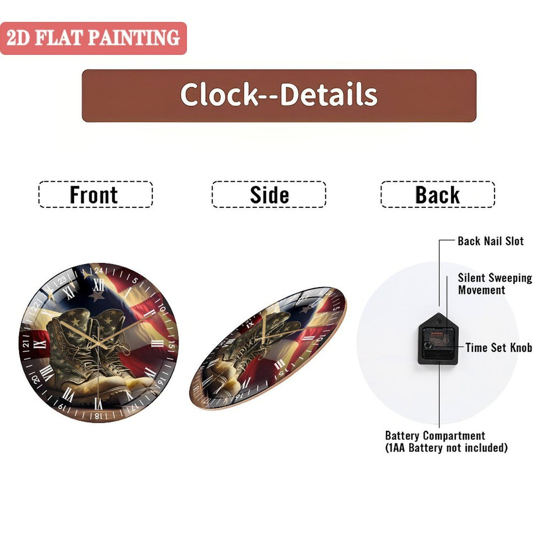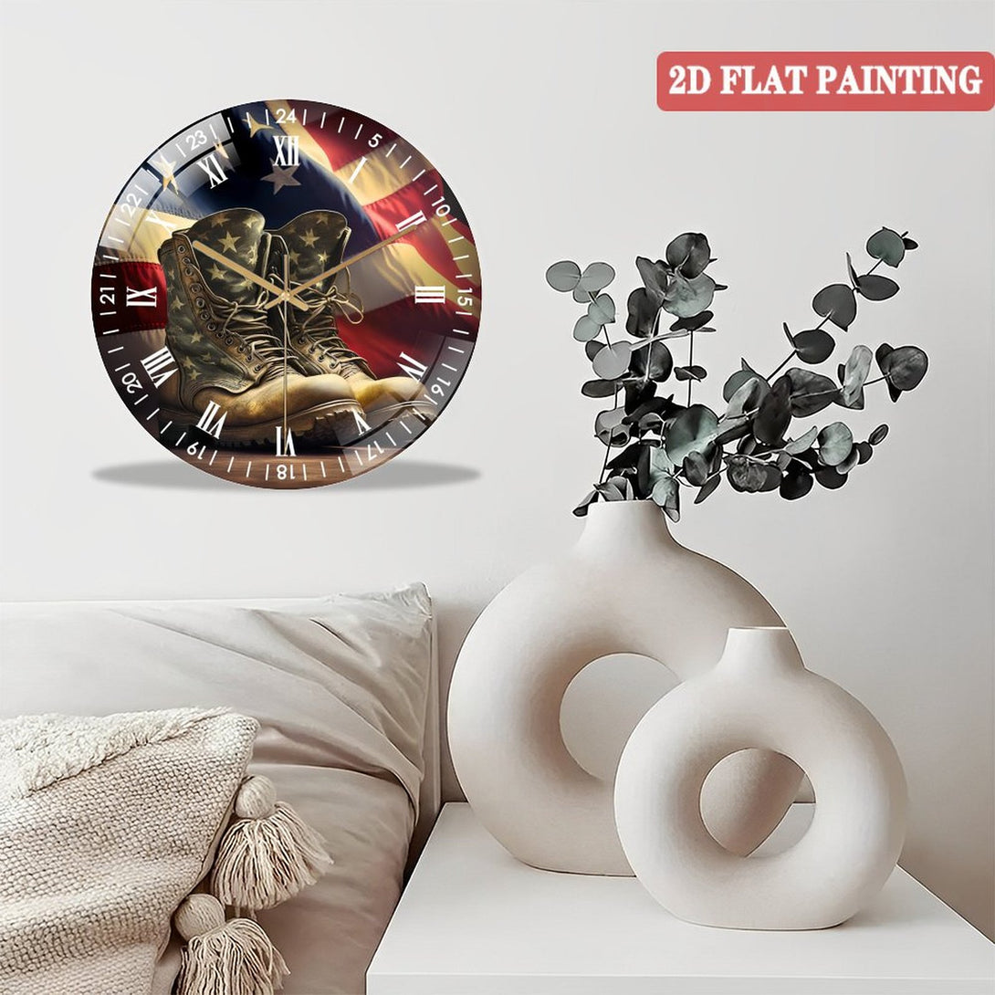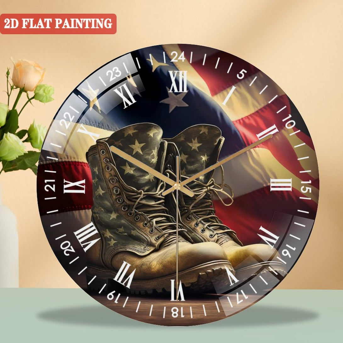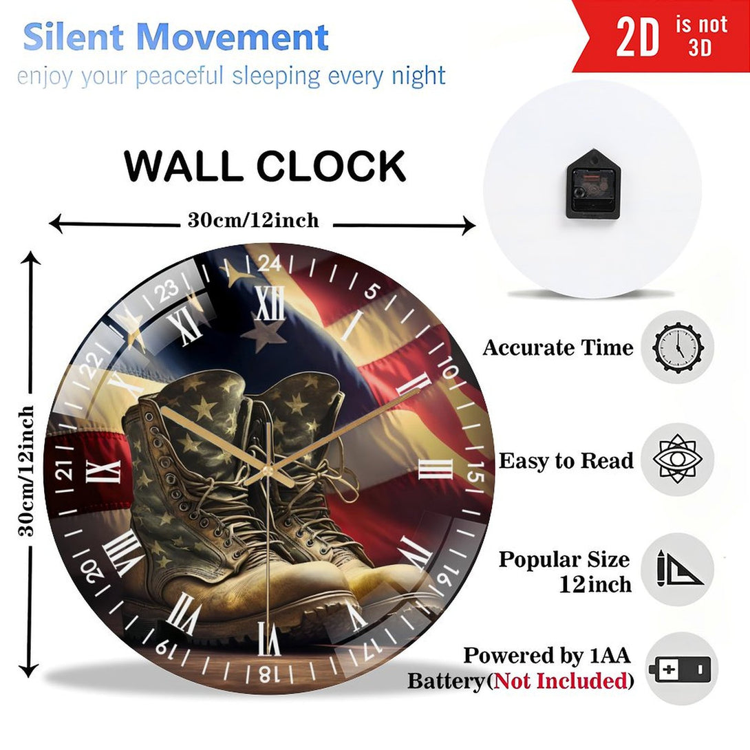 Military Boots American Flag Patriotic Glass Wall Clock, Military Boots Decor Wall Clock for Homes, Bars, Offices, Man Caves, Garages, And Living Rooms.