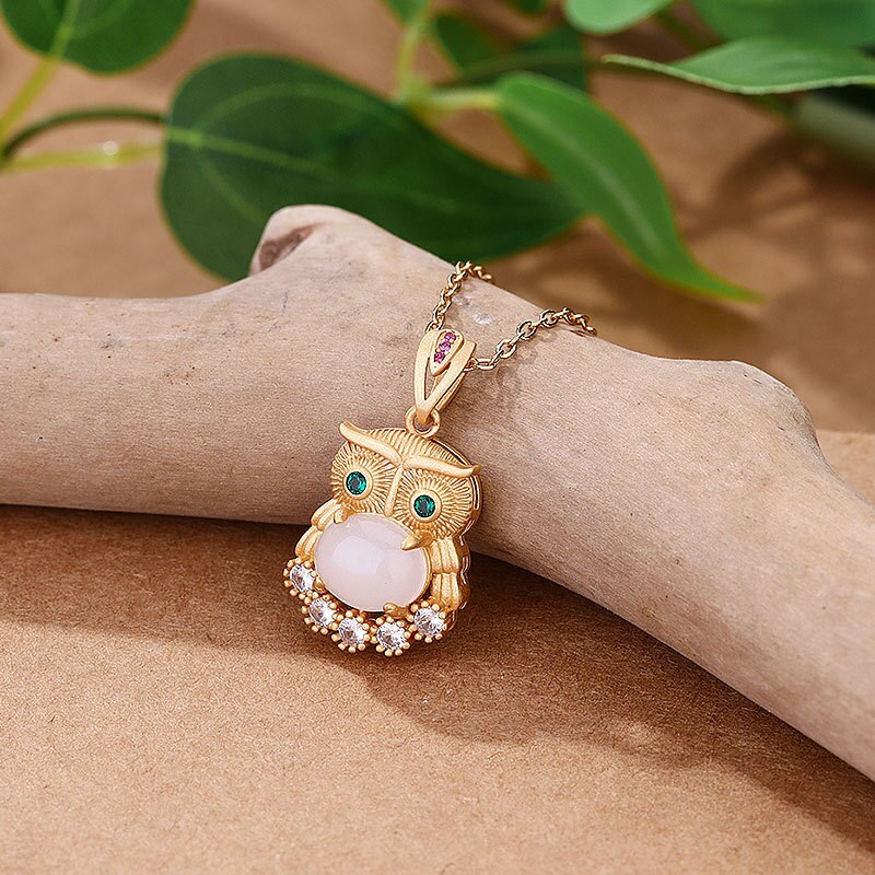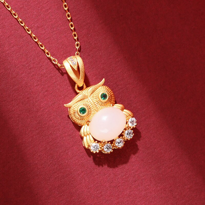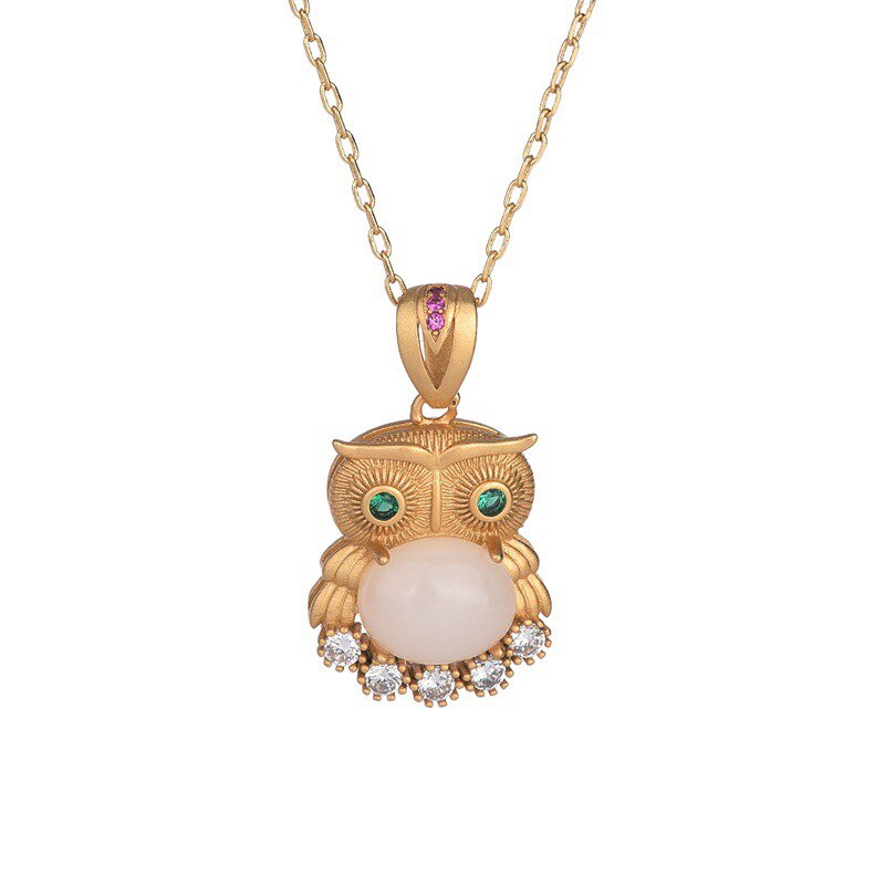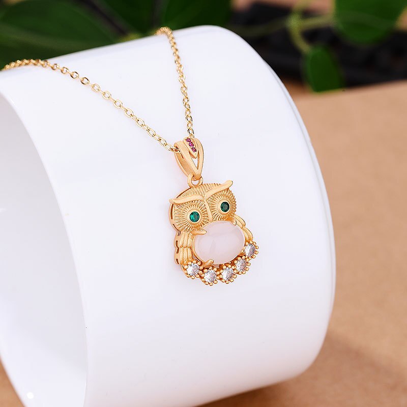 Chains Necklaces-Court style retro owl necklace Ancient gold craft inlaid with natural Hotan Jade frosted exquisite pendant jewelry for women