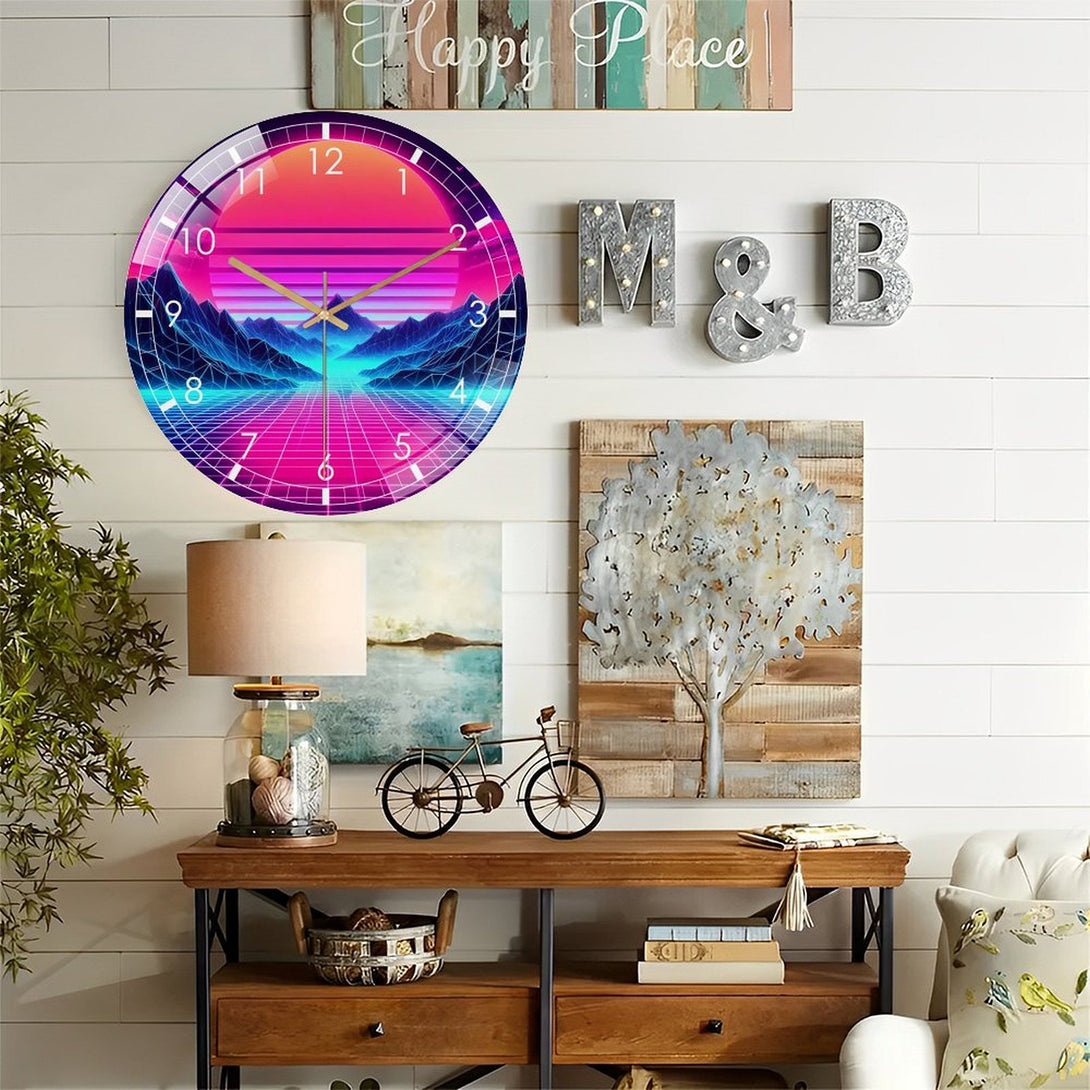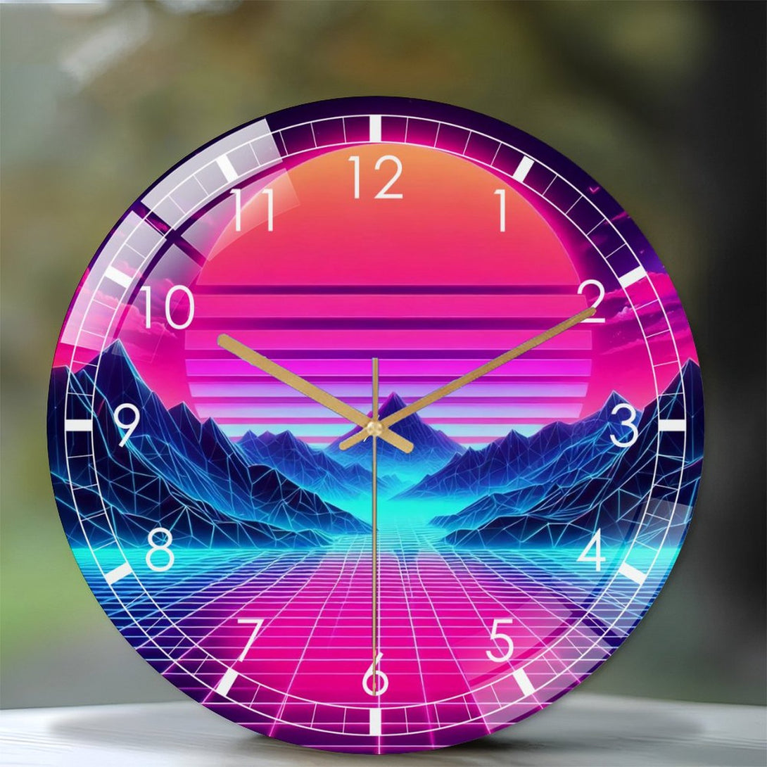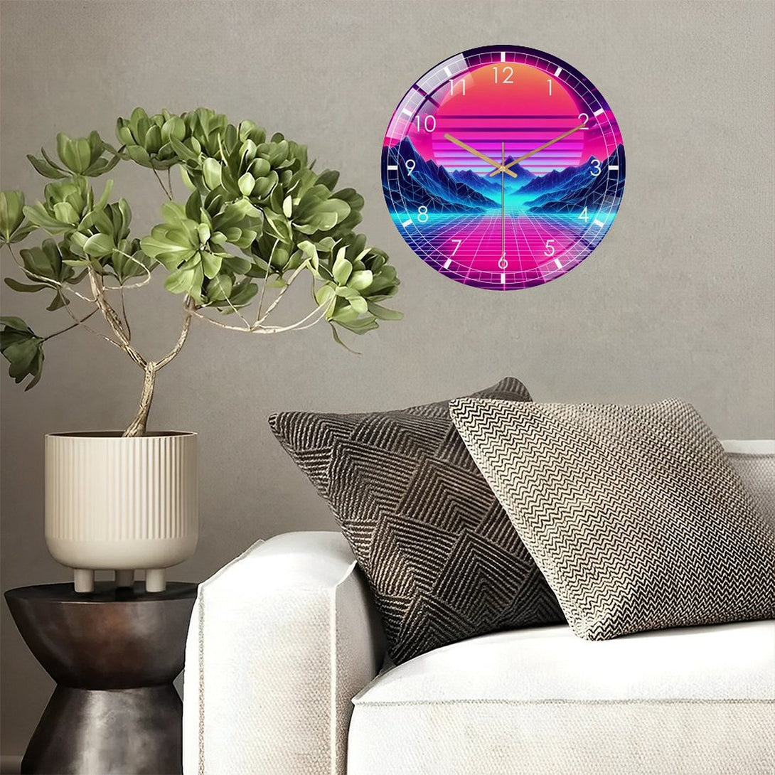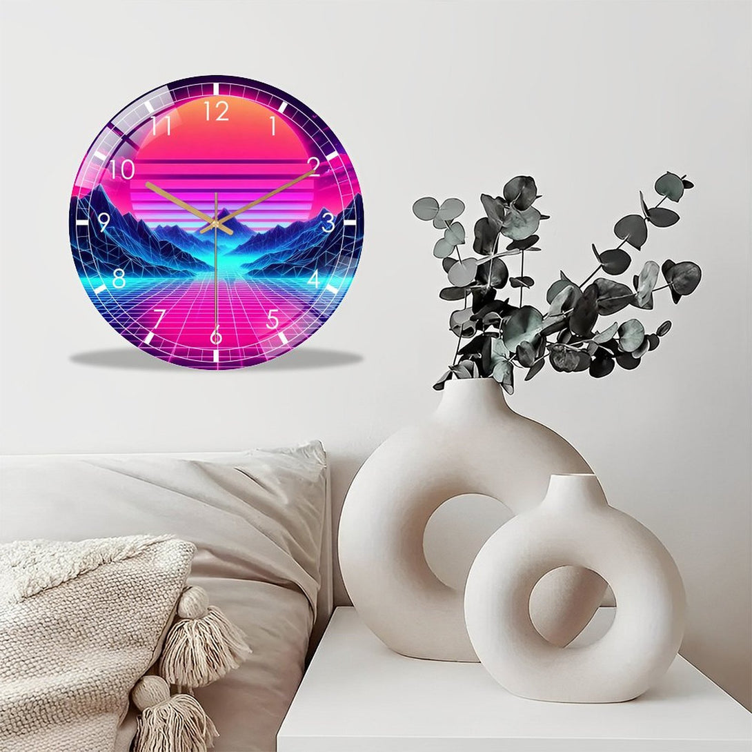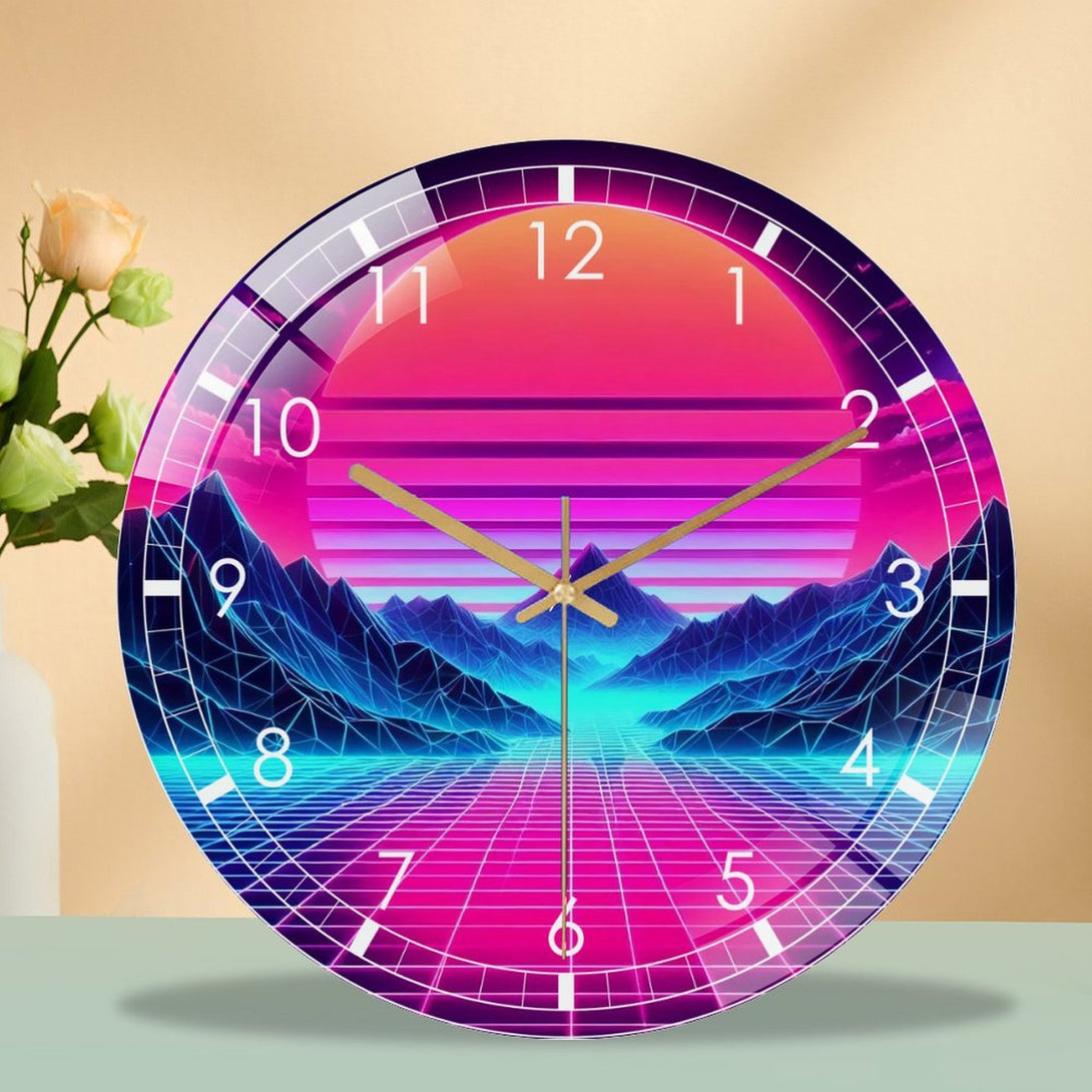 Deco Wall Clock : Neon Vaporwave Sunset Glass Wall Art Glass Wall Clock , Retro 80s Synthwave Wall Art Wall Clock for Housewarming Or Meditation Gift ,Abstract Futuristic Tempered Glass Wall Art
