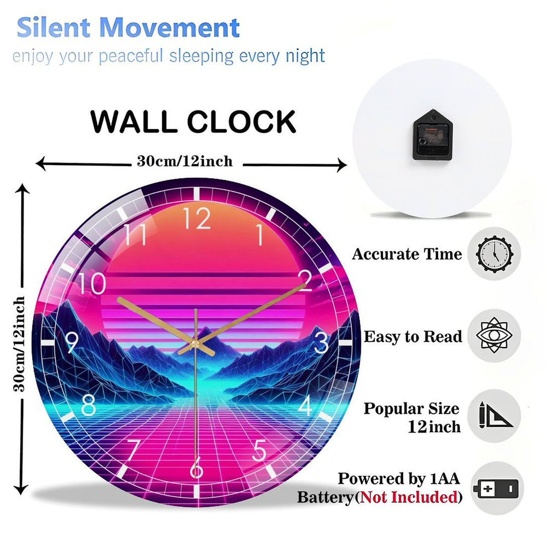 Neon Vaporwave Sunset Glass Wall Art Glass Wall Clock , Retro 80s Synthwave Wall Art Wall Clock for Housewarming Or Meditation Gift ,Abstract Futuristic Tempered Glass Wall Art - Home Wall Deco,12×12inch(30×30cm)