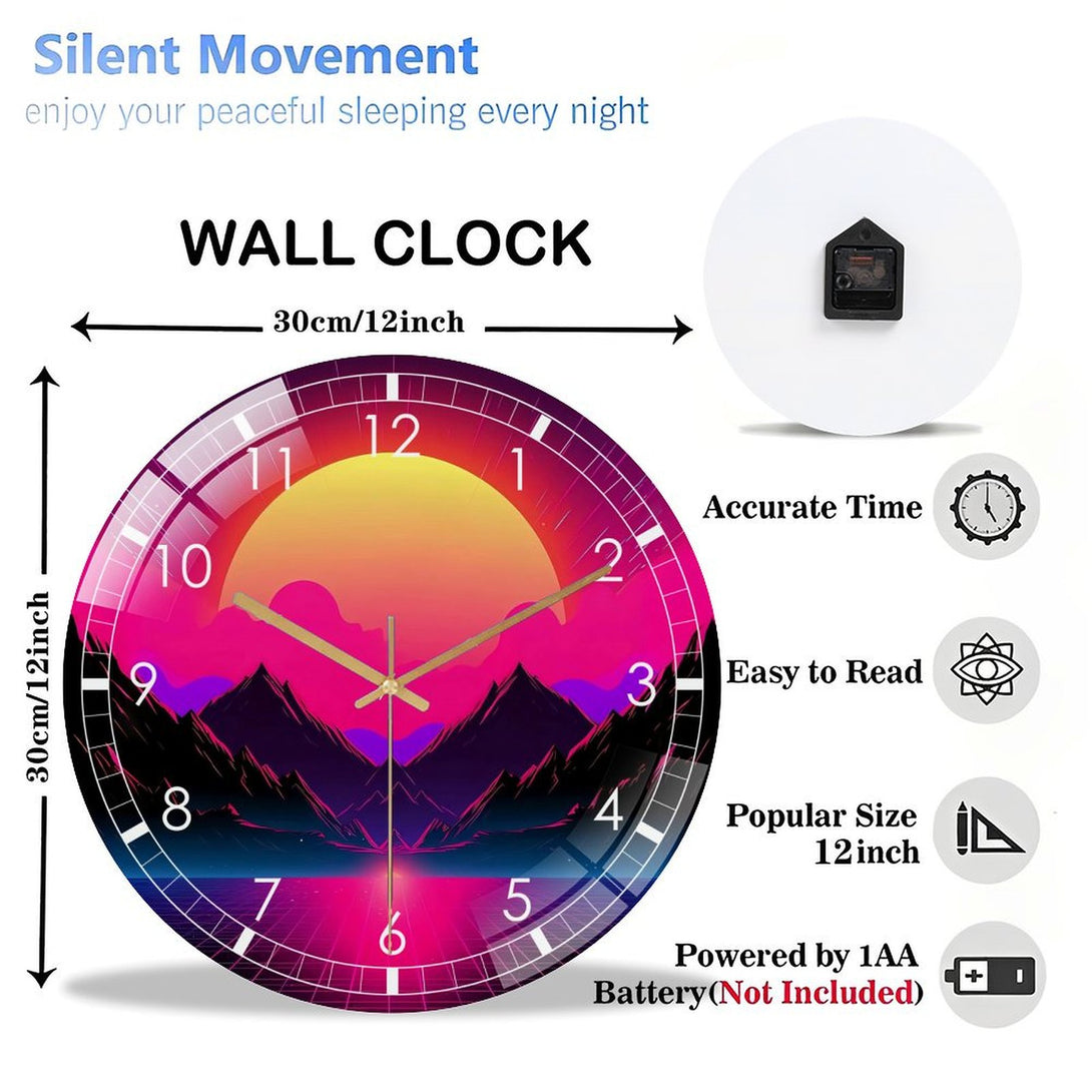Sunset Print Retrowave Wall Art Glass Wall Clock, 80's Nostalgia Decor Cyber Punk Wall Clock for Homes, Bars, Offices, Man Caves, Garages, And Living Rooms .Also Makes A Great Gift.,12×12inch(30×30cm)