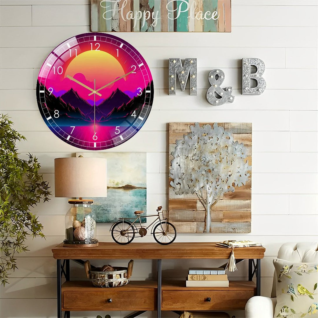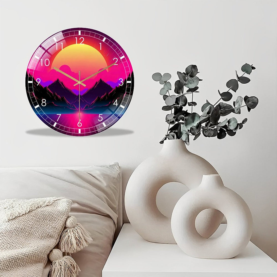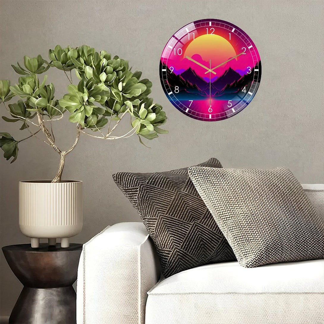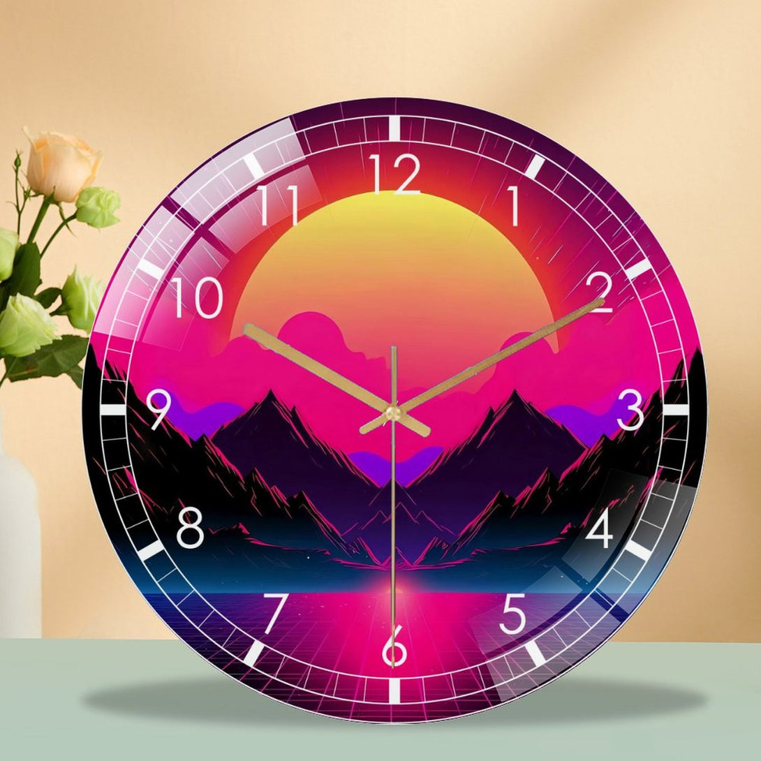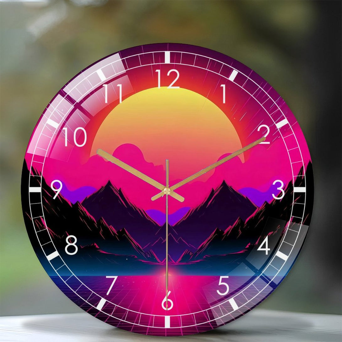 Decor Clocks: Sunset Print Retrowave Wall Art Glass Wall Clock, 80's Nostalgia Decor Cyber Punk Wall Clock for Homes, Bars, Offices, Man Caves, Garages, And Living Rooms .Also Makes A Great Gift.