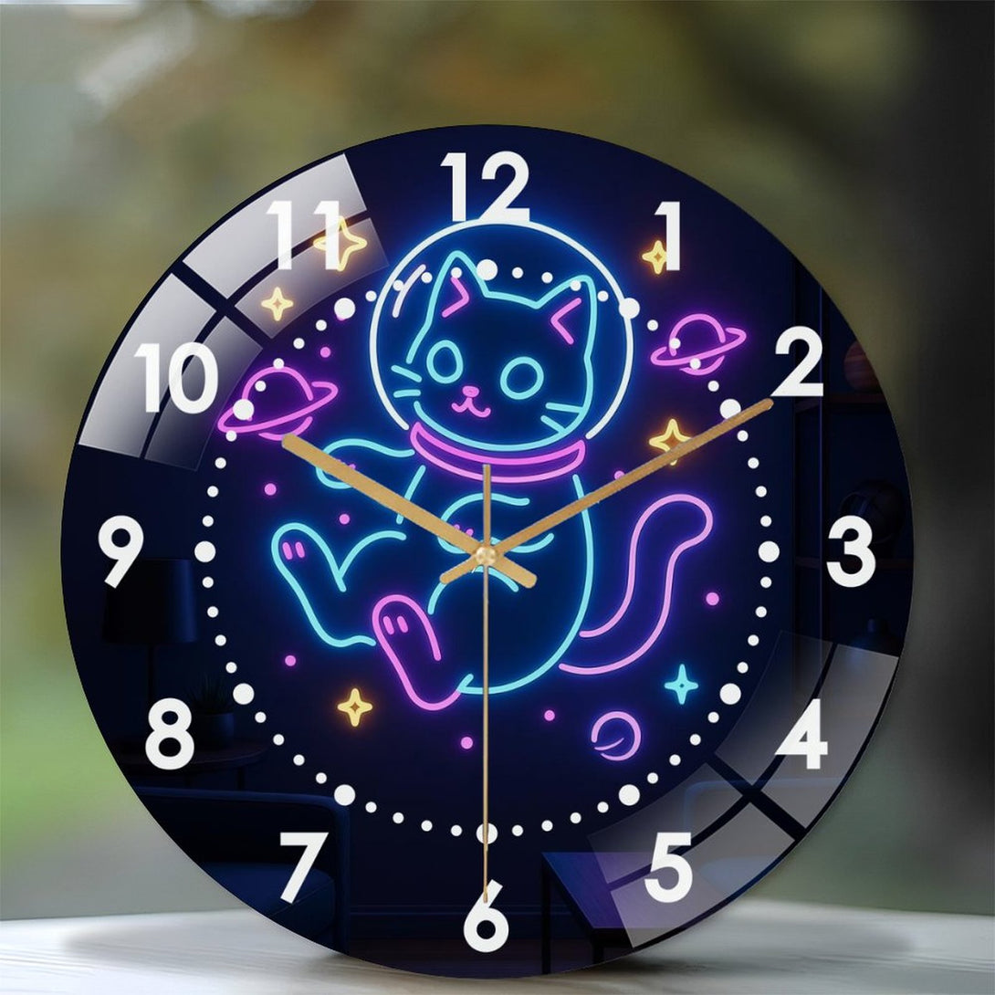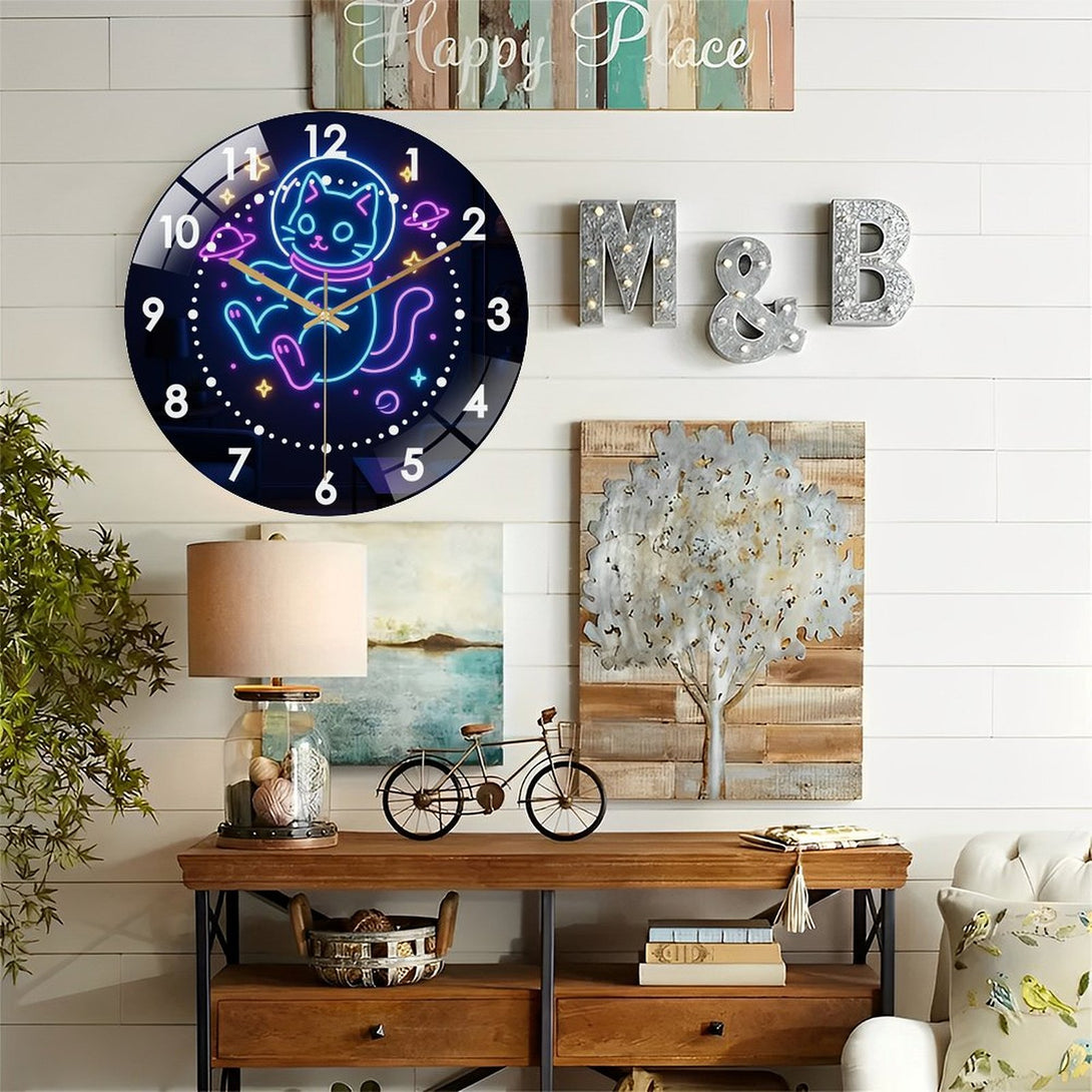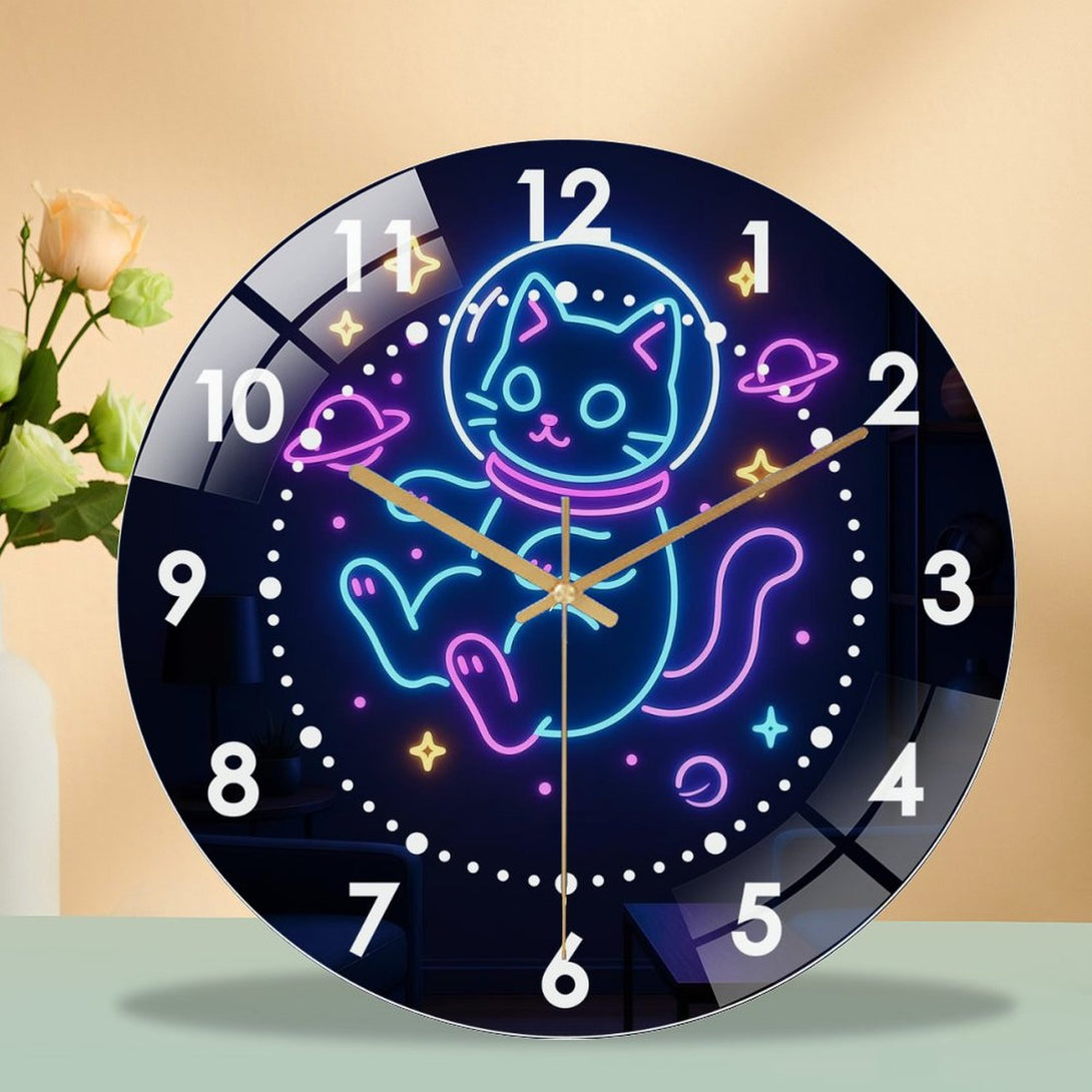 Astronaut Cat Glass Wall Clock – Floating Space Cat Wall Clock for Sci-Fi, Bedroom Or Cosmic Decor,12×12inch(30×30cm)