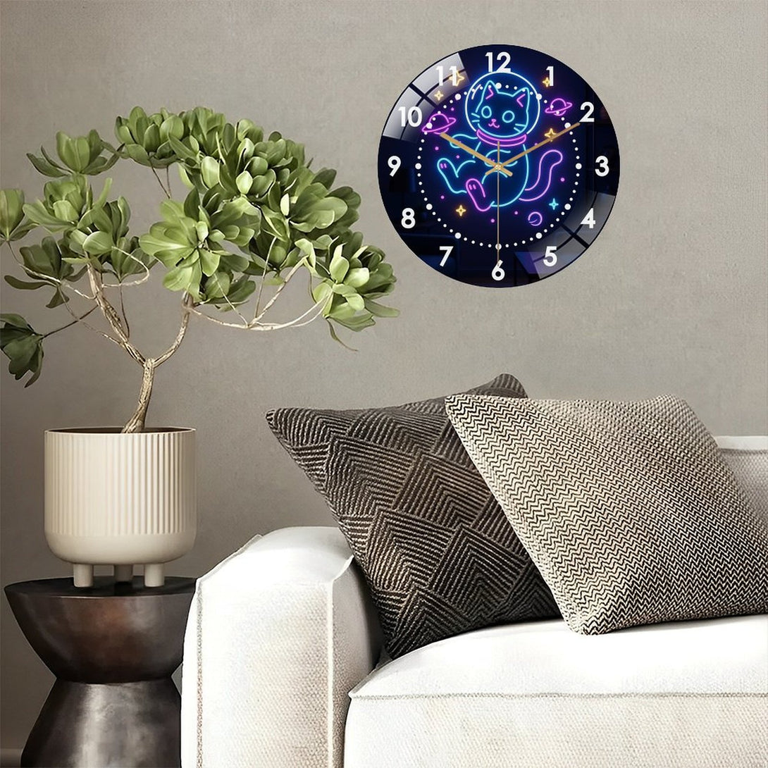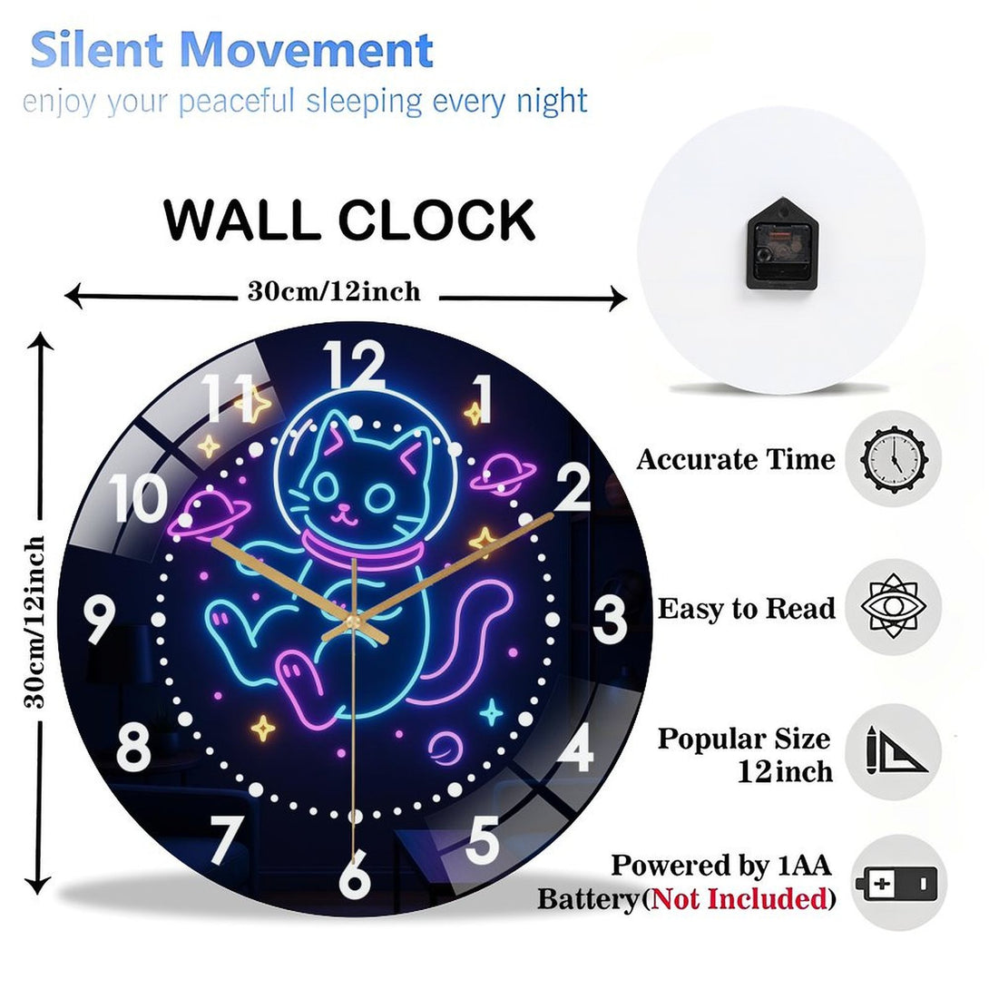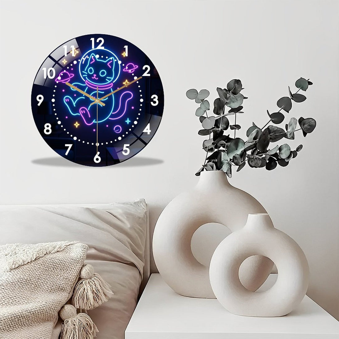 Astronaut Cat Glass Wall Clock – Floating Space Cat Wall Clock for Sci-Fi, Bedroom Or Cosmic Decor,12×12inch(30×30cm)