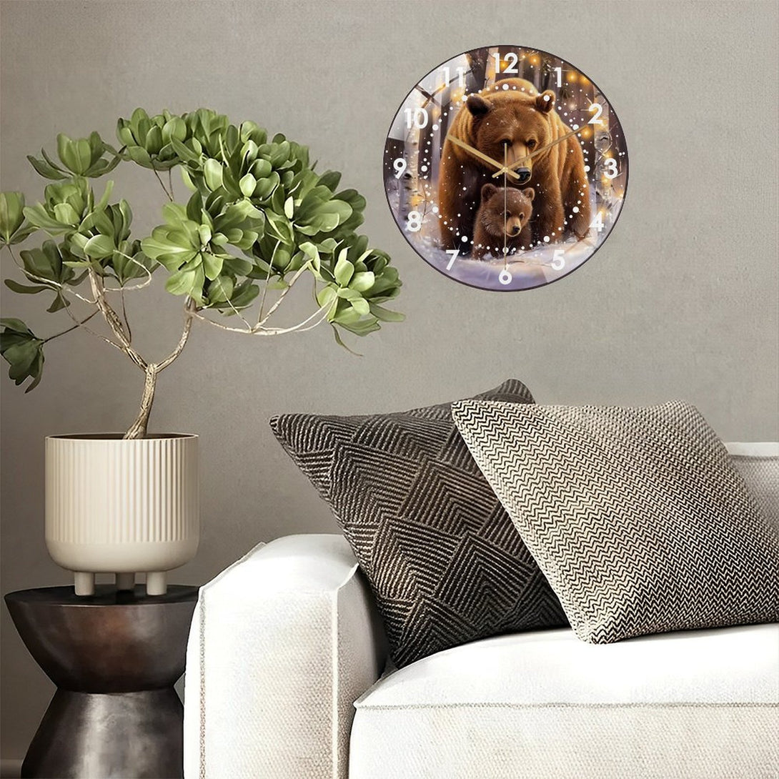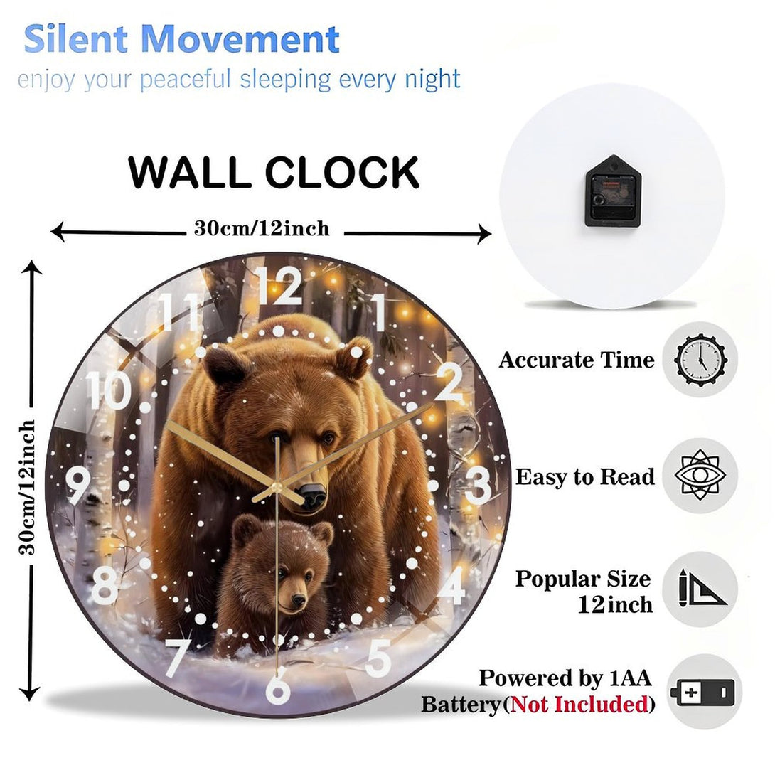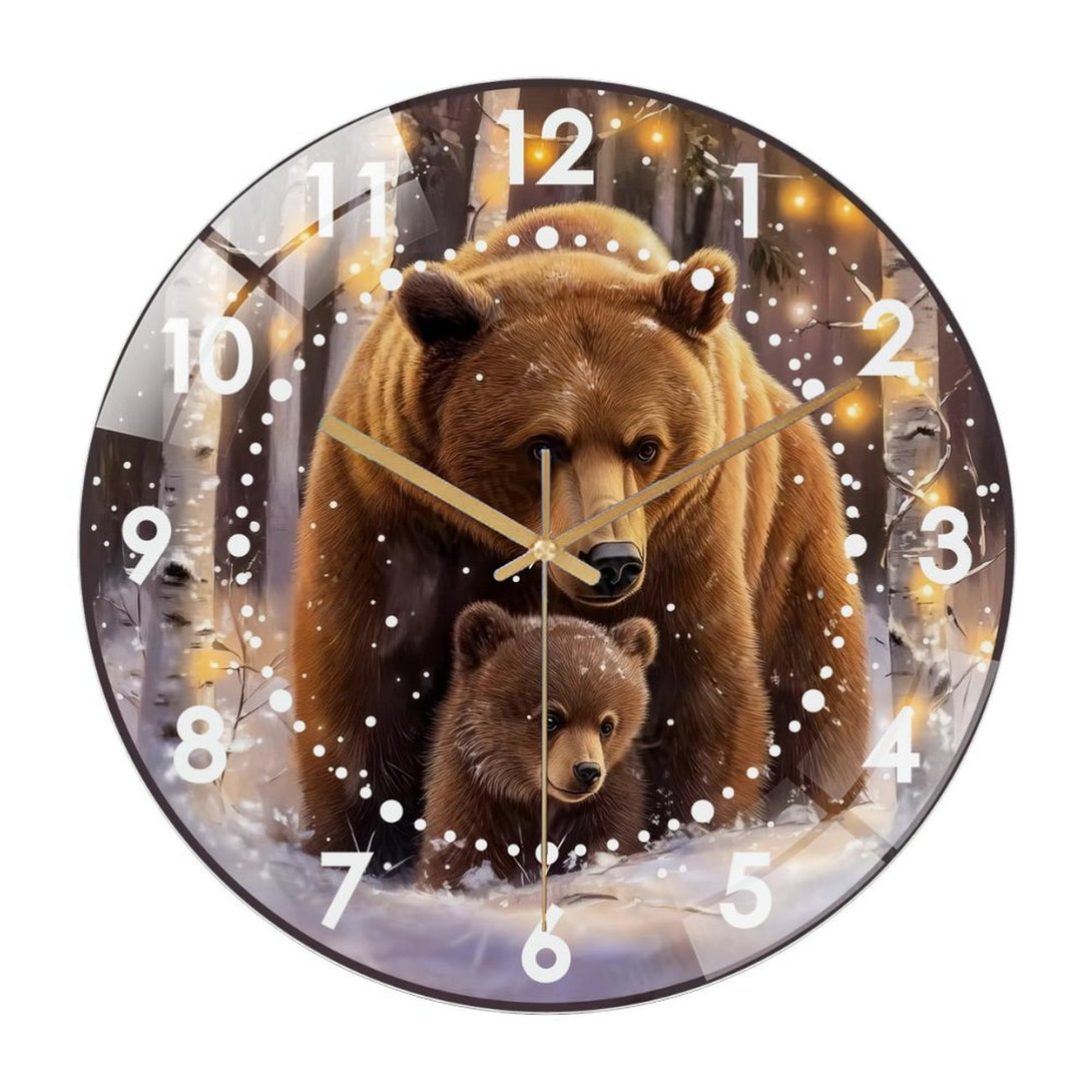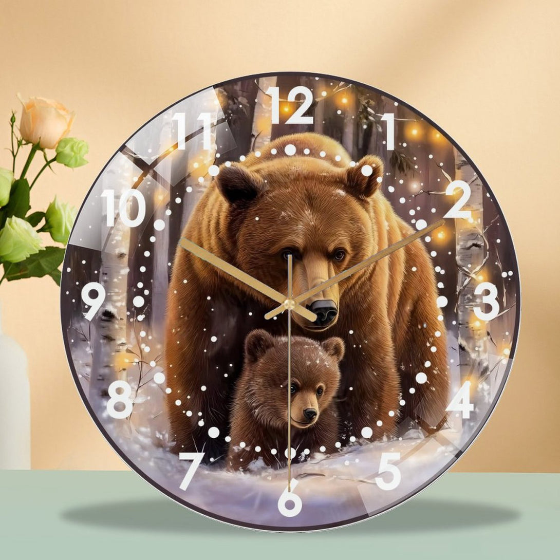 Bear And Cub Glass Wall Clock, Winter Cute Bear Christmas Wall Clock for Homes, Bars, Offices, Man Caves, Garages, And Living Rooms .Also Makes A Great Gift.,12×12inch(30×30cm)