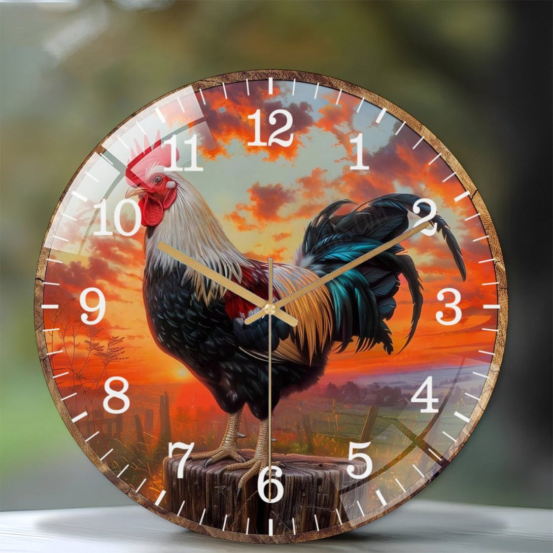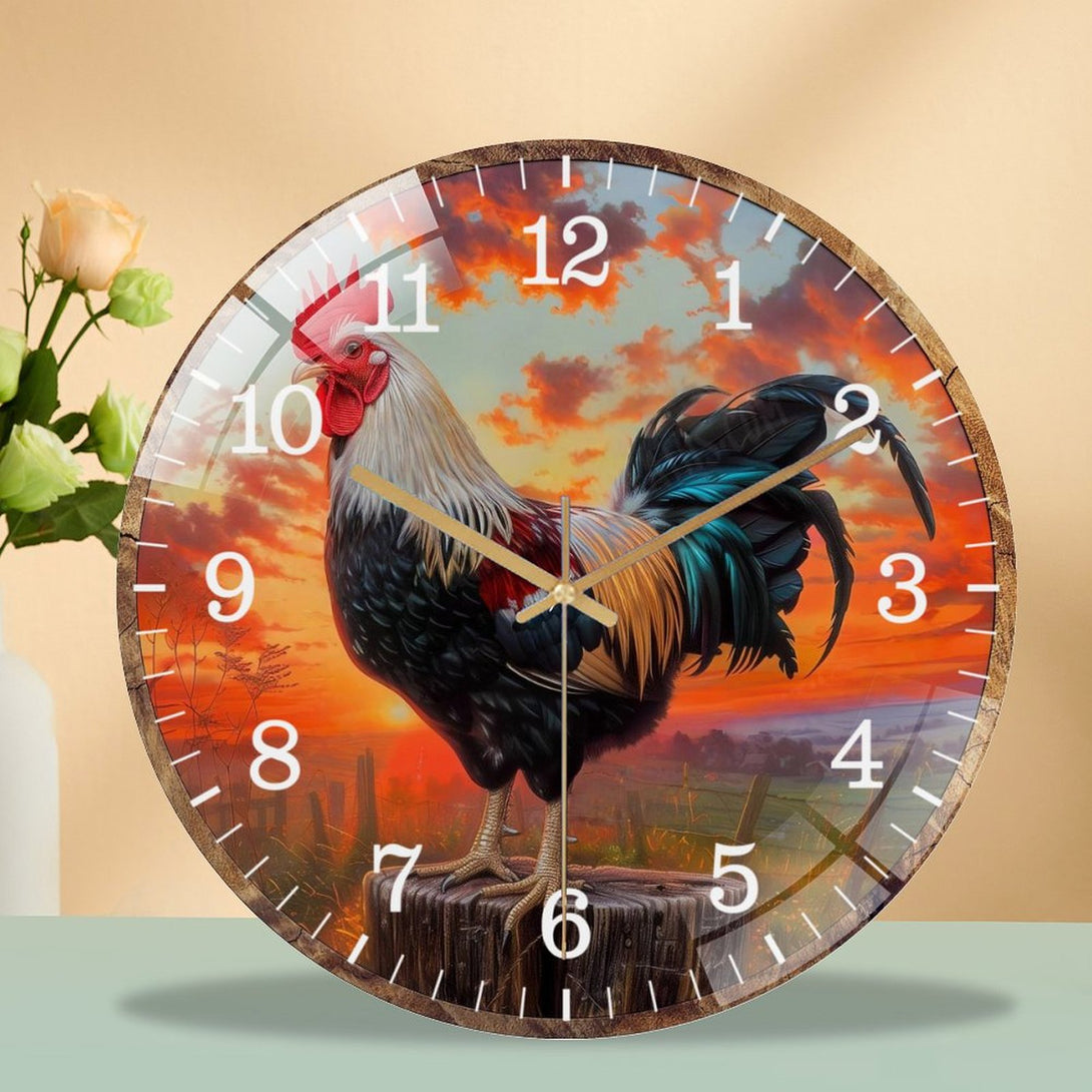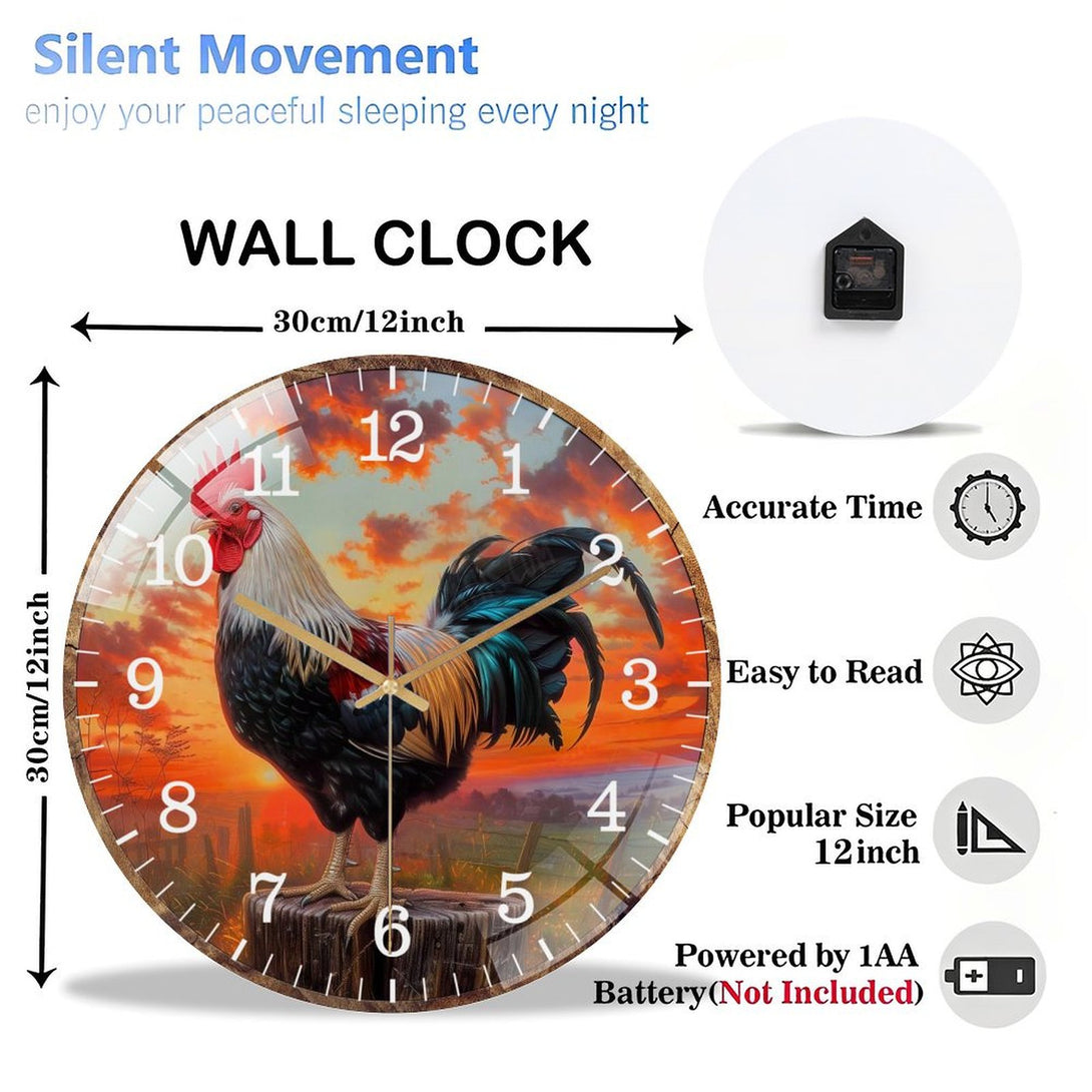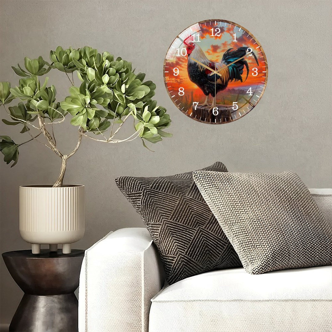 Beautiful Rooster Glass Wall Clock, Sunset Rooster Wall Clock for Homes, Bars, Offices, Man Caves, Garages, And Living Rooms .Also Makes A Great Gift.7ul_副本,12×12inch(30×30cm)
