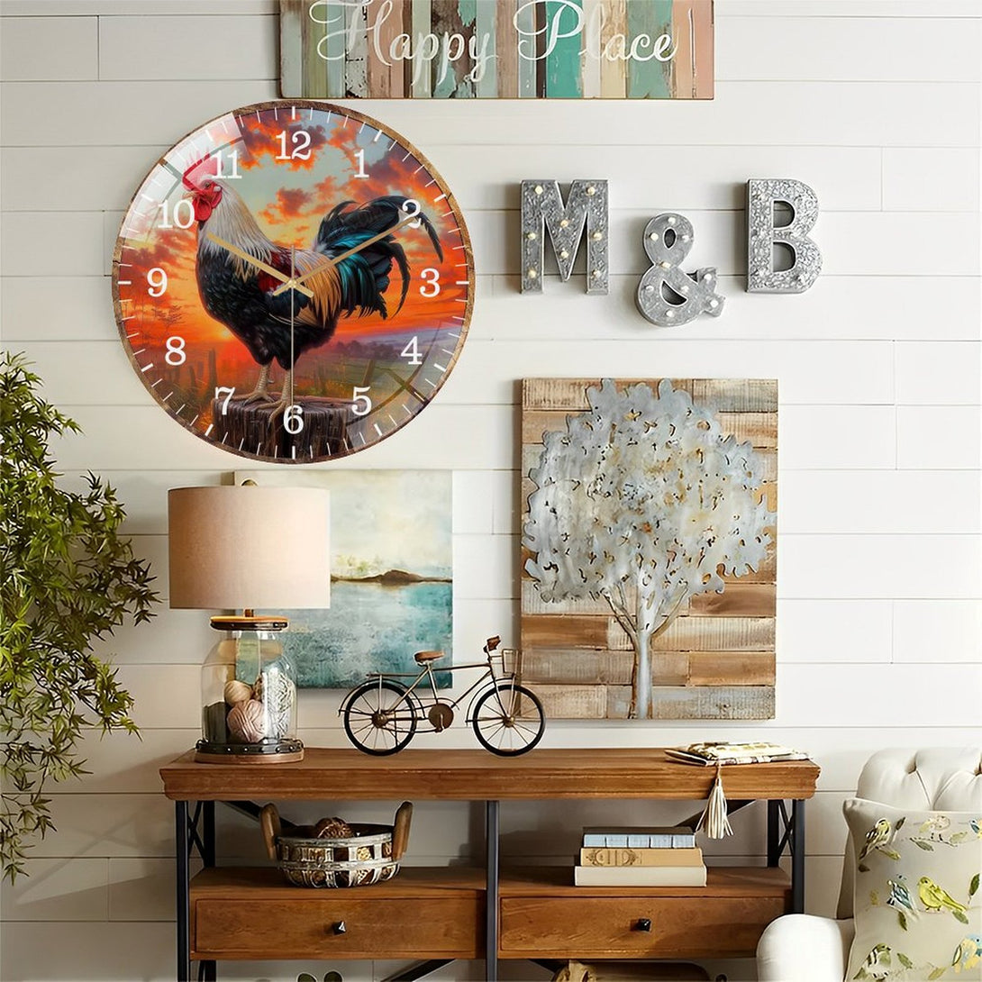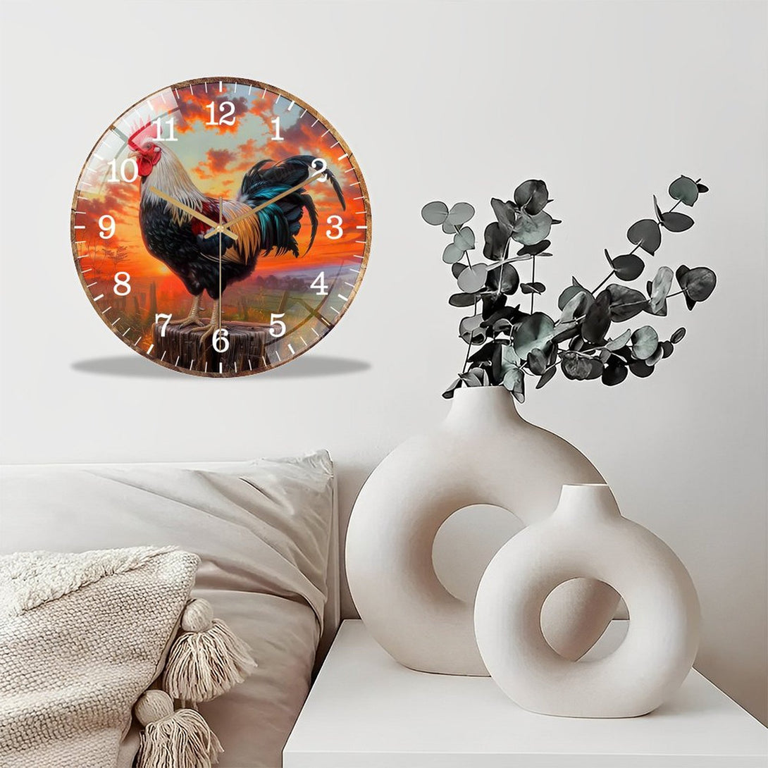 Decor Wall Clock: Beautiful Rooster Glass Wall Clock, Sunset Rooster Wall Clock for Homes, Bars, Offices, Man Caves, Garages, And Living Rooms .Also Makes A Great Gift.