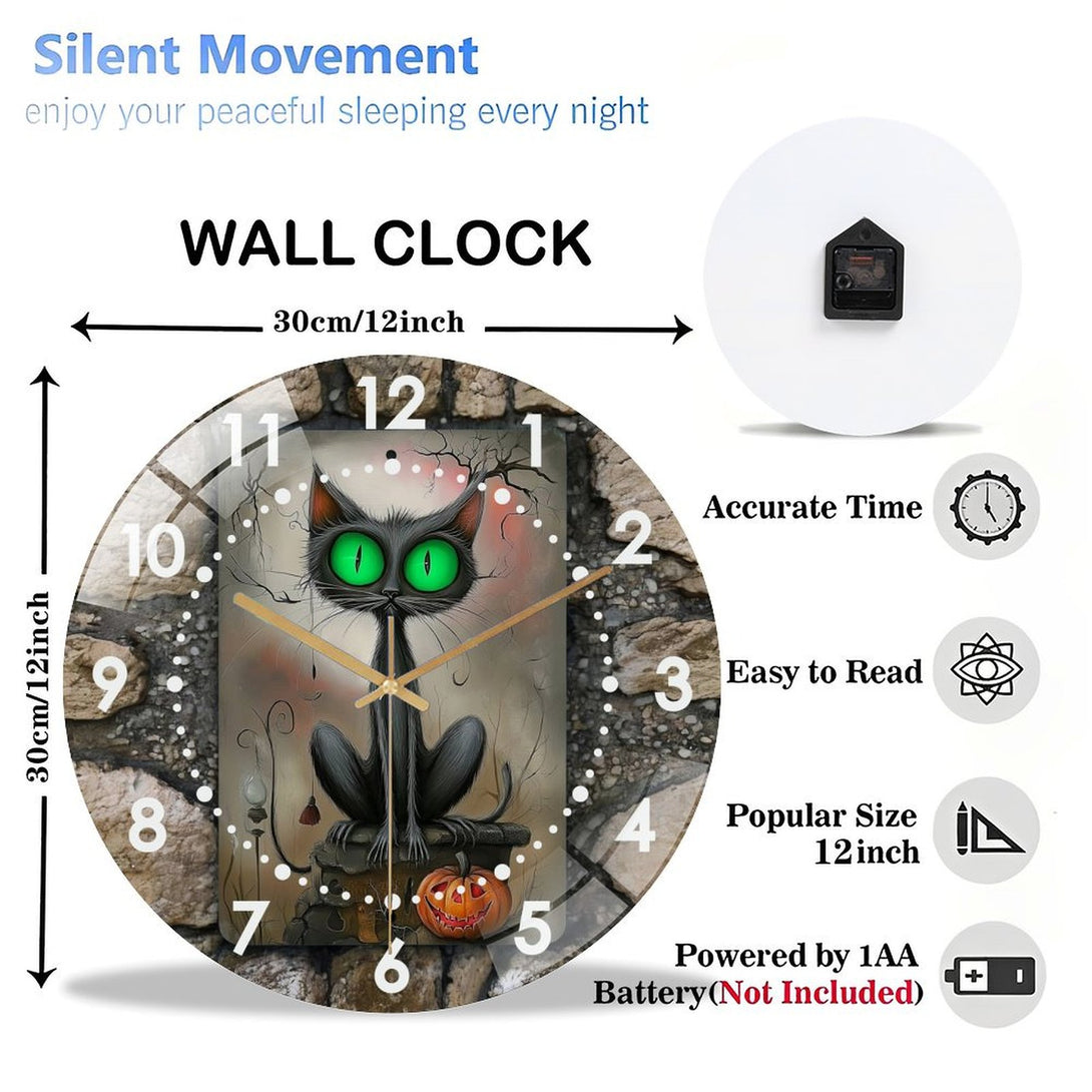 Black Cat with Green Eyes And Pumpkin Glass Wall Clock, Creepy Spooky Decor Wall Clock for Homes, Bars, Offices, Man Caves, Garages, And Living Rooms .Also Makes A Great Gift.,12×12inch(30×30cm)