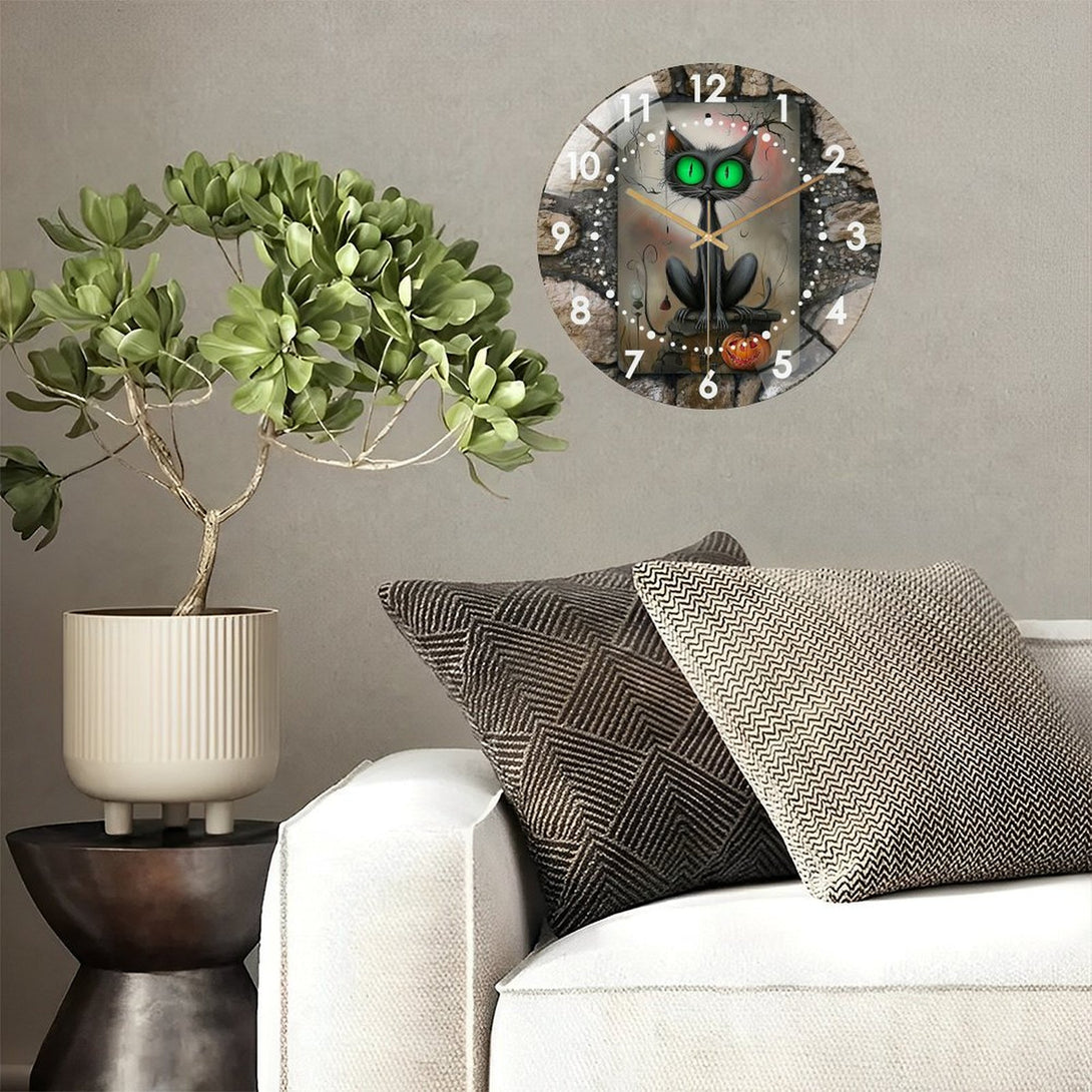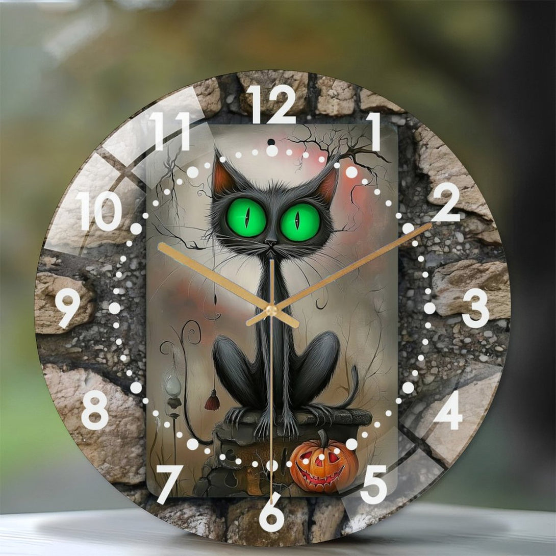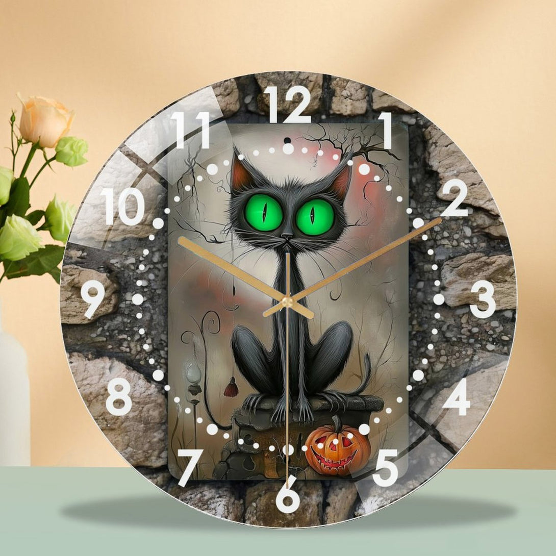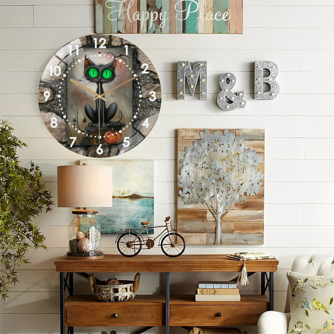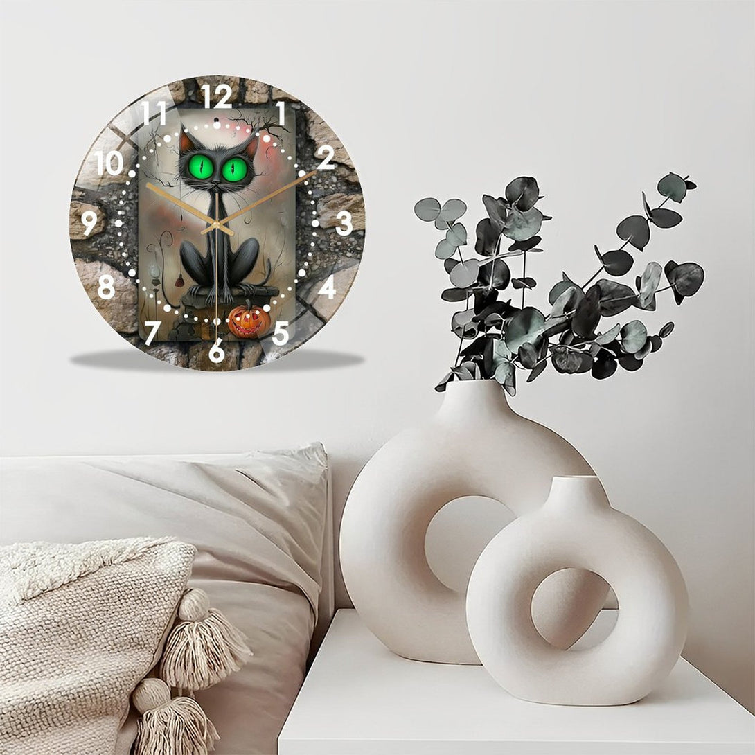 Decor Wall Clock: Black Cat with Green Eyes And Pumpkin Glass Wall Clock, Creepy Spooky Decor Wall Clock for Homes, Bars, Offices, Man Caves, Garages, And Living Rooms .