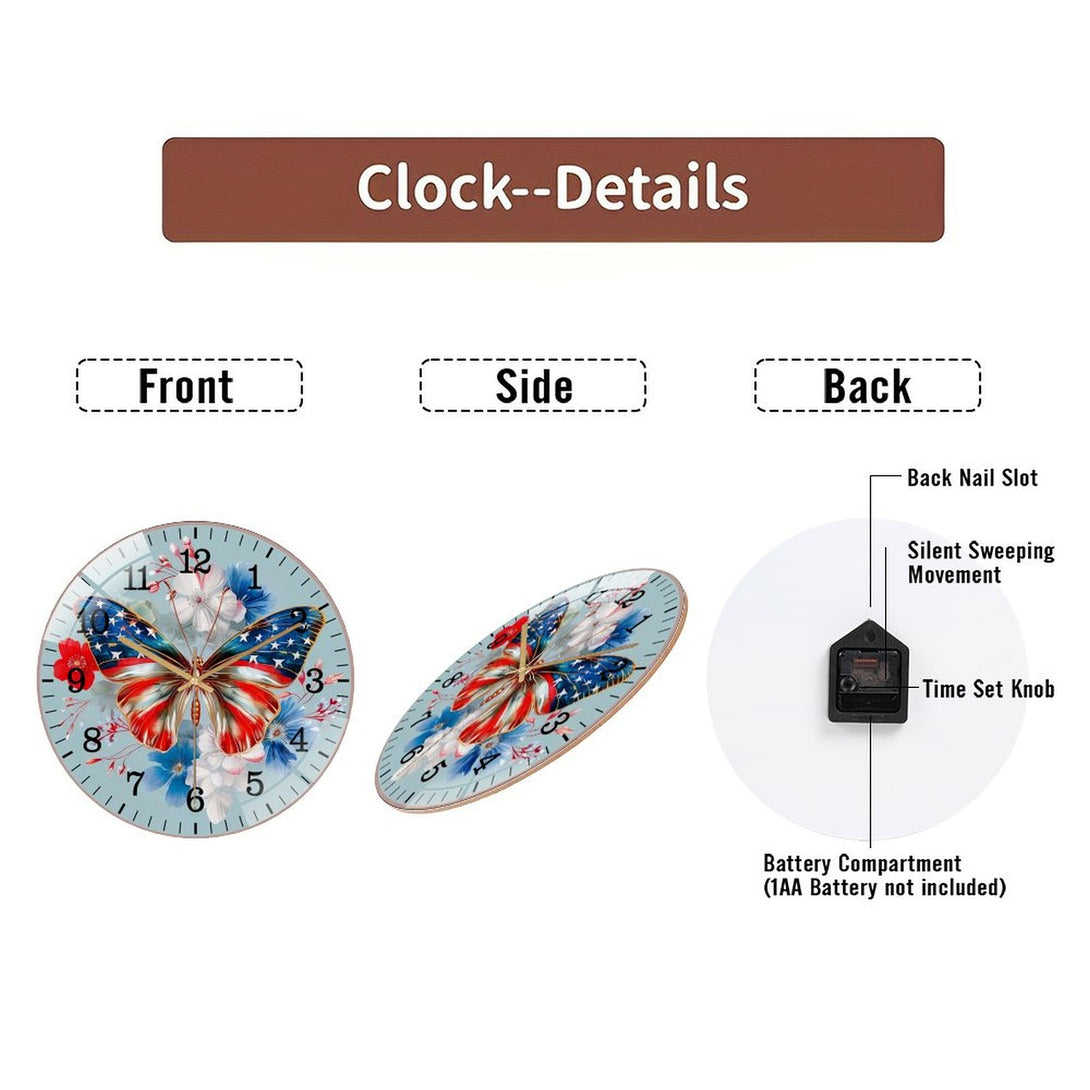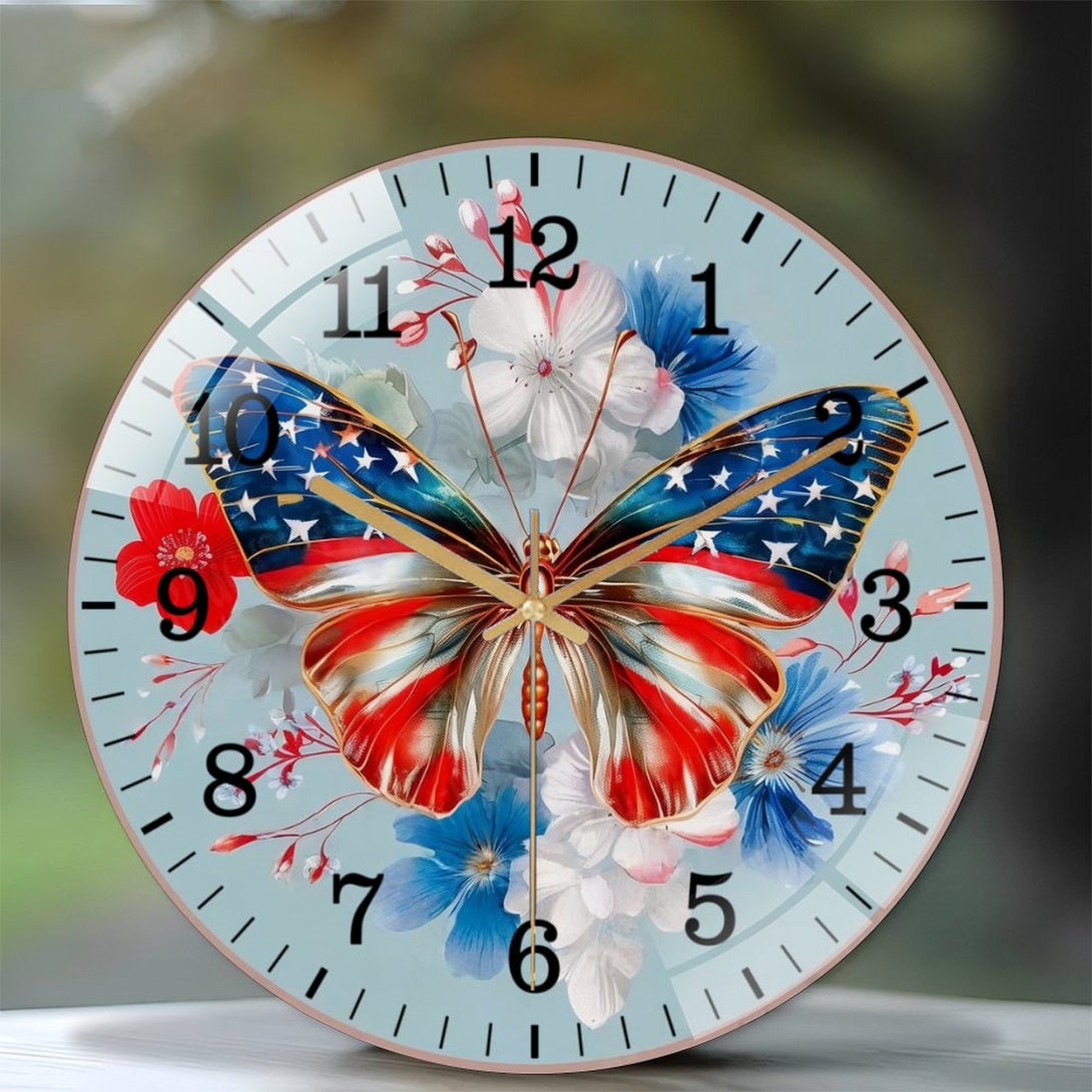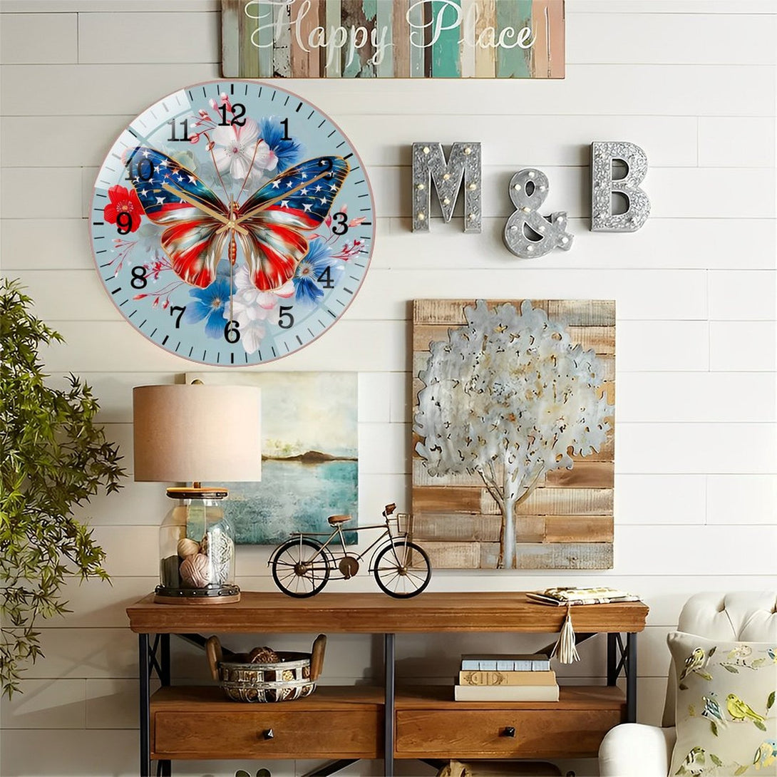 Decor Wall Clock: Butterfly Welcome Glass Wall Clock,Butterfly Patriotic American Flag Decor Wall Clock for Homes, Bars, Offices, Man Caves, Garages, And Living Rooms .Also Makes A Great Gift.