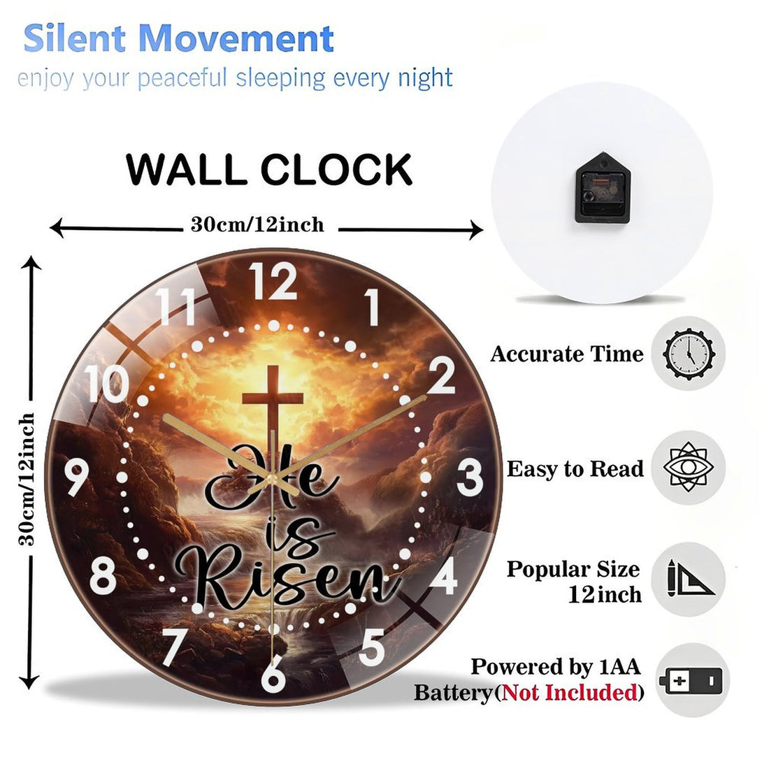 Cross He Is Risen Glass Wall Clock, Easter Christian Wall Clock for Homes, Bars, Offices, Man Caves, Garages, And Living Rooms .Also Makes A Great Gift.,12×12inch(30×30cm)