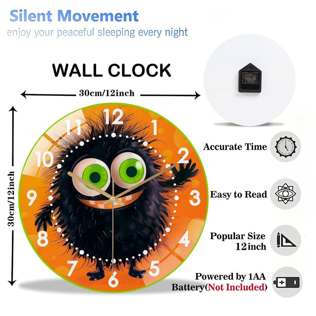 Cute Furry Monster Glass Wall Clock, Hallo-ween Cute Fall Decor Wall Clock for Homes, Bars, Offices, Man Caves, Garages, And Living Rooms .Also Makes A Great Gift.,12×12inch(30×30cm)