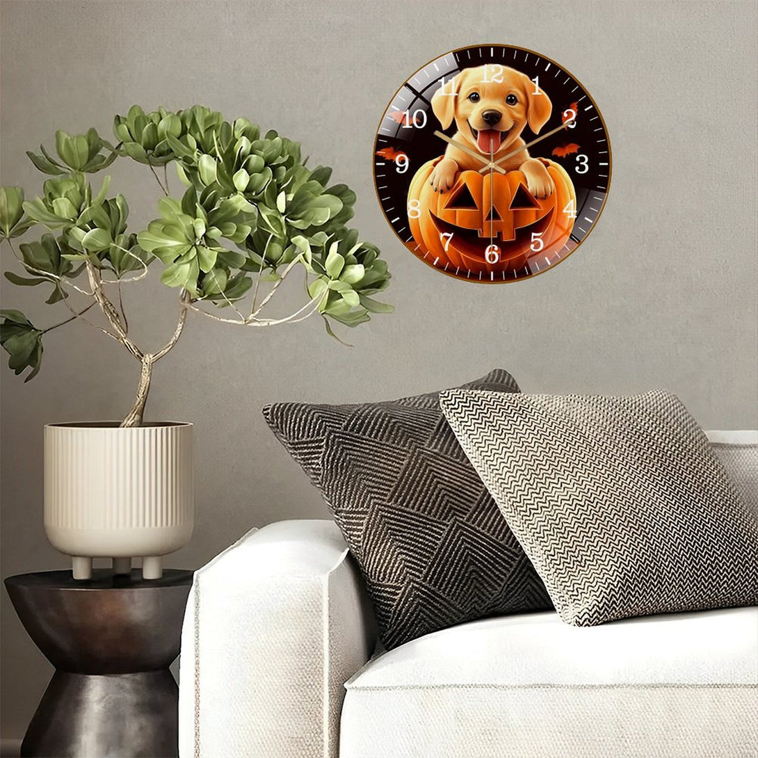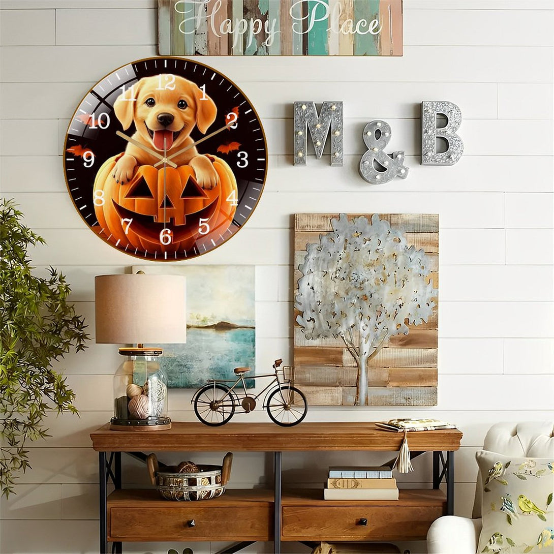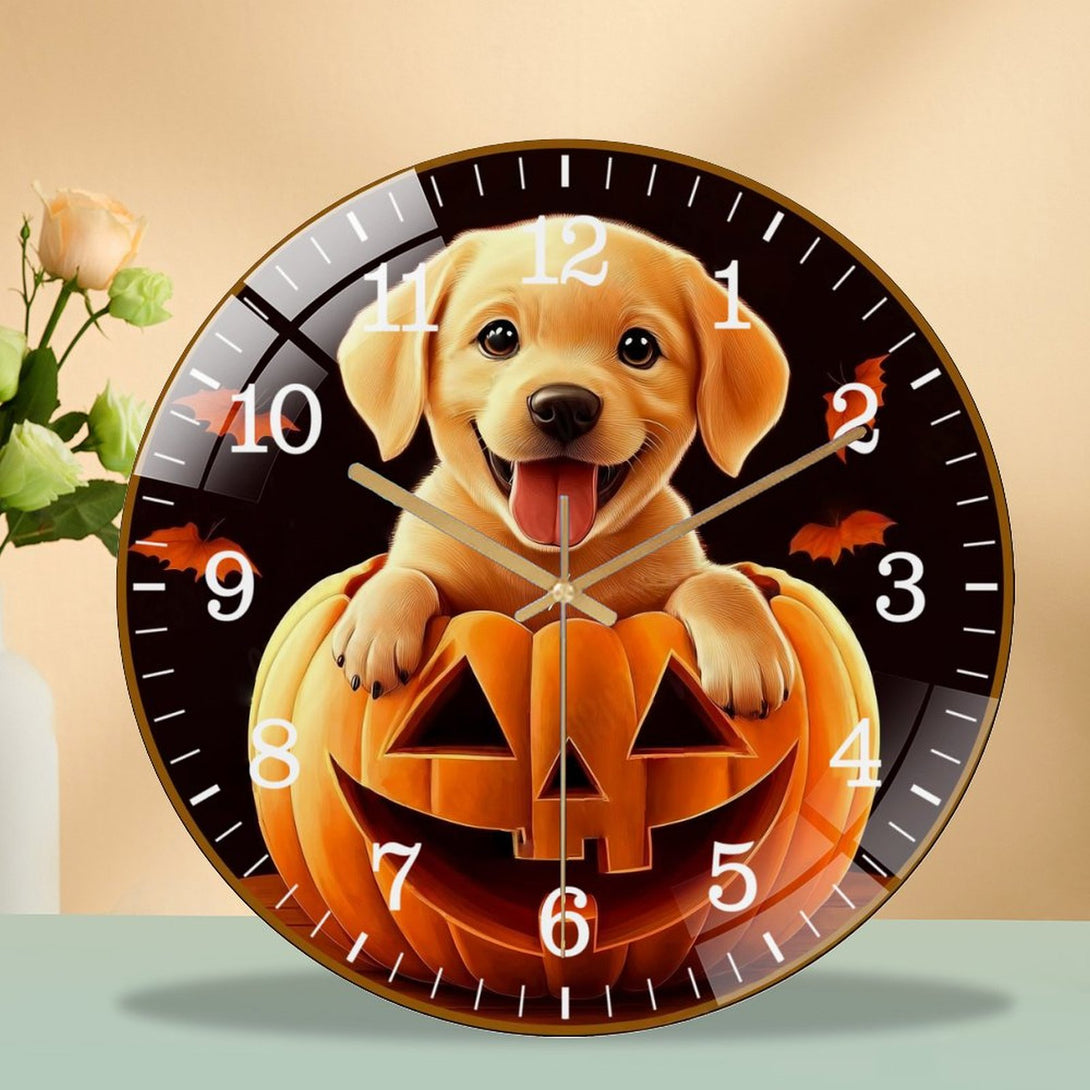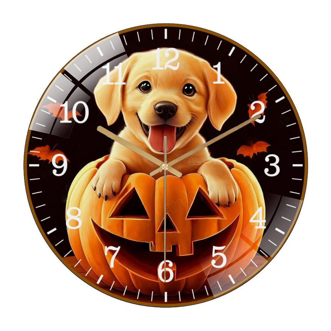Decor Wall Clock: Cute Puppy Dog in Pumpkin Glass Wall Clock, Yellow Lab Hallo-wee Home Decor Wall Clock for Homes, Bars, Offices, Man Caves, Garages, And Living Rooms .