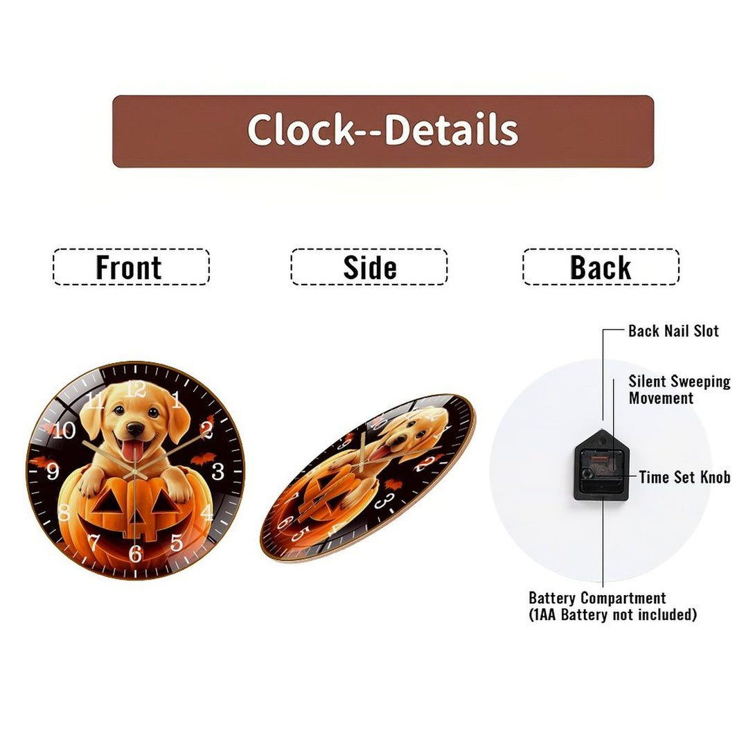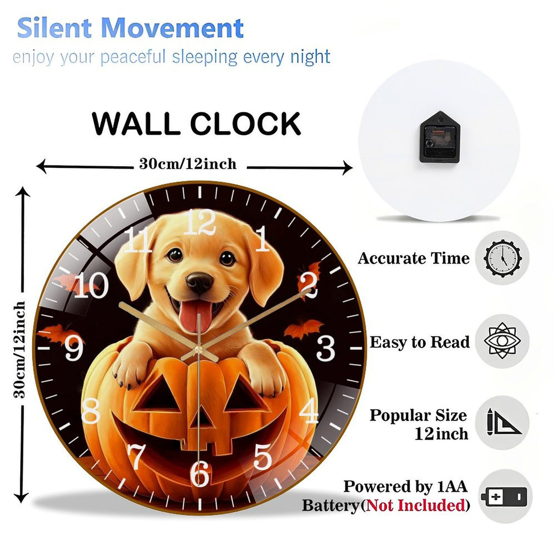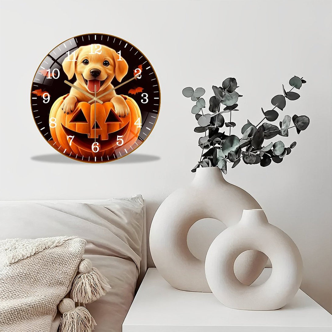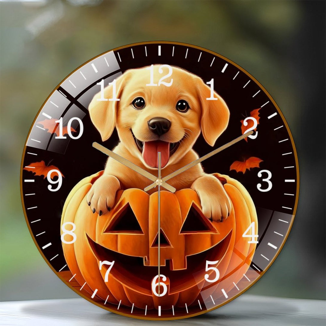 Decor Wall Clock: Cute Puppy Dog in Pumpkin Glass Wall Clock, Yellow Lab Hallo-wee Home Decor Wall Clock for Homes, Bars, Offices, Man Caves, Garages, And Living Rooms .