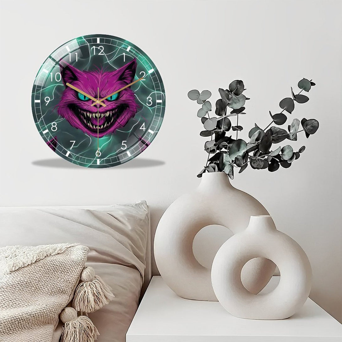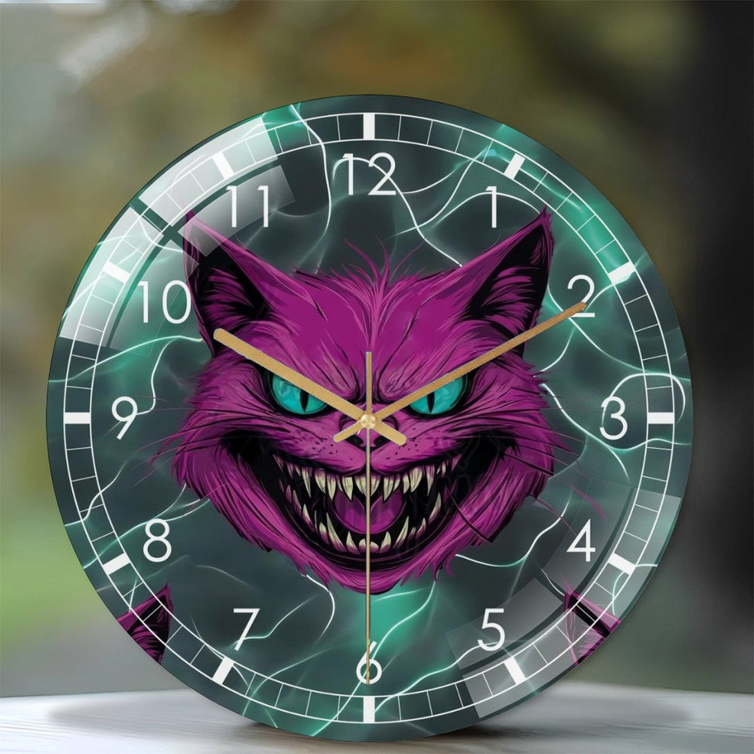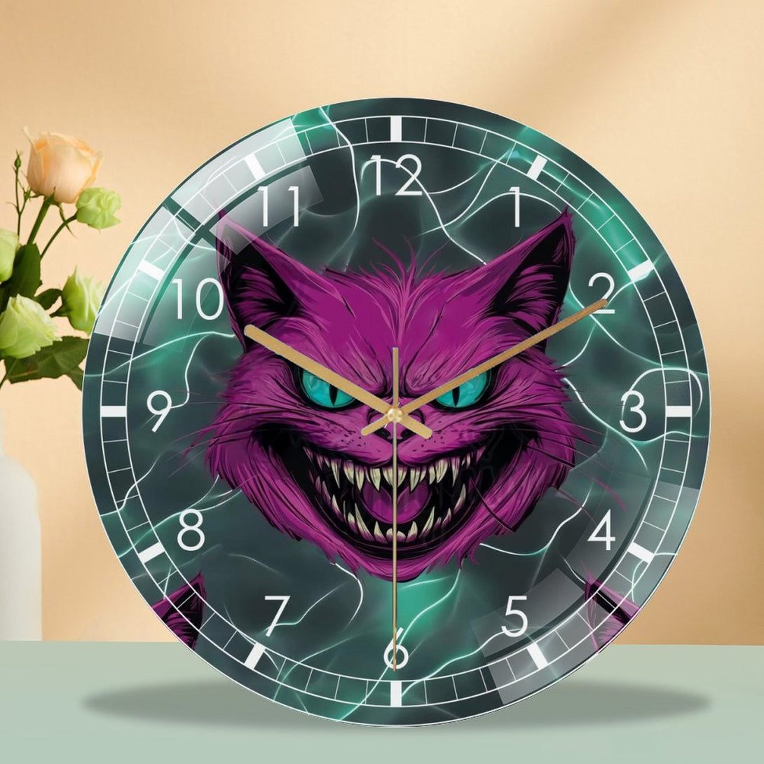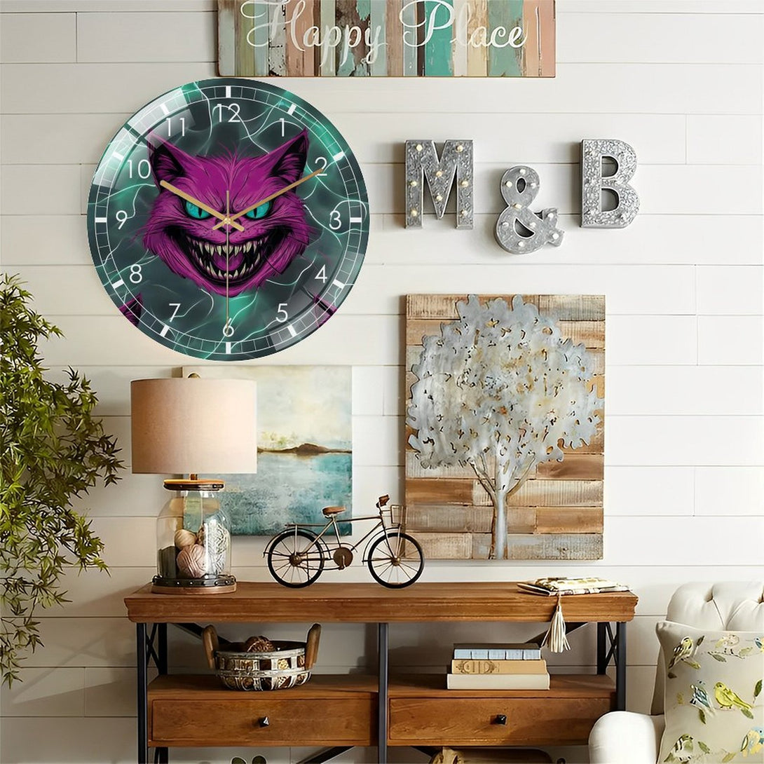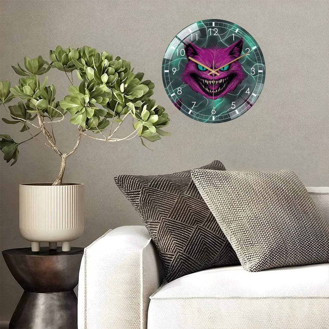 Decor Wall Clock: Evil Cheshire Cat Glass Wall Clock, Cat Decor And Gift Wall Clock for Homes, Bars, Offices, Man Caves, Garages, And Living Rooms .Also Makes A Great Gift. Style 12×12inch