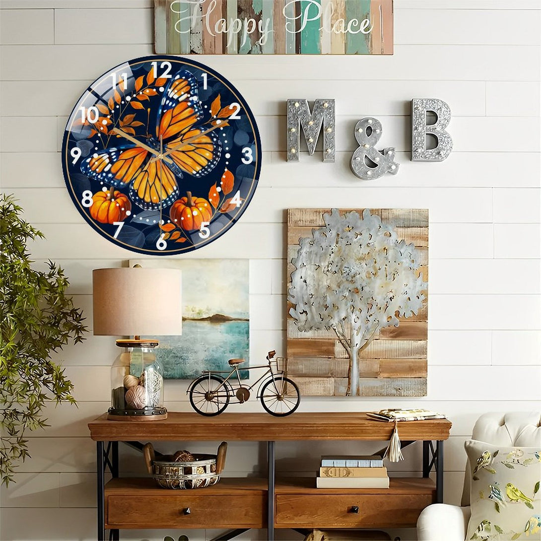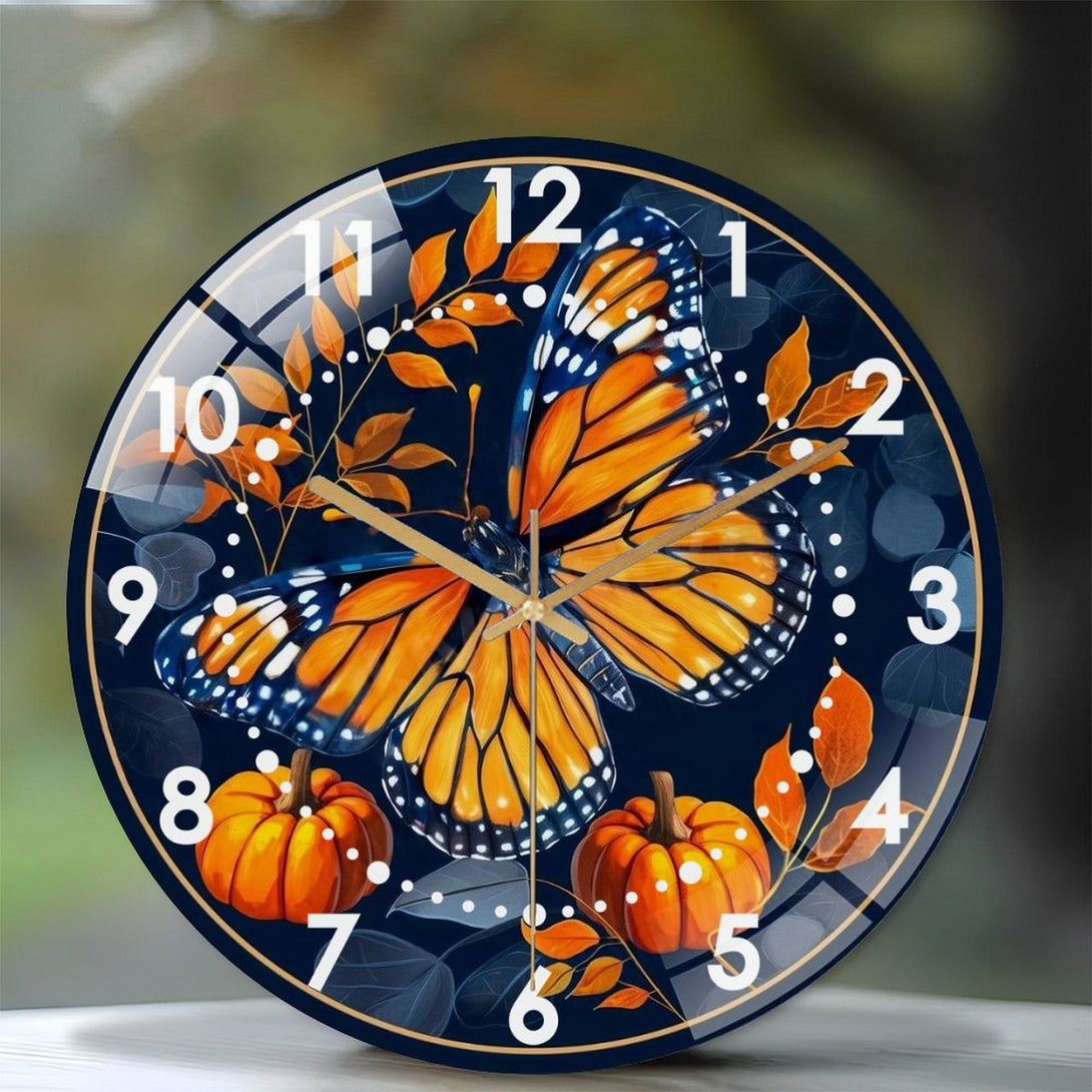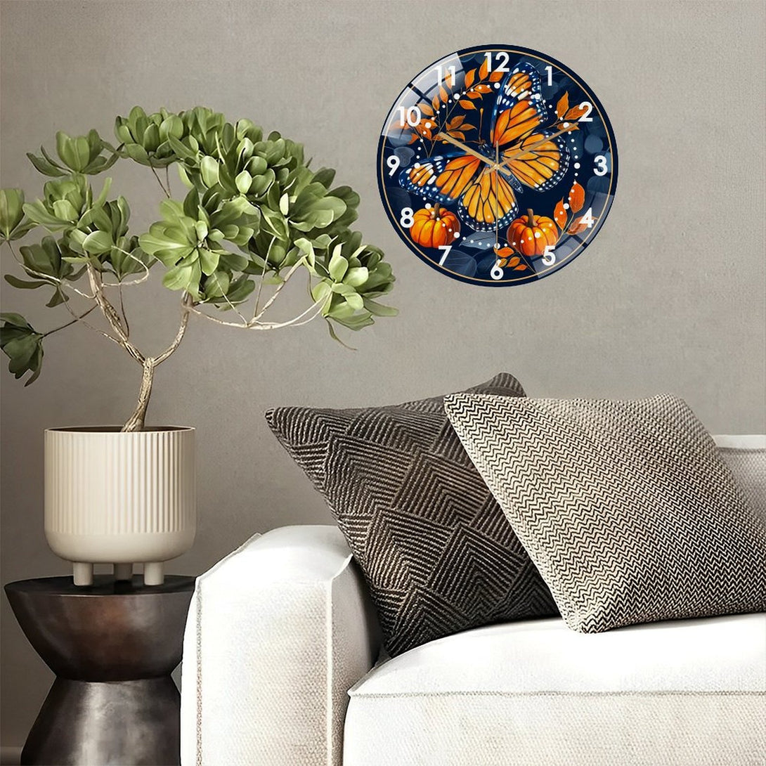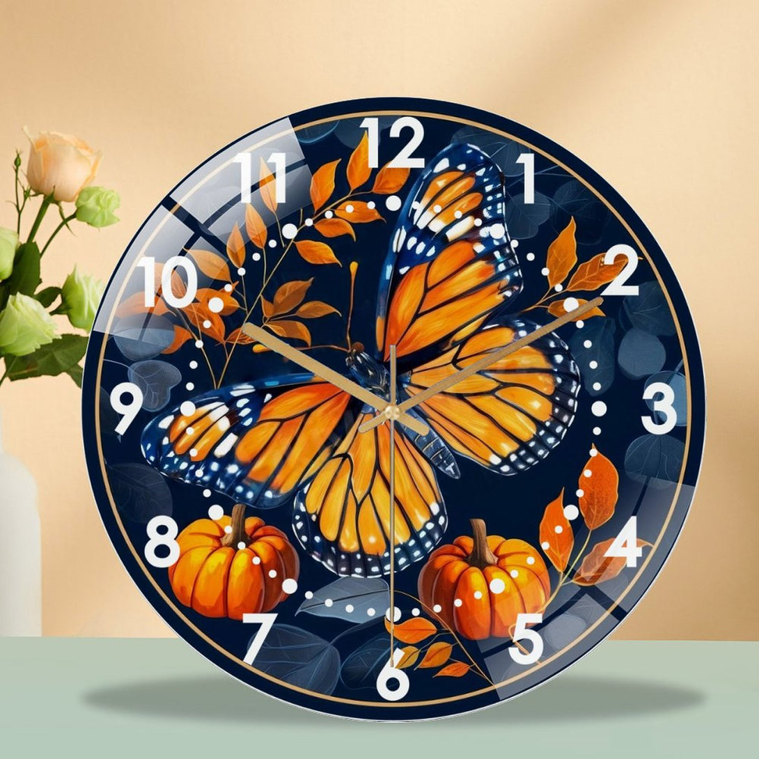 Decor Wall Clock: Fall Butterfly Pumpkin Glass Wall Clock,Butterfly Decor Wall Clock for Homes, Bars, Offices, Man Caves, Garages, And Living Rooms .Also Makes A Great Gift.