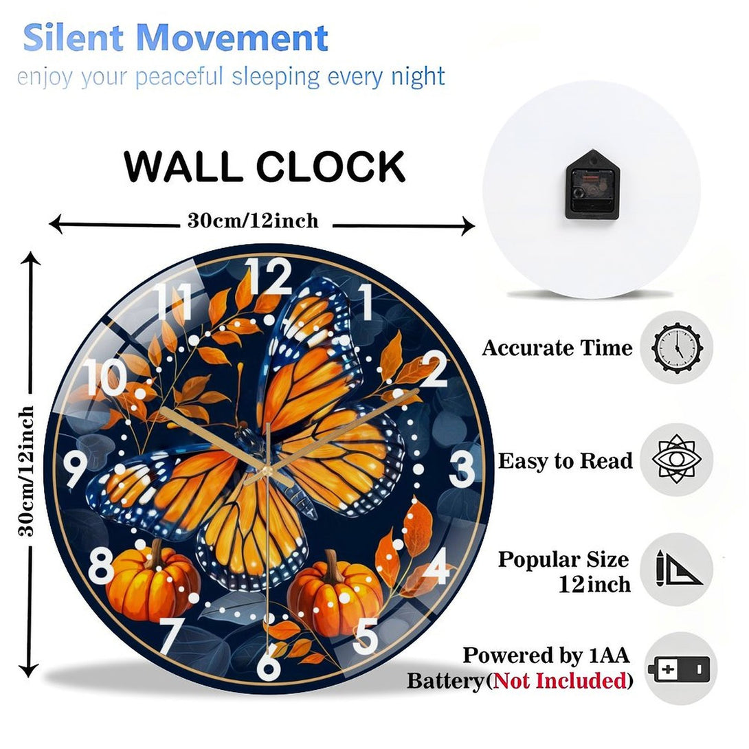 Fall Butterfly Pumpkin Glass Wall Clock,Butterfly Decor Wall Clock for Homes, Bars, Offices, Man Caves, Garages, And Living Rooms .Also Makes A Great Gift.,12×12inch(30×30cm)