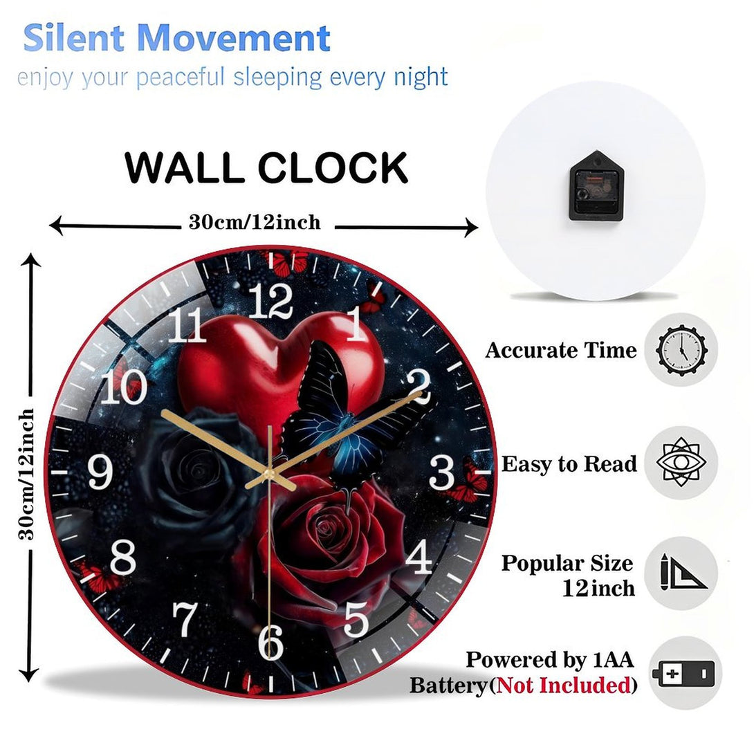Gothic Butterfly, Heart And Rose Glass Wall Clock, Valentine Red Rose Wall Clock for Homes, Bars, Offices, Man Caves, Garages, And Living Rooms .Also Makes A Great Gift.,12×12inch(30×30cm)