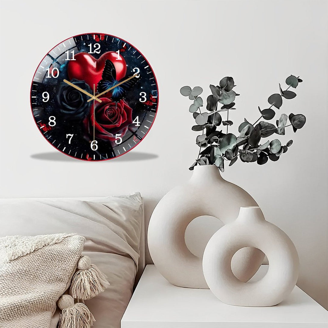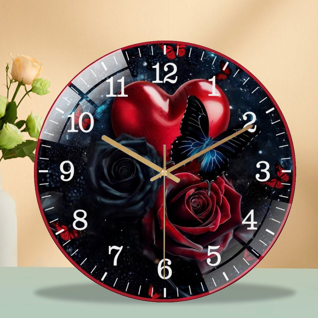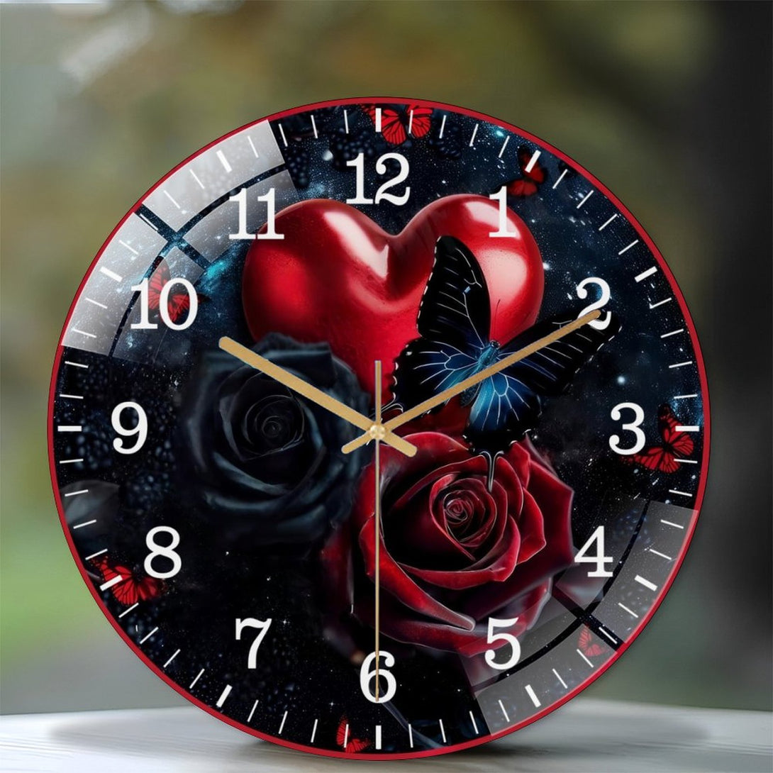 Decor Wall Clock: Gothic Butterfly, Heart And Rose Glass Wall Clock, Valentine Red Rose Wall Clock for Homes, Bars, Offices, Man Caves, Garages, And Living Rooms .Also Makes A Great Gift.