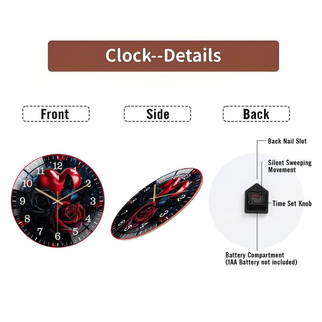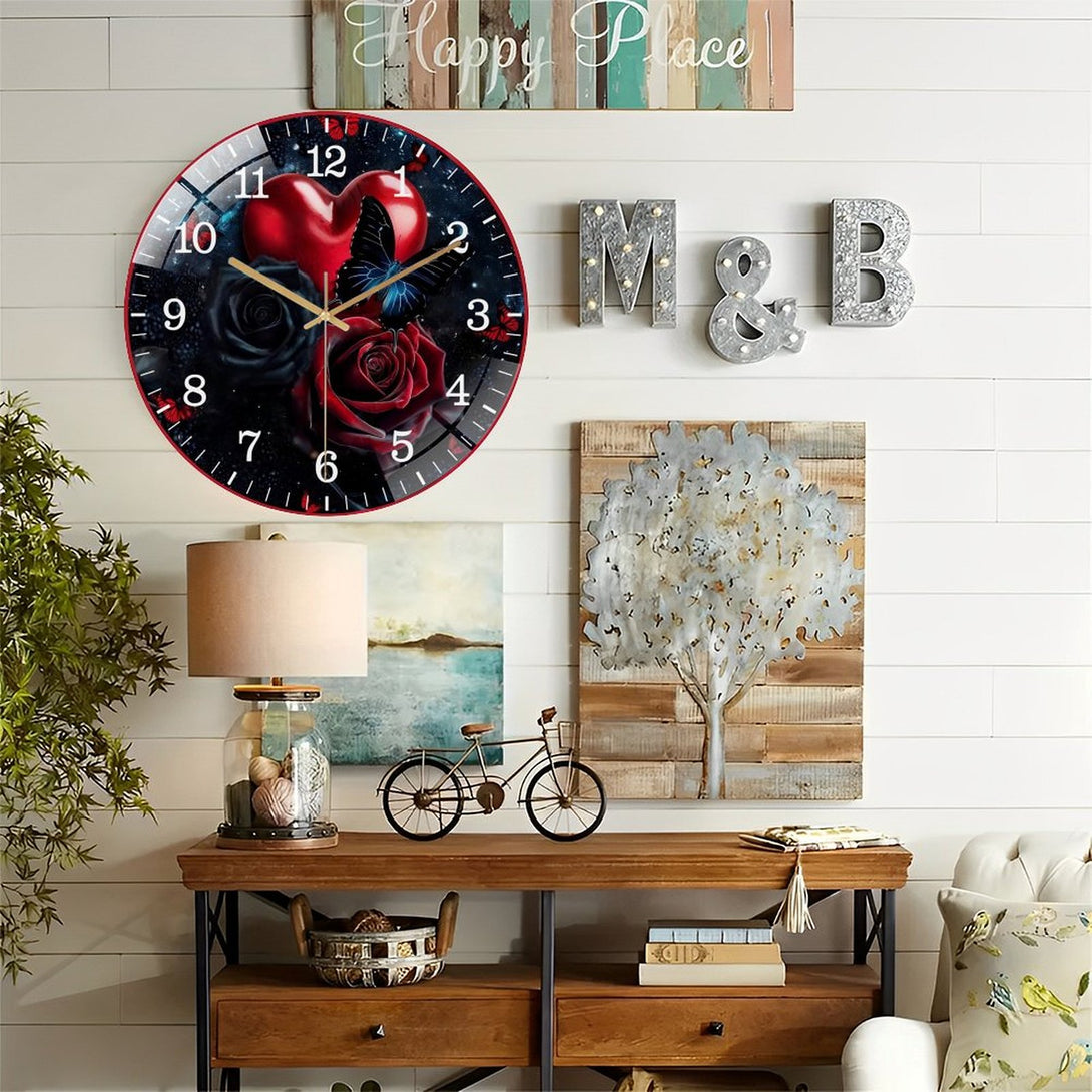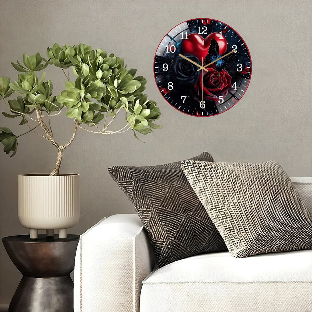 Decor Wall Clock: Gothic Butterfly, Heart And Rose Glass Wall Clock, Valentine Red Rose Wall Clock for Homes, Bars, Offices, Man Caves, Garages, And Living Rooms .Also Makes A Great Gift.