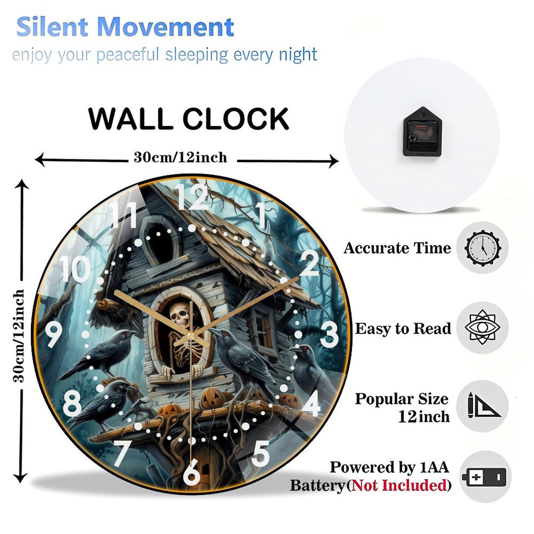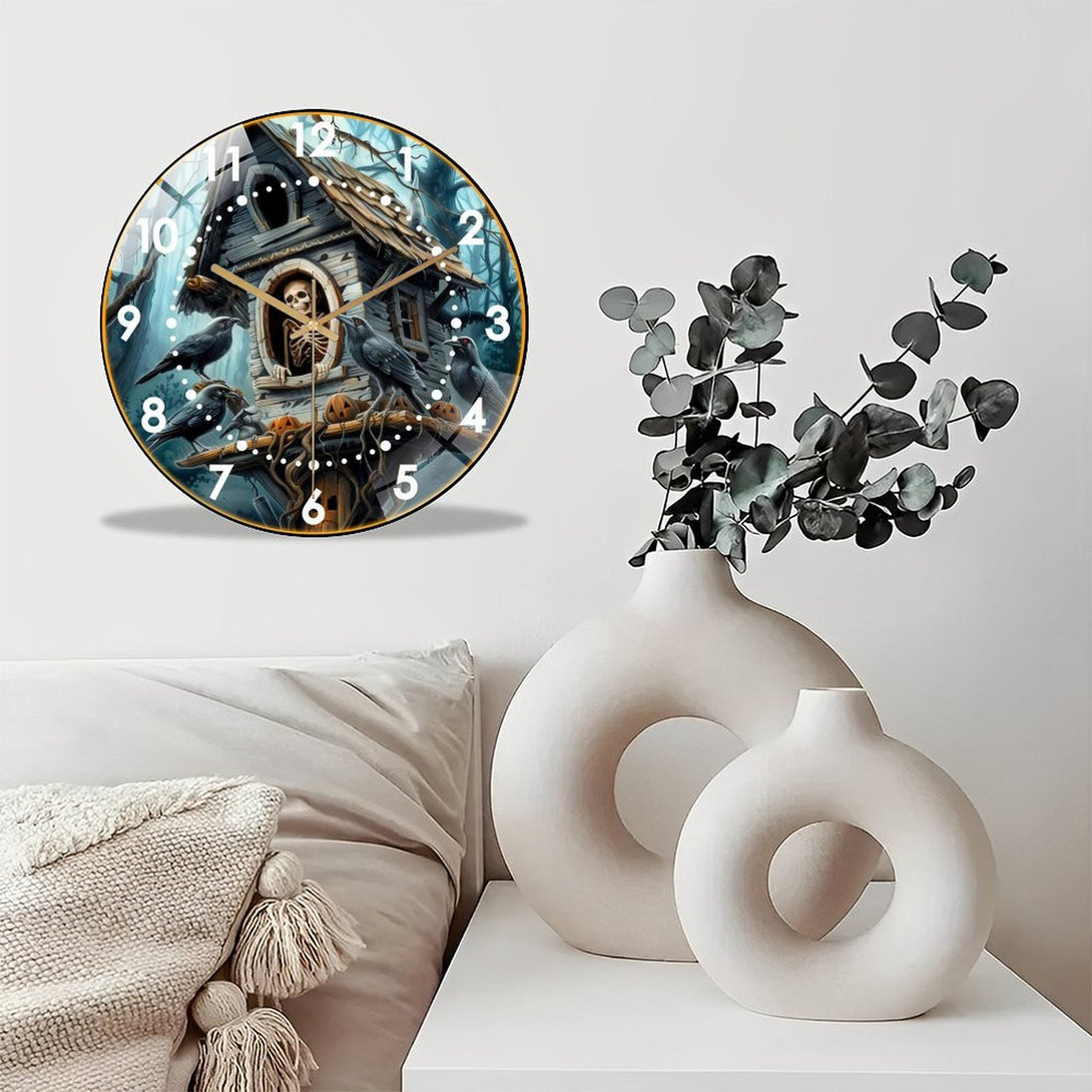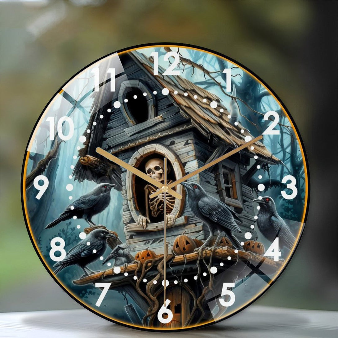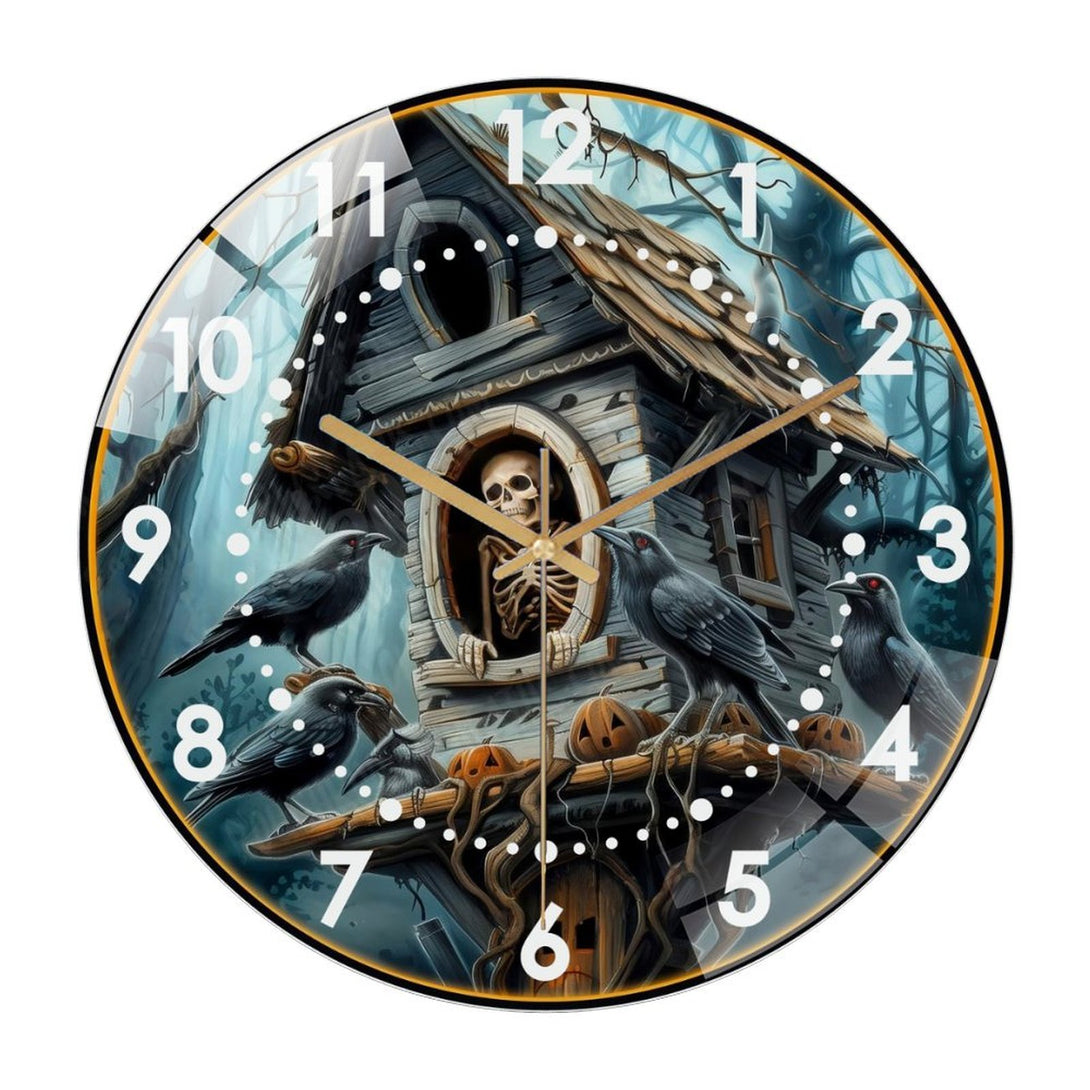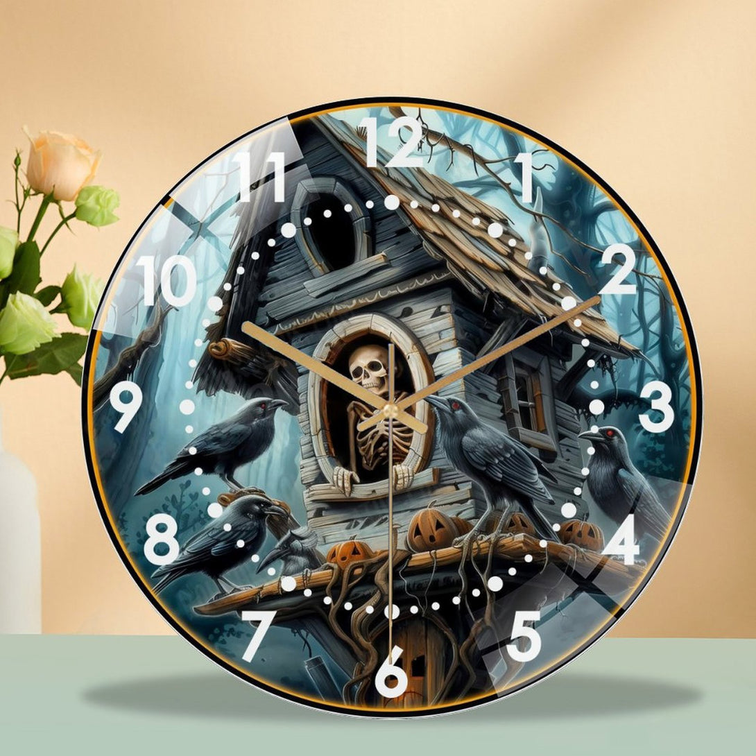 Hallo-ween SkeletonGlass Wall Clock, Raven Wall Clock for Homes, Bars, Offices, Man Caves, Garages, And Living Rooms .Also Makes A Great Gift.,12×12inch(30×30cm)