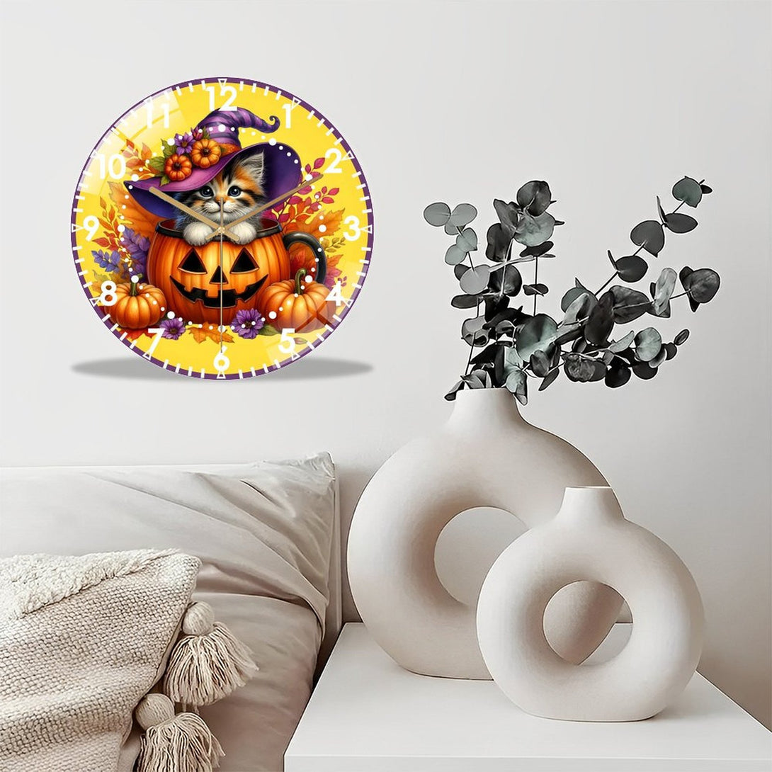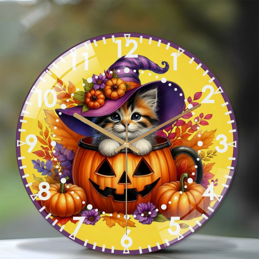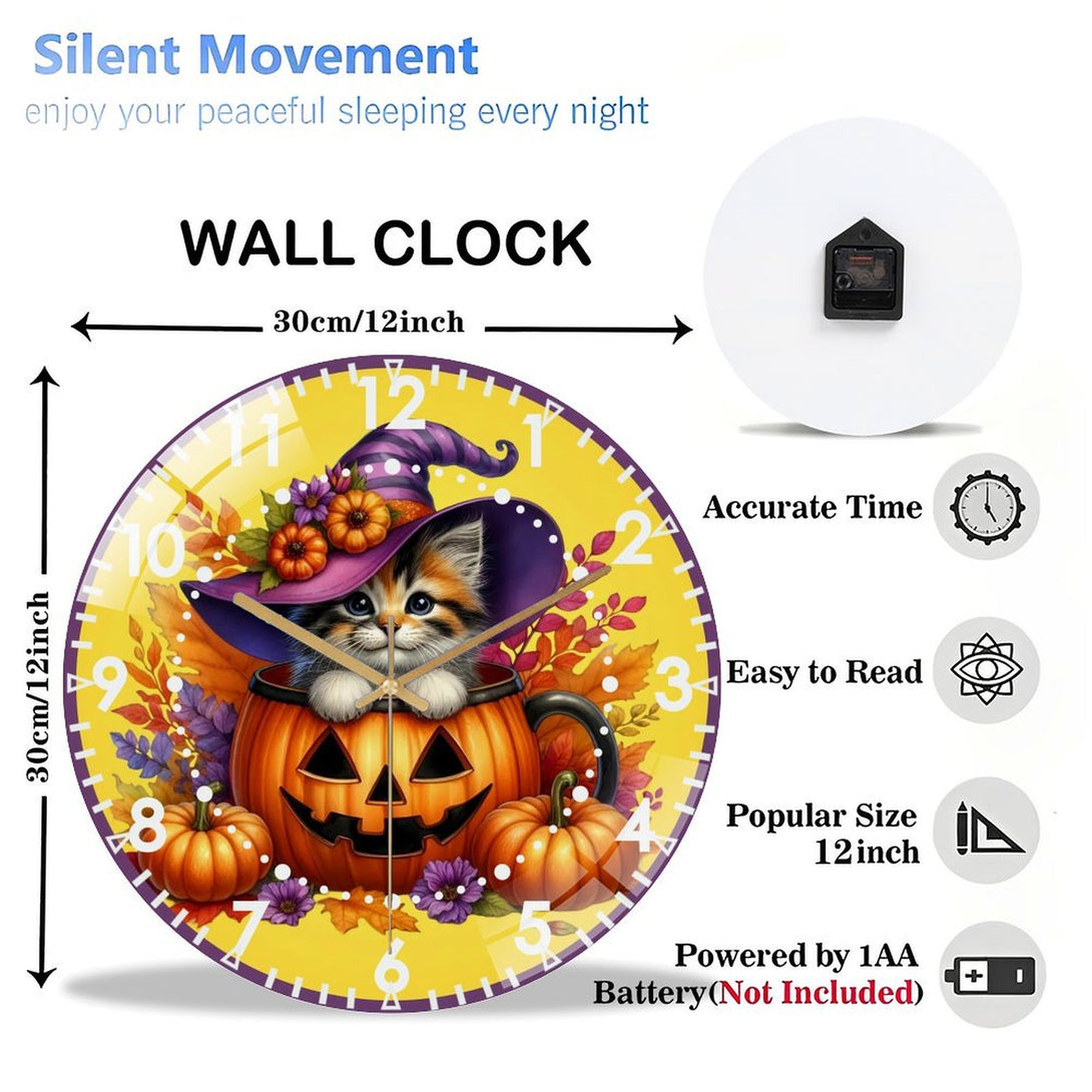 Halloween- Kitten Glass Wall Clock, Whimsical Pumpkin Cat Decor Wall Clock for Homes, Bars, Offices, Man Caves, Garages, And Living Rooms .Also Makes A Great Gift.,12×12inch(30×30cm)