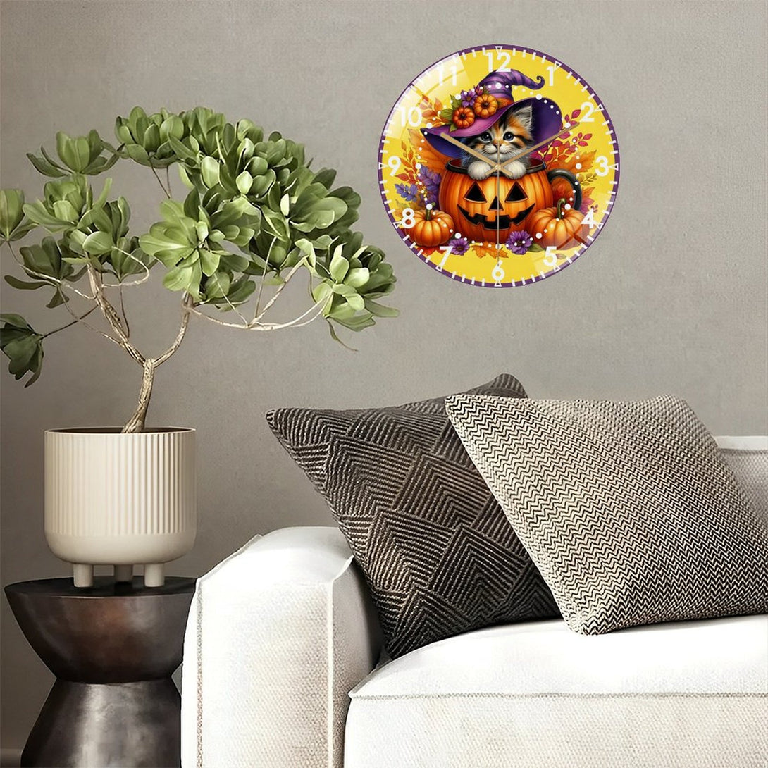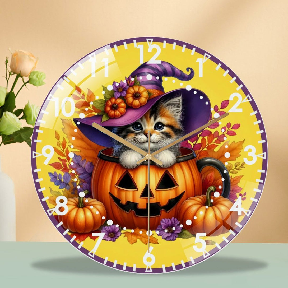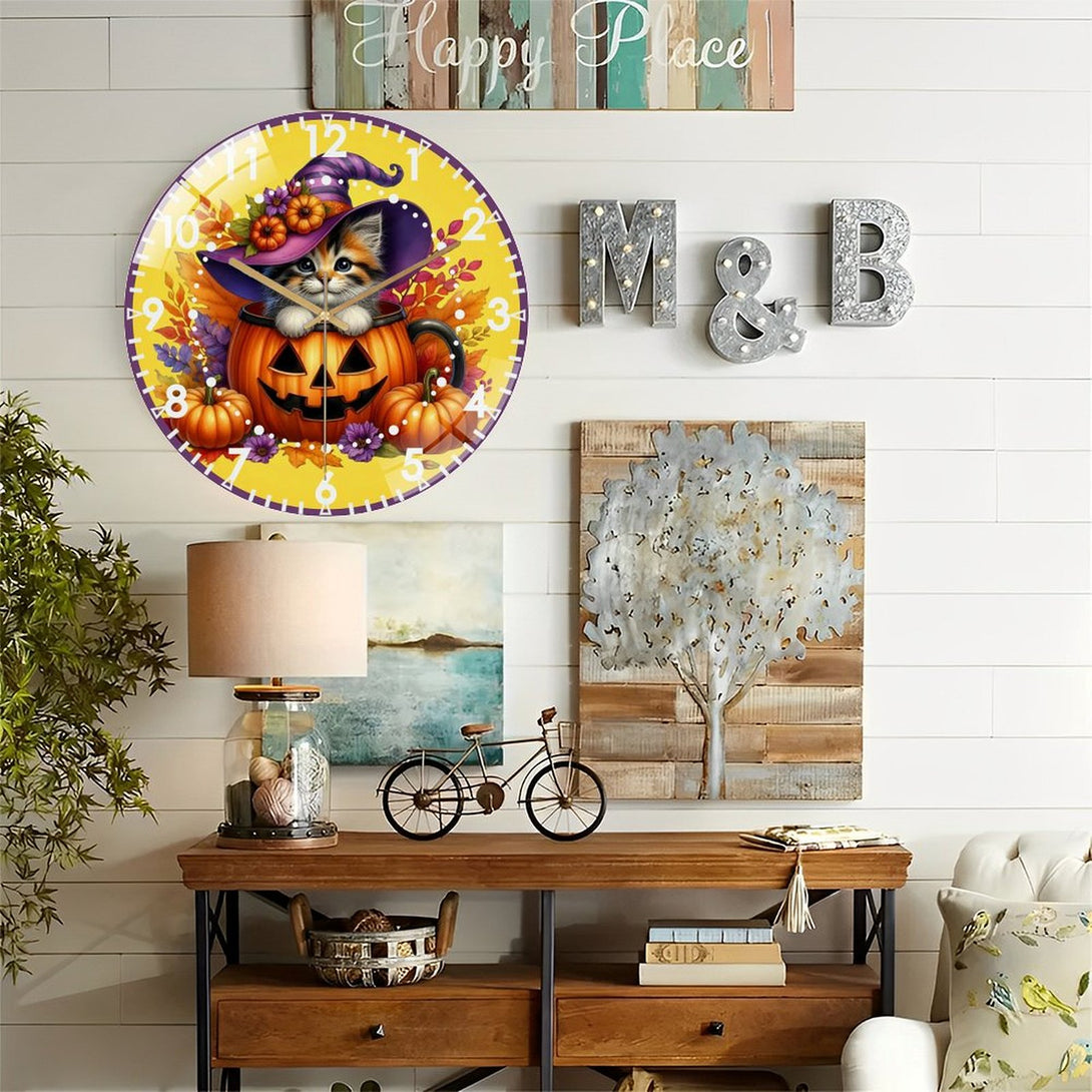 Halloween- Kitten Glass Wall Clock, Whimsical Pumpkin Cat Decor Wall Clock for Homes, Bars, Offices, Man Caves, Garages, And Living Rooms .Also Makes A Great Gift.,12×12inch(30×30cm)