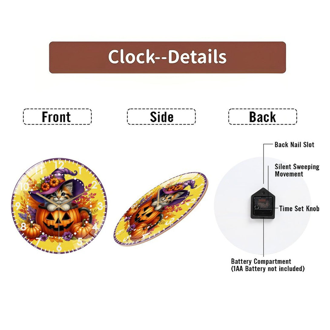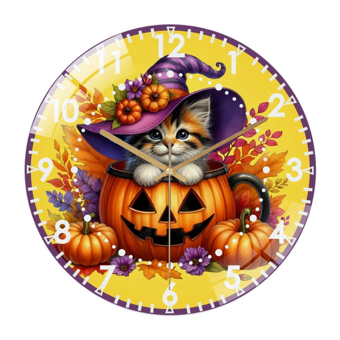 Decor Wall Clock: Halloween- Kitten Glass Wall Clock, Whimsical Pumpkin Cat Decor Wall Clock for Homes, Bars, Offices, Man Caves, Garages, And Living Rooms .Also Makes A Great Gift.