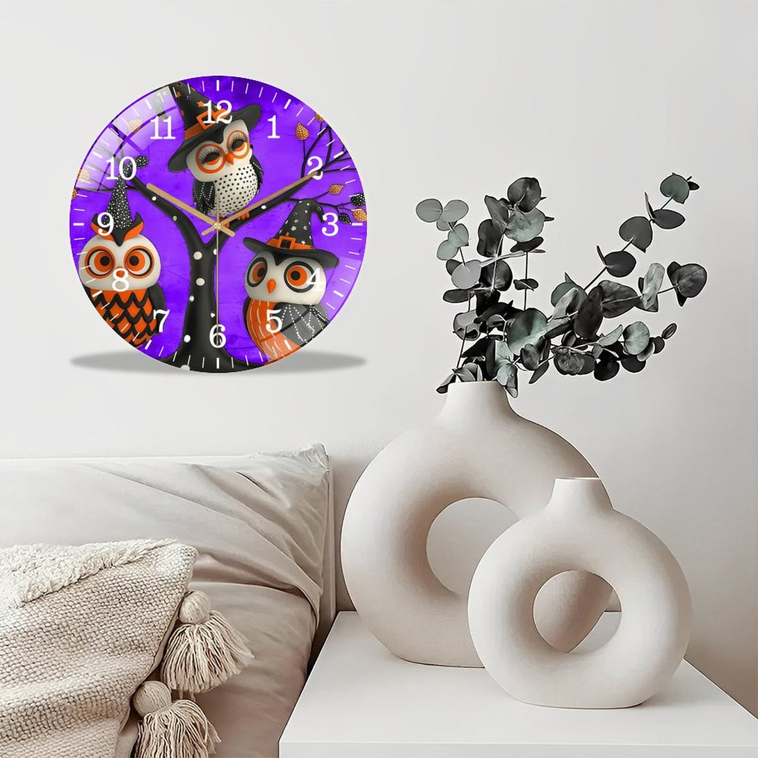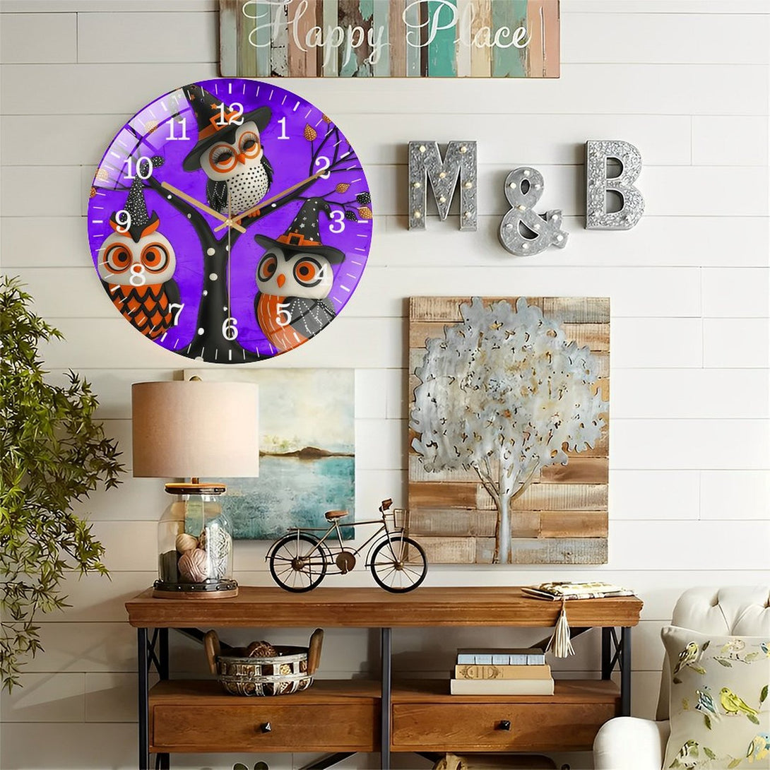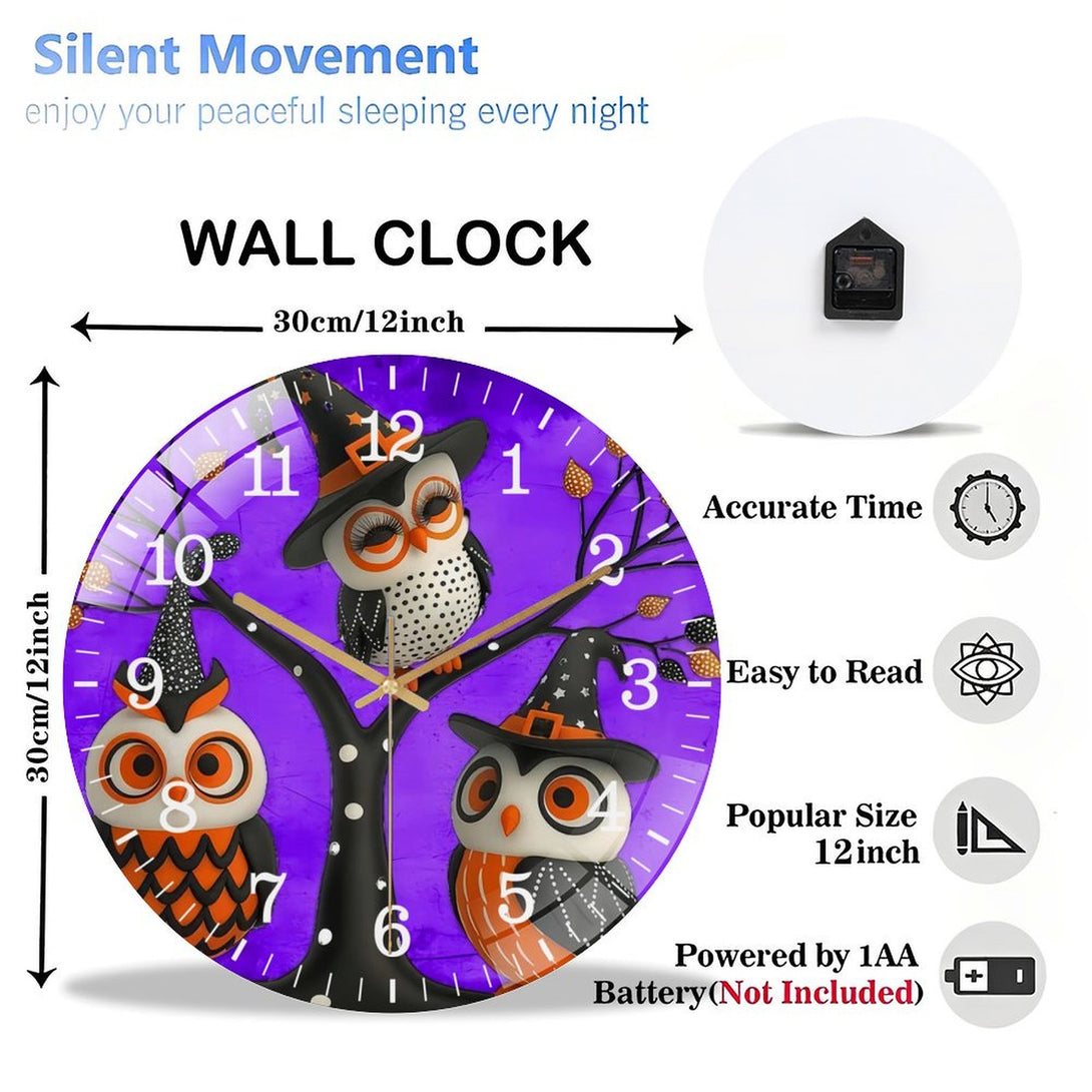 Halloween- Owl Glass Wall Clock, Witch Owls Fall Wall Decor Or Ornamen Decor Wall Clock for Homes, Bars, Offices, Man Caves, Garages, And Living Rooms .Also Makes A Great Gift.,12×12inch(30×30cm)