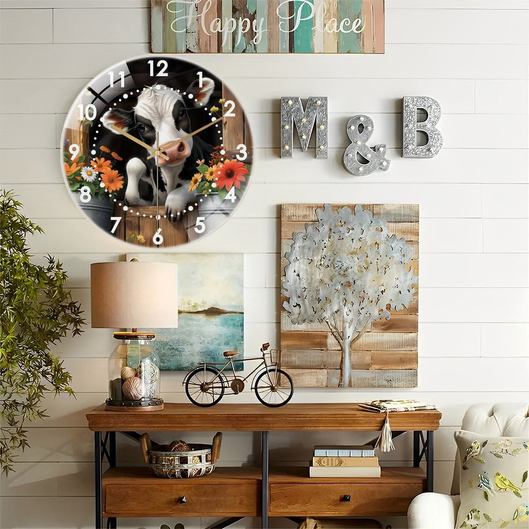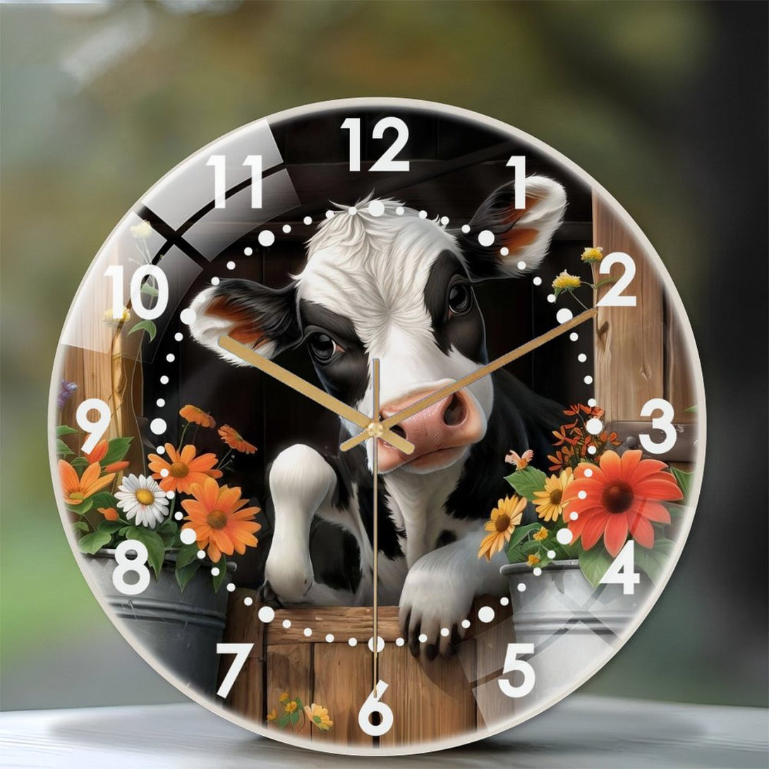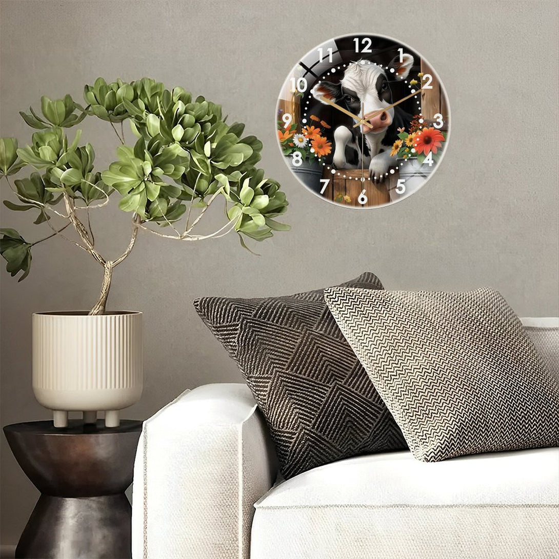Decor Wall Clock: Holstein Cow Glass Wall Clock, Cow Decor Wall Clock for Homes, Bars, Offices, Man Caves, Garages, And Living Rooms .Also Makes A Great Gift. Style 12×12inch(30×30cm)