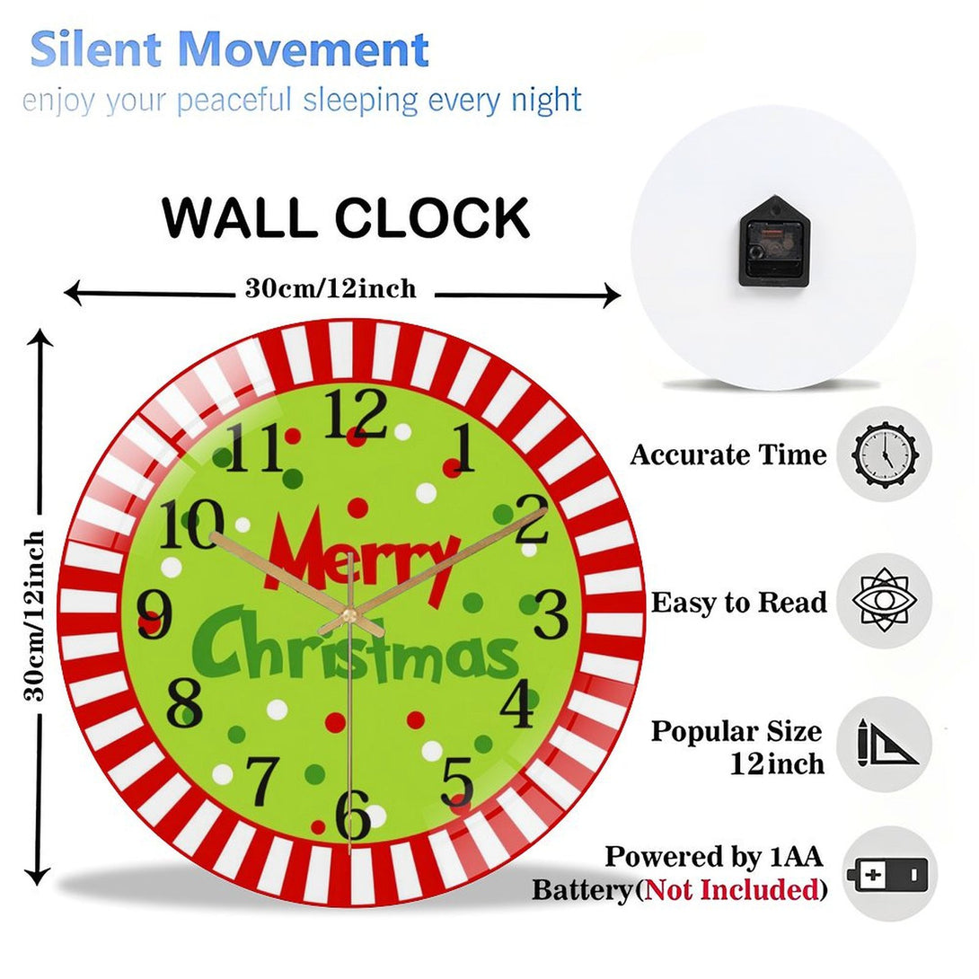 Red And Green Merry Christmas Glass Wall Clock,Merry Christmas Decor Wall Clock for Homes, Bars, Offices, Man Caves, Garages, And Living Rooms .Also Makes A Great Gift.,12×12inch(30×30cm)