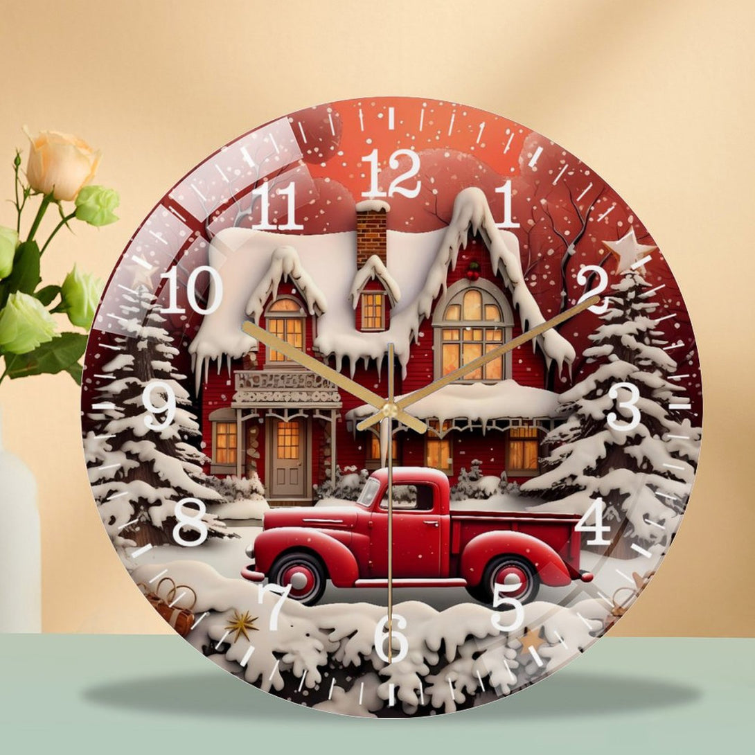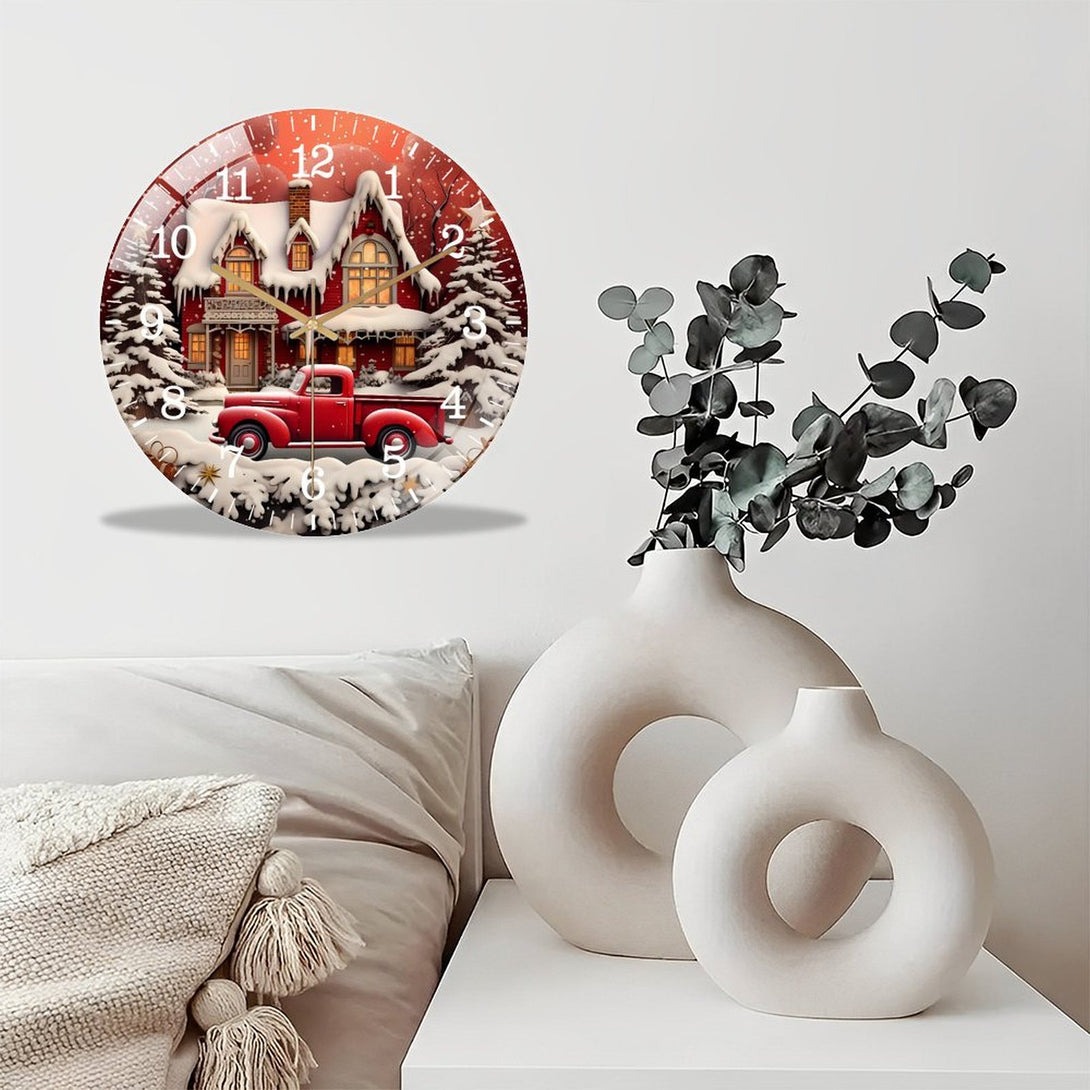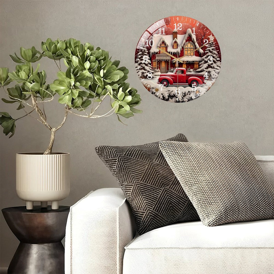 Decor Wall Clock: Red Truck Christmas Glass Wall Clock, Christmas Decor Wall Clock for Homes, Bars, Offices, Man Caves, Garages, And Living Rooms .Also Makes A Great Gift.
