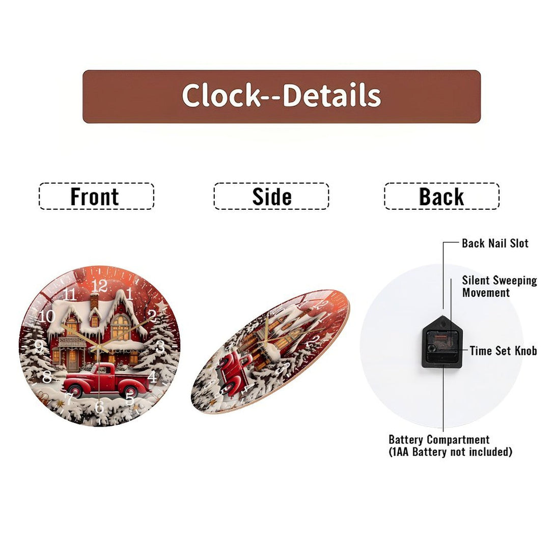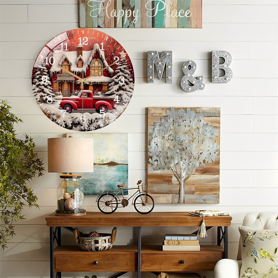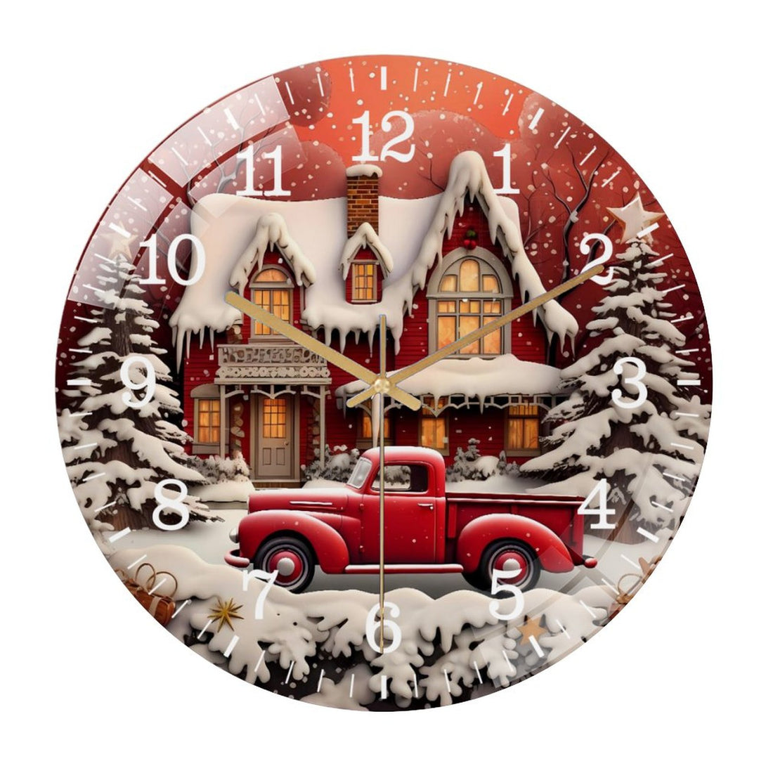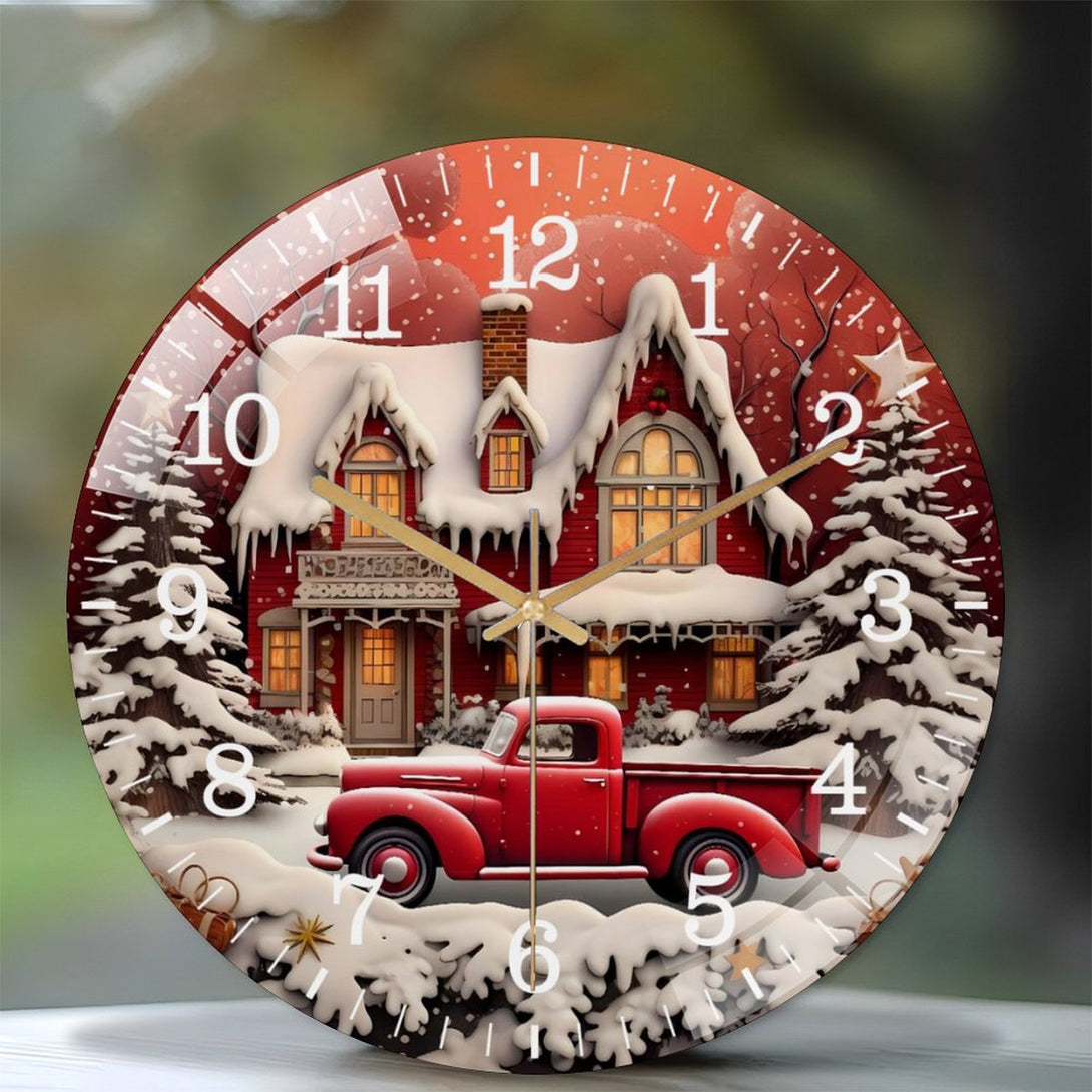 Decor Wall Clock: Red Truck Christmas Glass Wall Clock, Christmas Decor Wall Clock for Homes, Bars, Offices, Man Caves, Garages, And Living Rooms .Also Makes A Great Gift.
