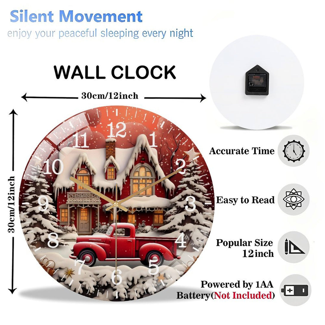 Red Truck Christmas Glass Wall Clock, Christmas Decor Wall Clock for Homes, Bars, Offices, Man Caves, Garages, And Living Rooms .Also Makes A Great Gift.,12×12inch(30×30cm)
