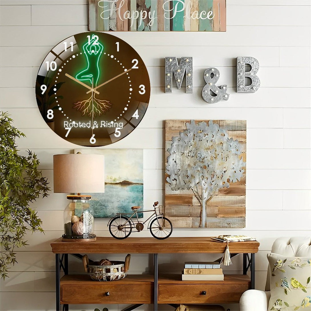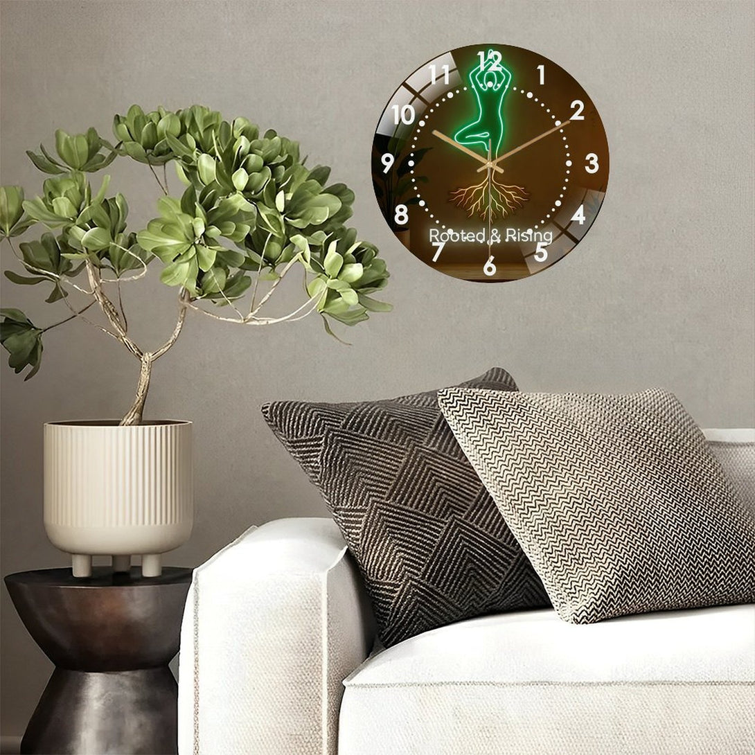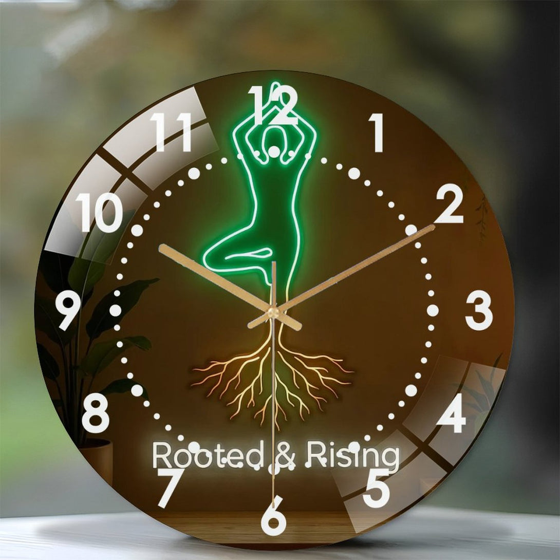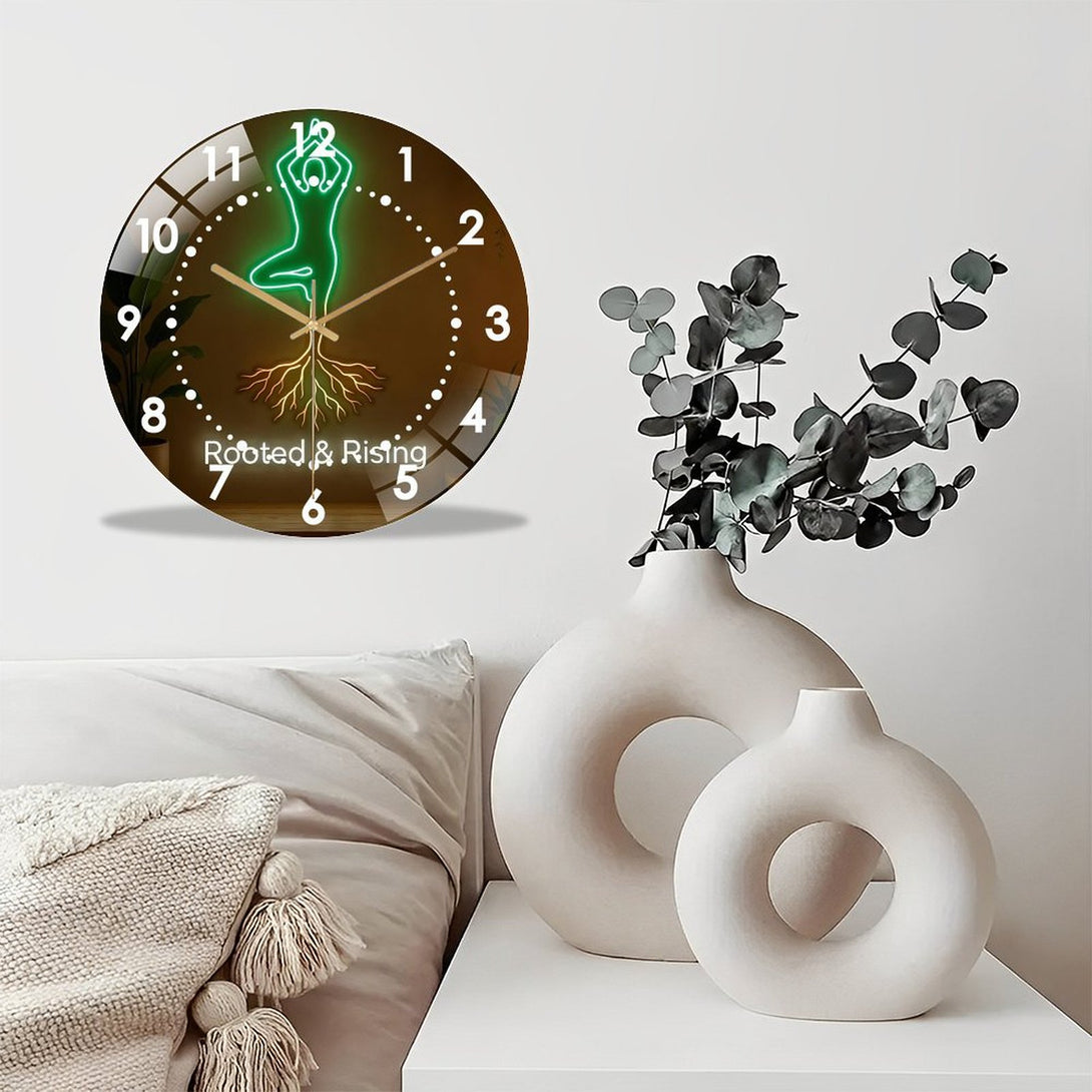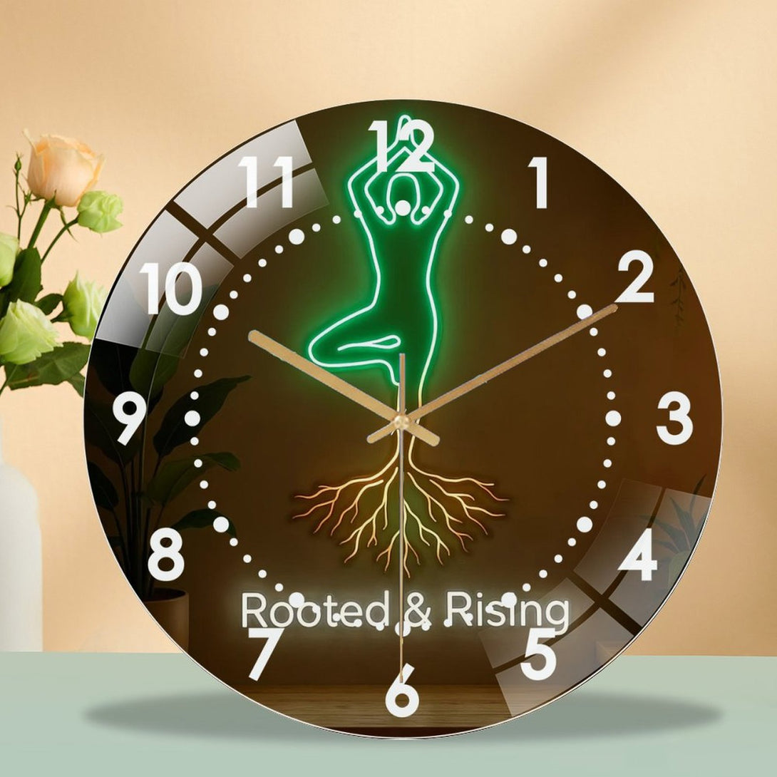 Decor Wall Clock: Rooted & Rising Yoga Glass Wall Clock– Spiritual And MindfulnessGlass Wall Clock for Haunted House & Party Decor for Homes, Bars, Offices, Man Caves, Garages, And Living Rooms