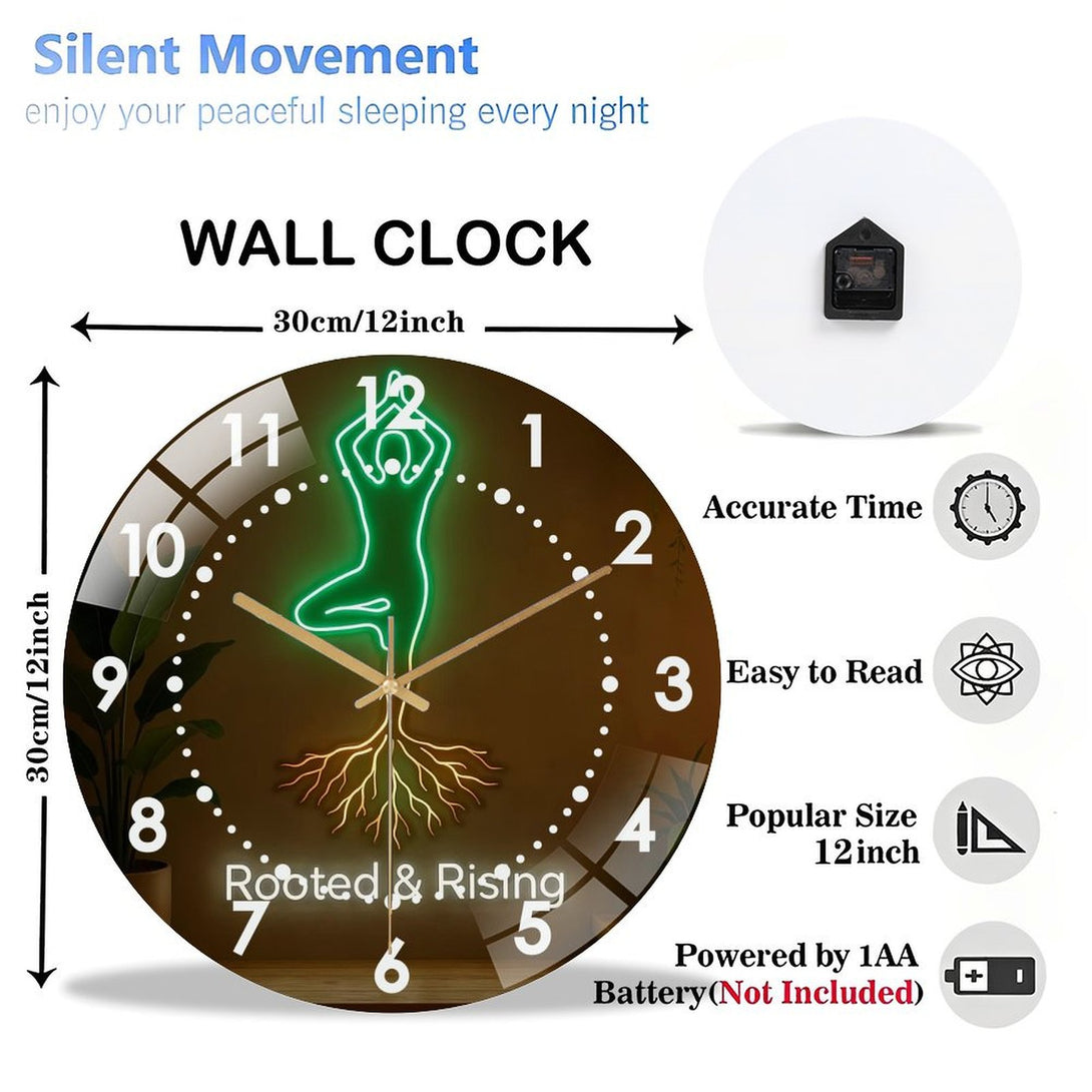 Rooted & Rising Yoga Glass Wall Clock– Spiritual And MindfulnessGlass Wall Clock for Haunted House & Party Decor for Homes, Bars, Offices, Man Caves, Garages, And Living Rooms .Also Makes A Great,12×12inch(30×30cm)