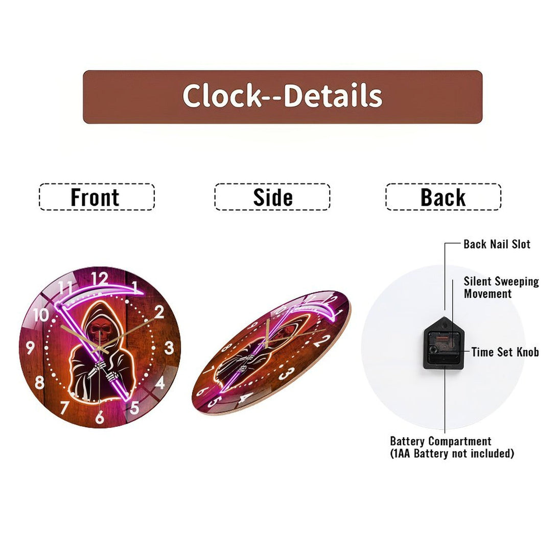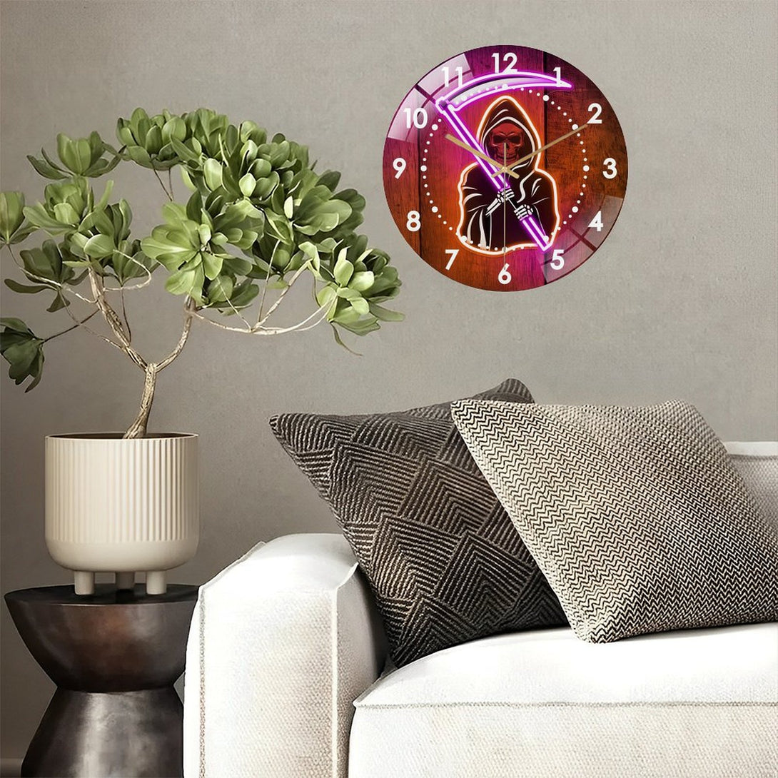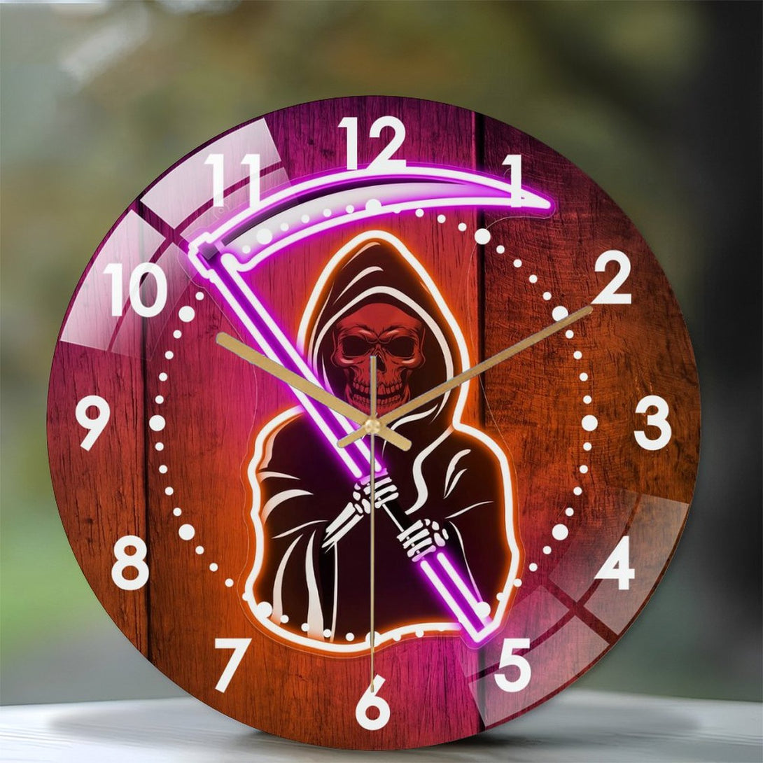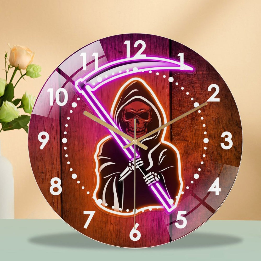 Decor Wall Clock: Skull Decor Hallo-ween Glass Wall Clock– Skeleton Wall Art Grim Reaper Halloween Decor Wall Clock for Haunted House & Party Decor for Homes, Bars, Offices, Man Caves, Garages