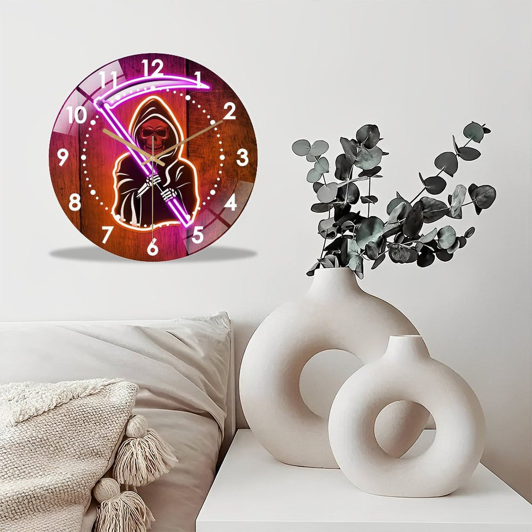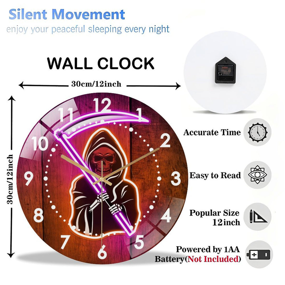 Skull Decor Hallo-ween Glass Wall Clock– Skeleton Wall Art Grim Reaper Halloween Decor Wall Clock for Haunted House & Party Decor for Homes, Bars, Offices, Man Caves, Garages, And Living Rooms,12×12inch(30×30cm)