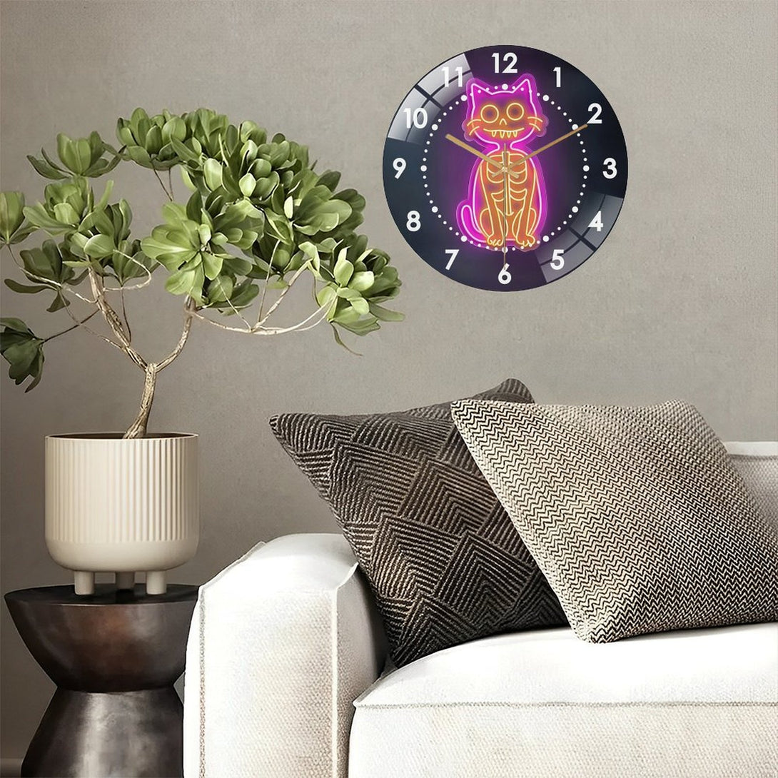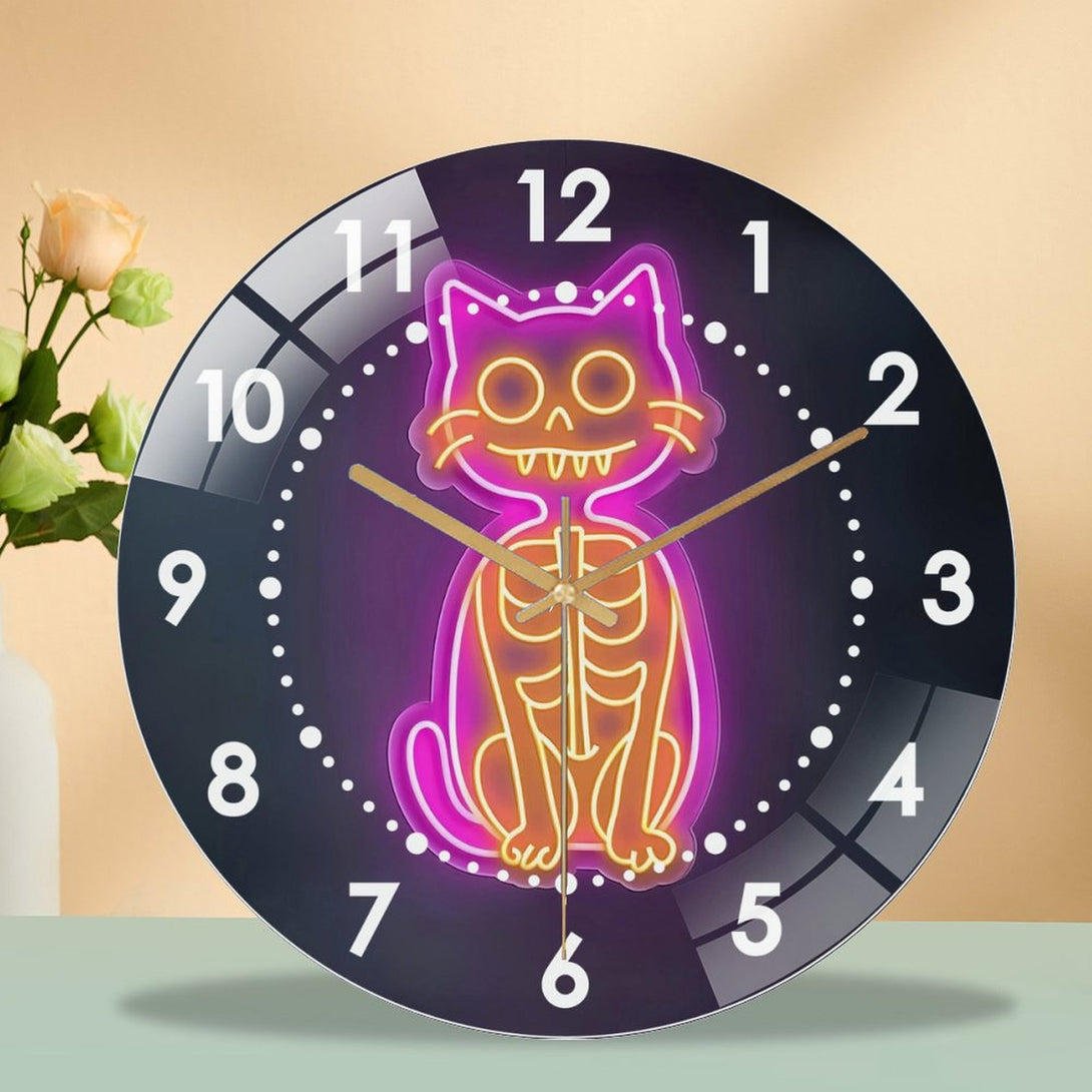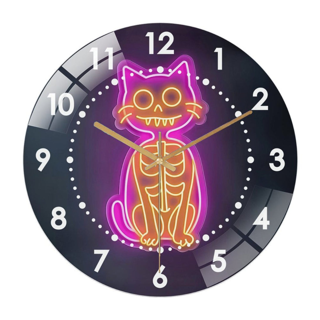 Spooky Skeleton Cat Glass Wall Clock– Fun Kitten Hallo-ween Wall Clock for Home Decor Wedding Gift Decor. Man Cave Hanging Door Housewarming Hall-oween Gift,12×12inch(30×30cm)